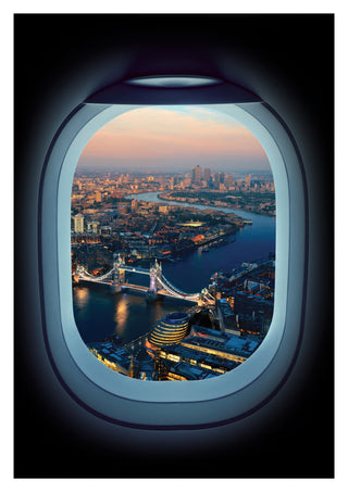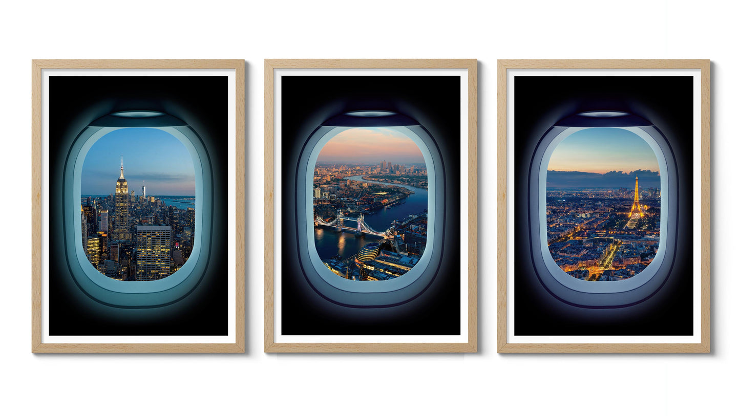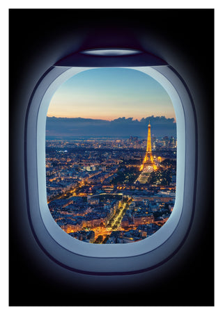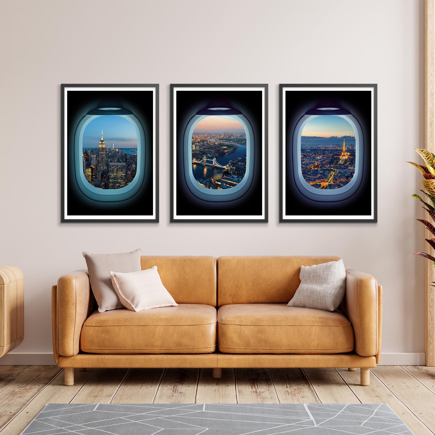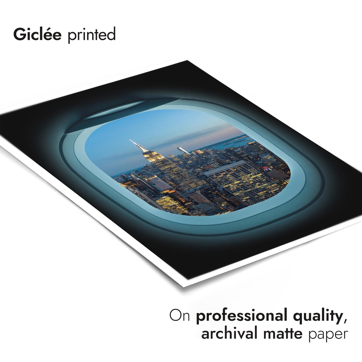 The "Plane City Views" poster series captures iconic cityscapes from an airplane perspective. Featuring New York, London, and Paris, each photographic print presents captivating dusk and night views framed by the circular plane window. This travel-themed artwork in grey, blue, and yellow tones is perfect for enthusiasts of global landmarks and aviation, adding a touch of wanderlust to any space.