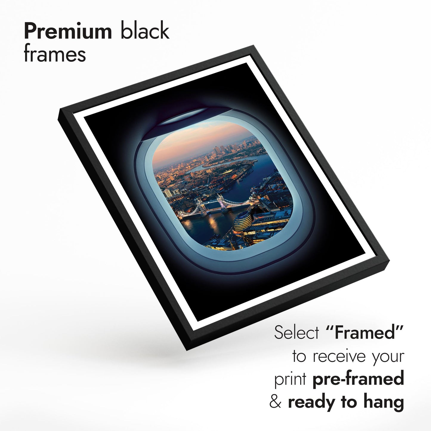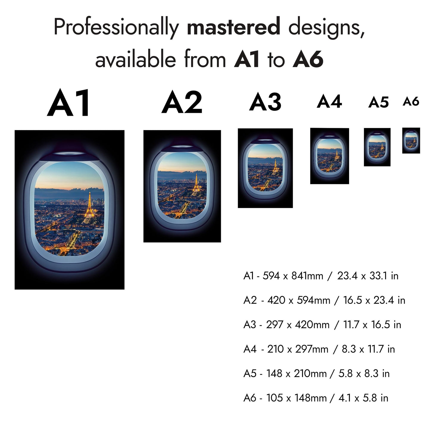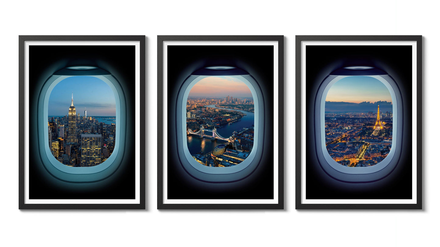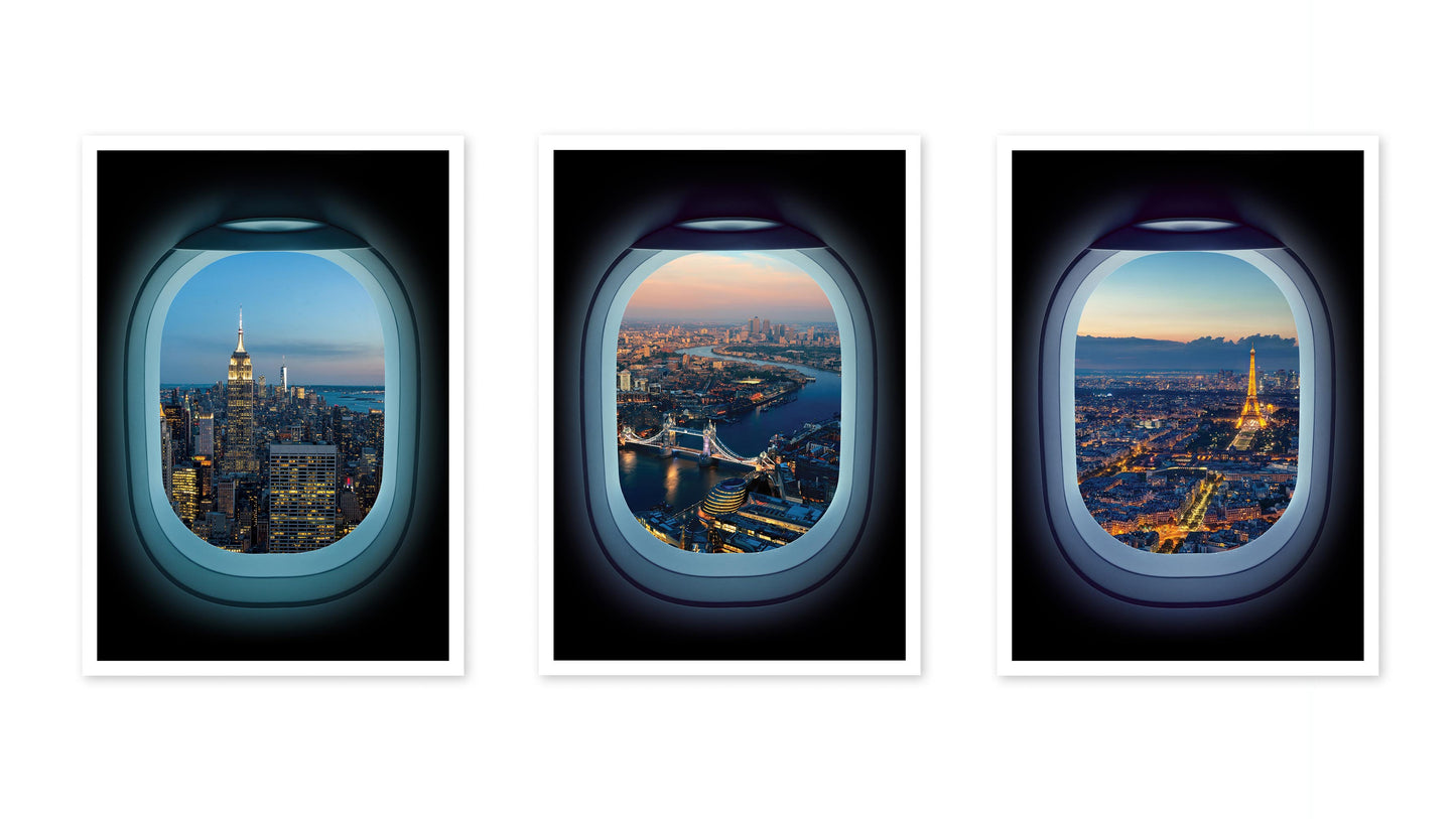 The "Plane City Views" poster series captures iconic cityscapes from an airplane perspective. Featuring New York, London, and Paris, each photographic print presents captivating dusk and night views framed by the circular plane window. This travel-themed artwork in grey, blue, and yellow tones is perfect for enthusiasts of global landmarks and aviation, adding a touch of wanderlust to any space.