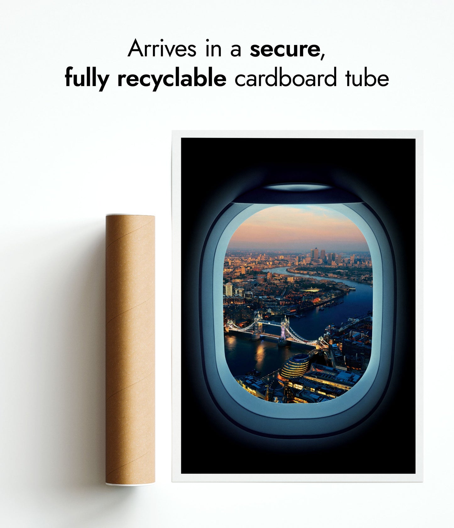 All orders are securely packed in recyclable, eco-friendly solutions. Frames are protected with sustainable bubble wrap alternatives inside thick boxes. Print only orders are shipped in heavy-duty cardboard tubes or protective hard-backed envelopes.