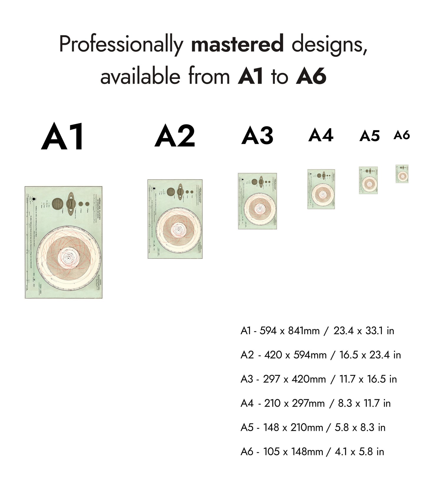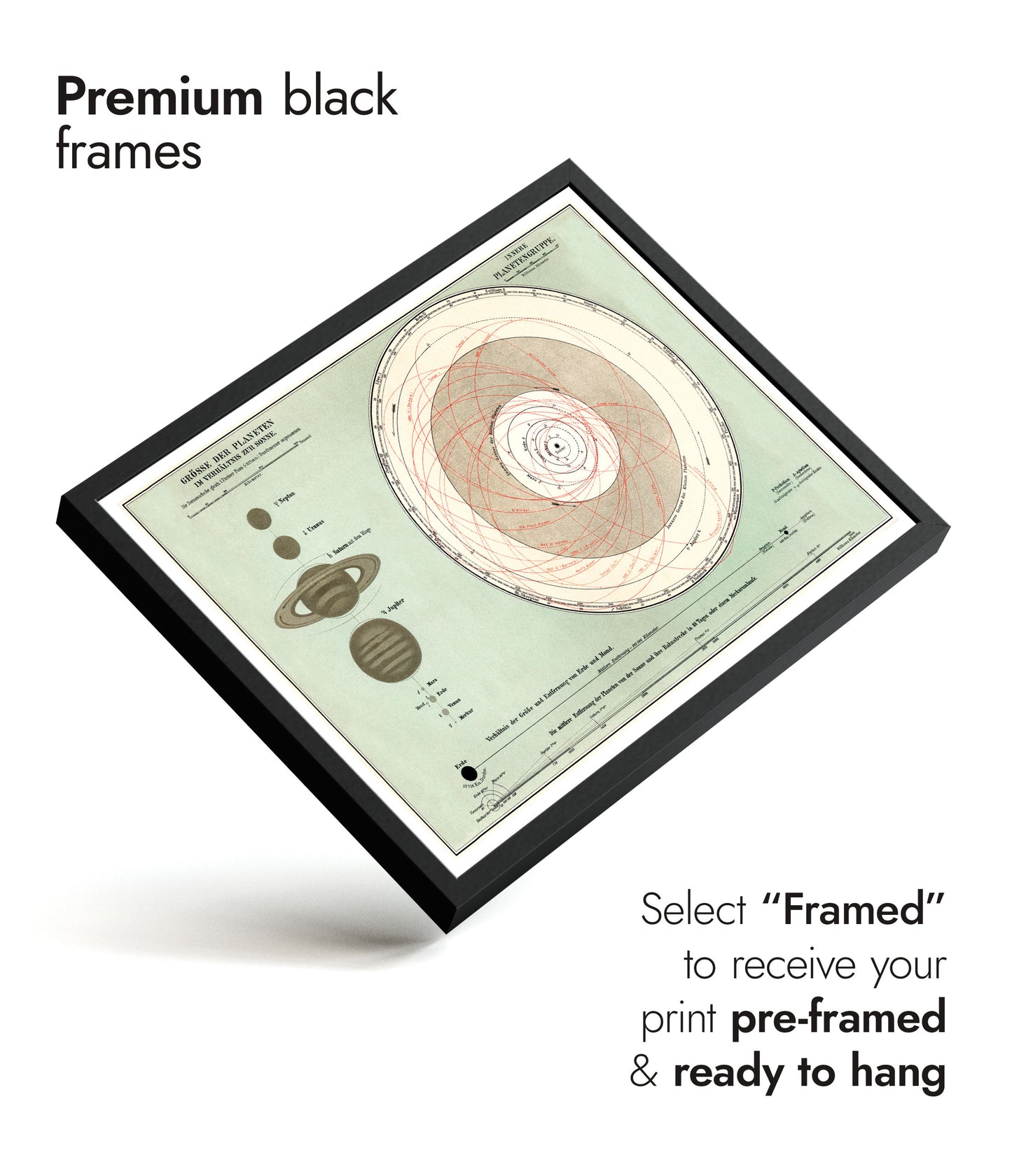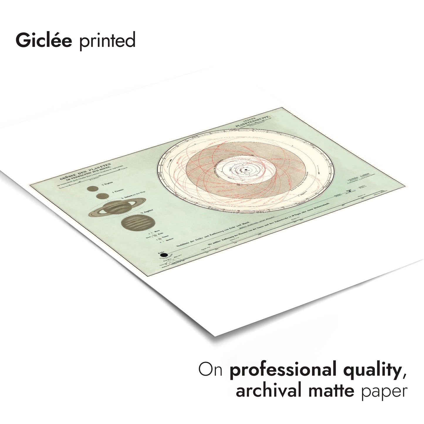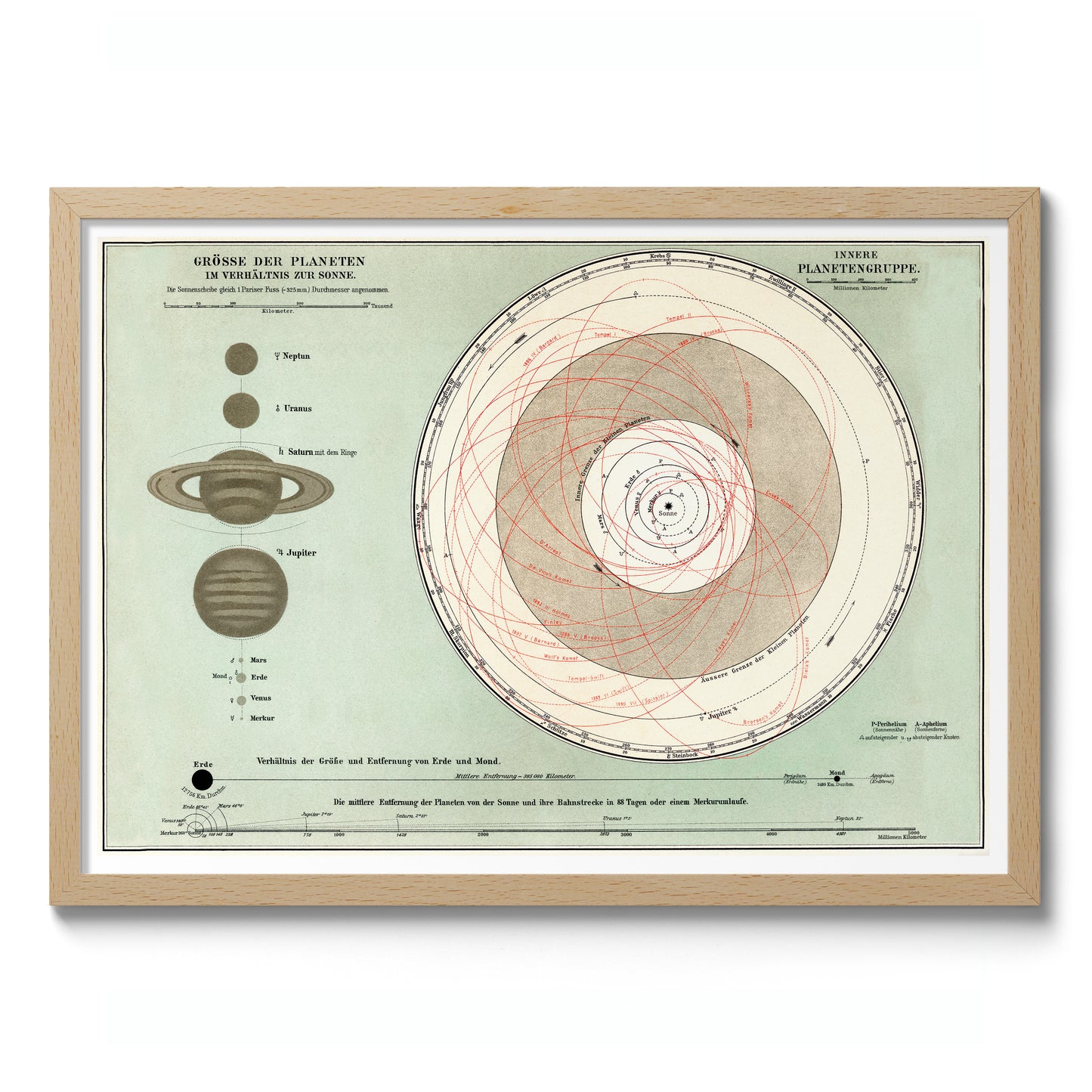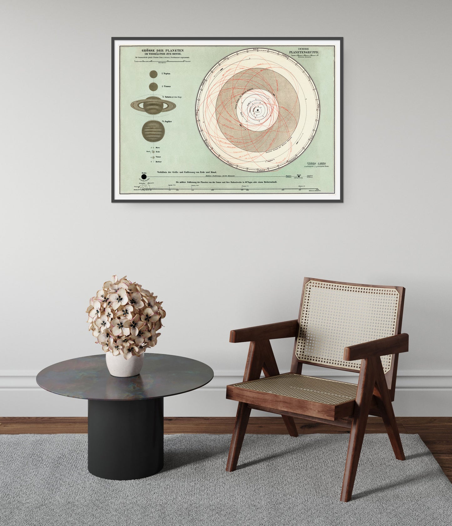 The "Planet System" poster features a vintage schematic of our solar system. Highlighting planetary orbits, sizes, and distances, this detailed illustration captures the essence of astronomical studies. Perfect for space enthusiasts and vintage collectors, this art print blends scientific precision with antique charm. Ideal for adding an educational yet stylish touch to any space-themed decor.