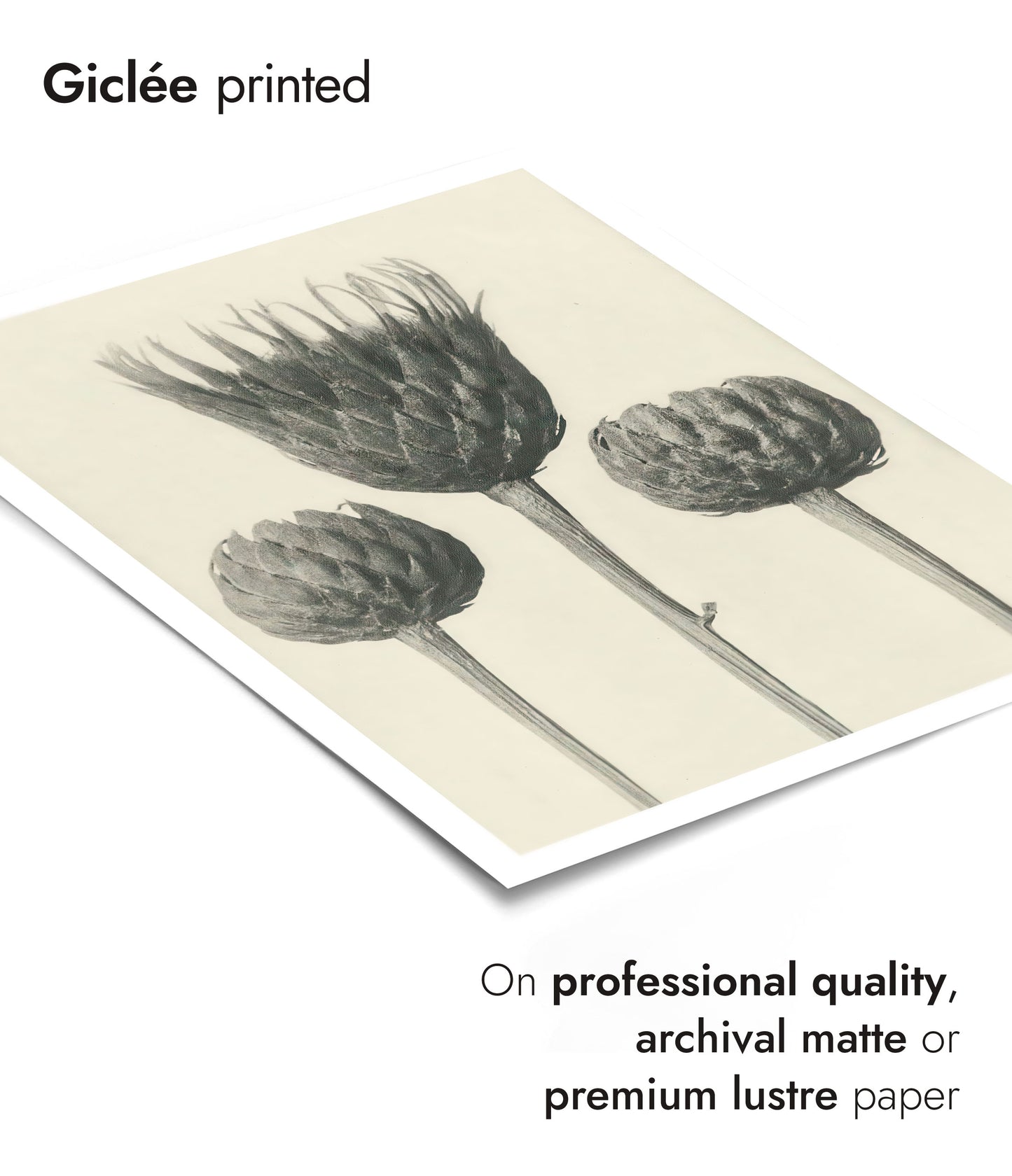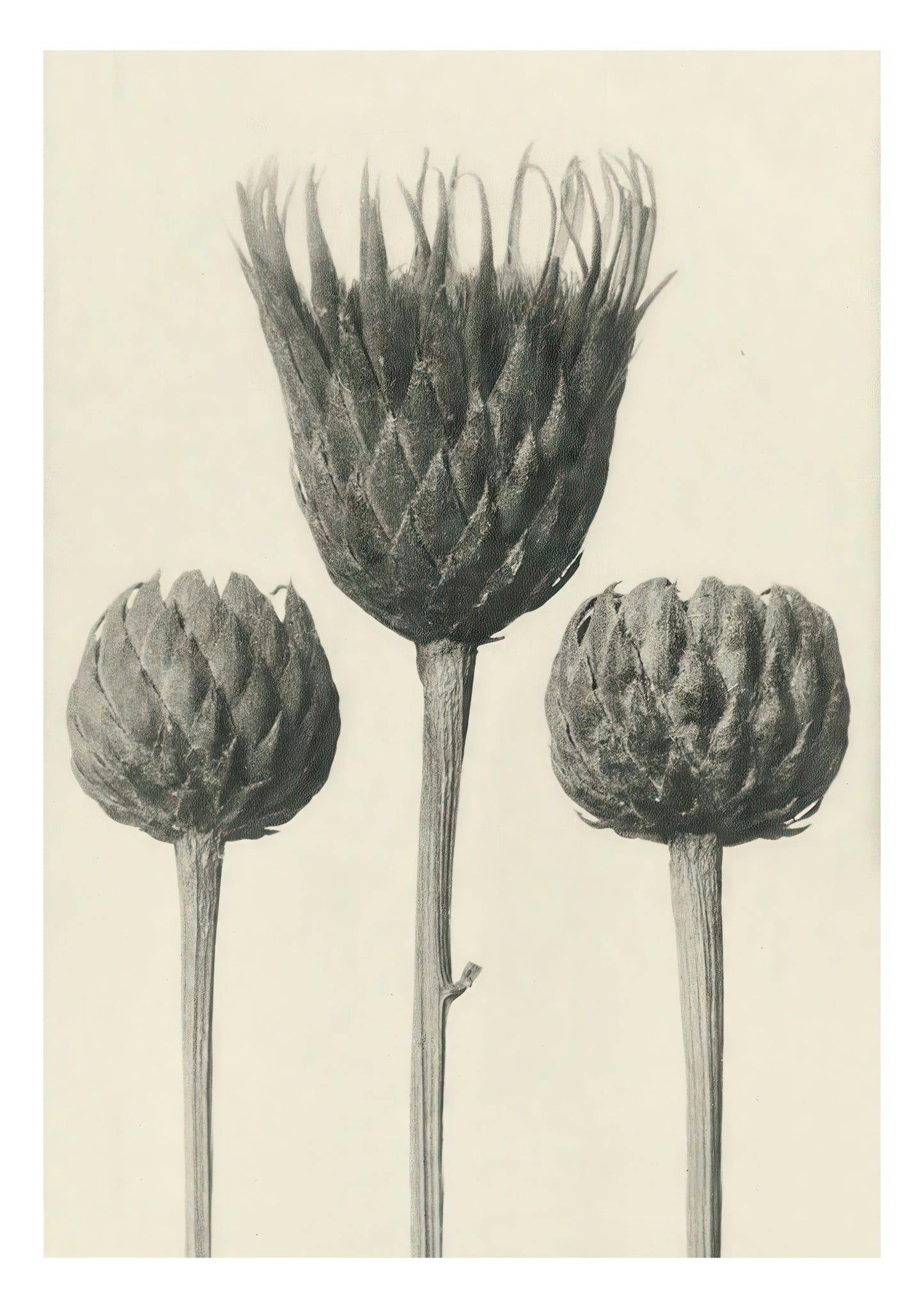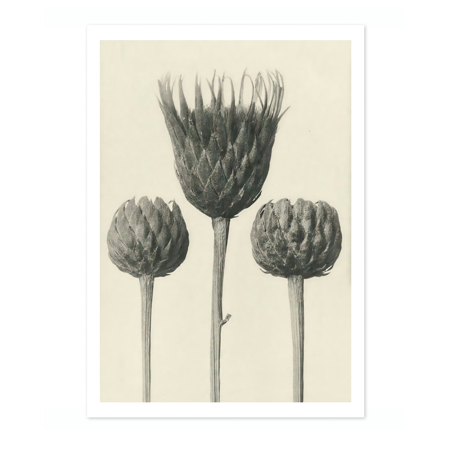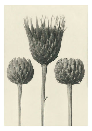 The "Plantstudie 13" poster by Karl Blossfeldt captures an intricate, black-and-white still life of three artichoke blossoms. This vintage photographic artwork highlights the elegant forms and textures of the plants, presenting a timeless piece that celebrates botanical beauty. Ideal for nature and floral photography enthusiasts.
