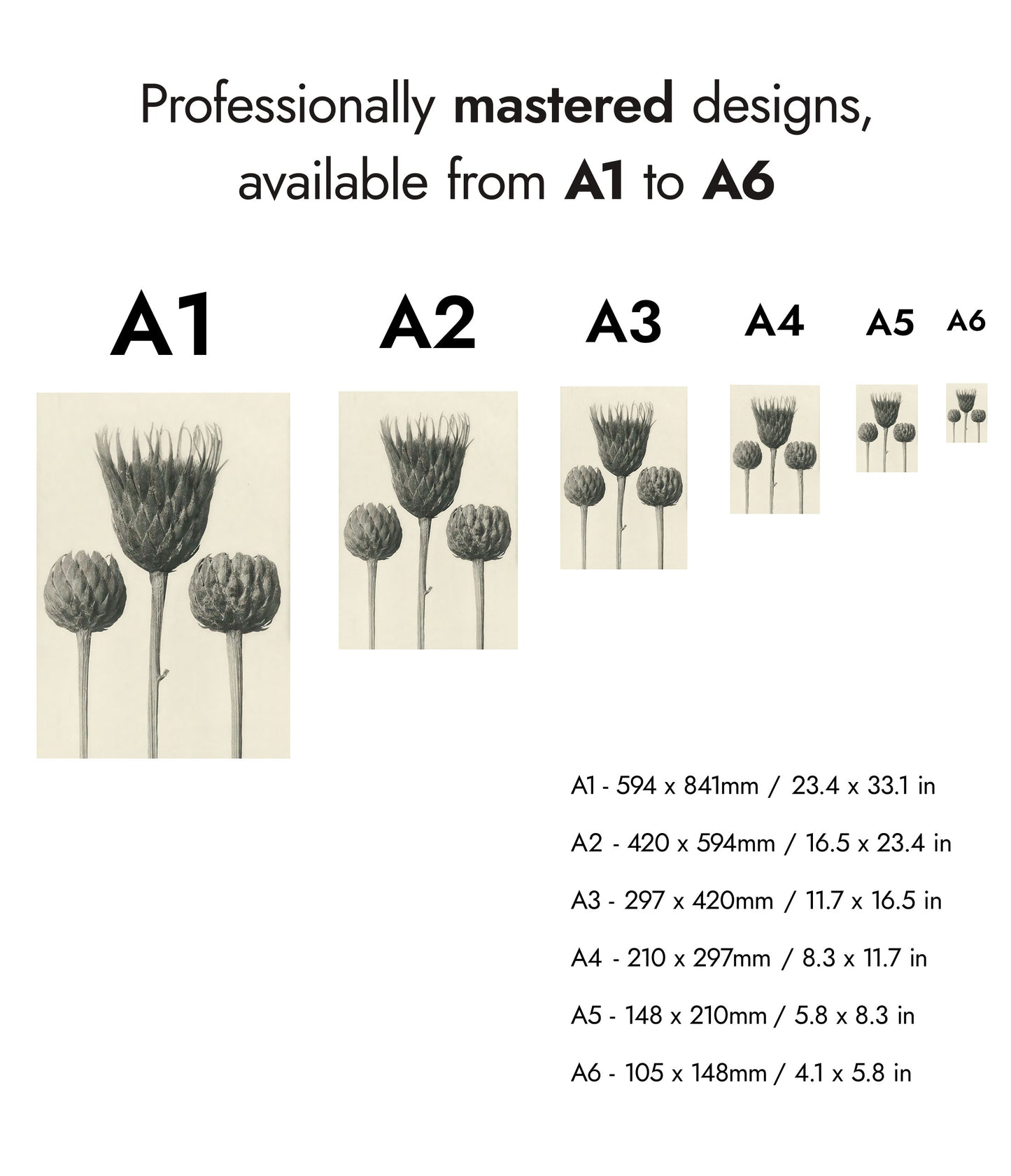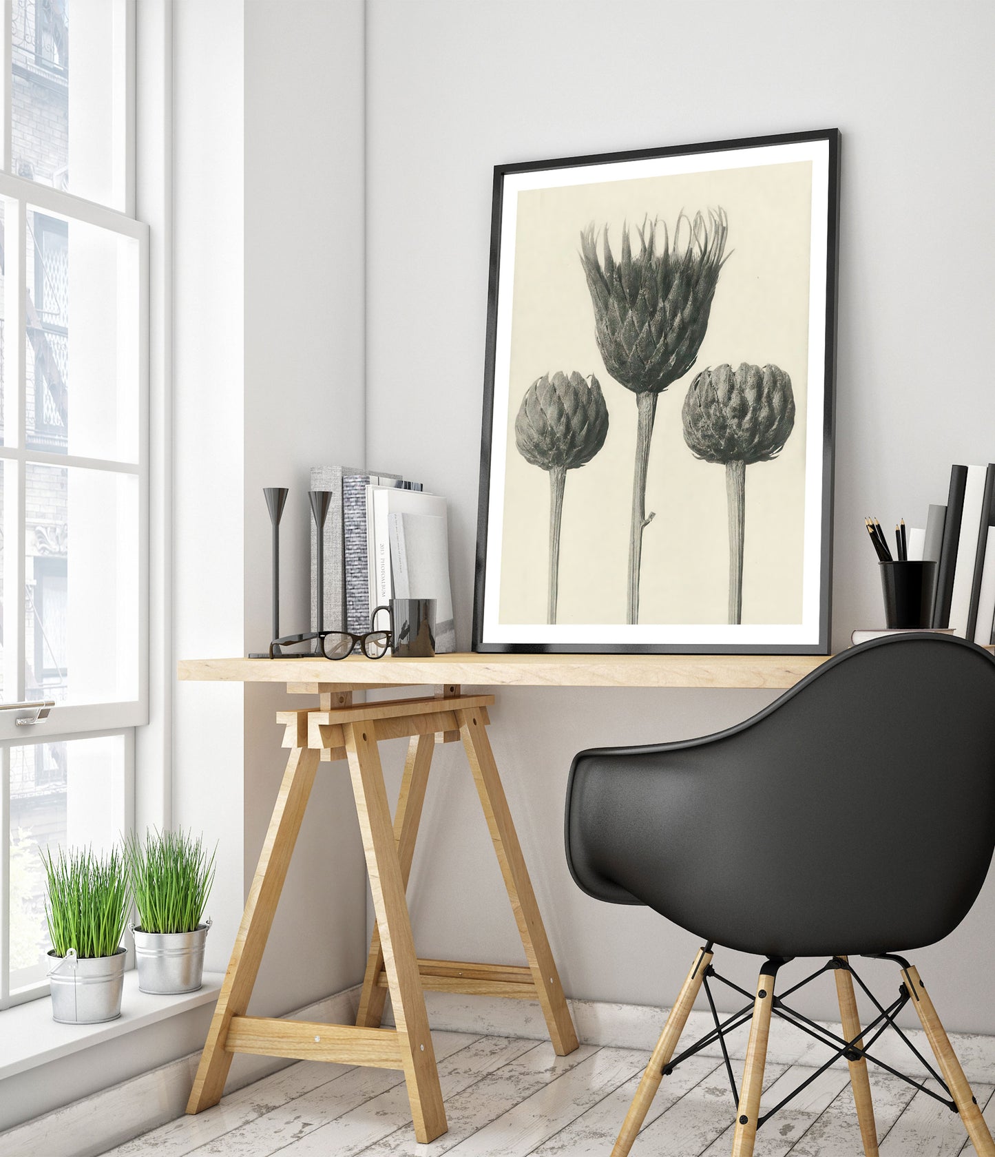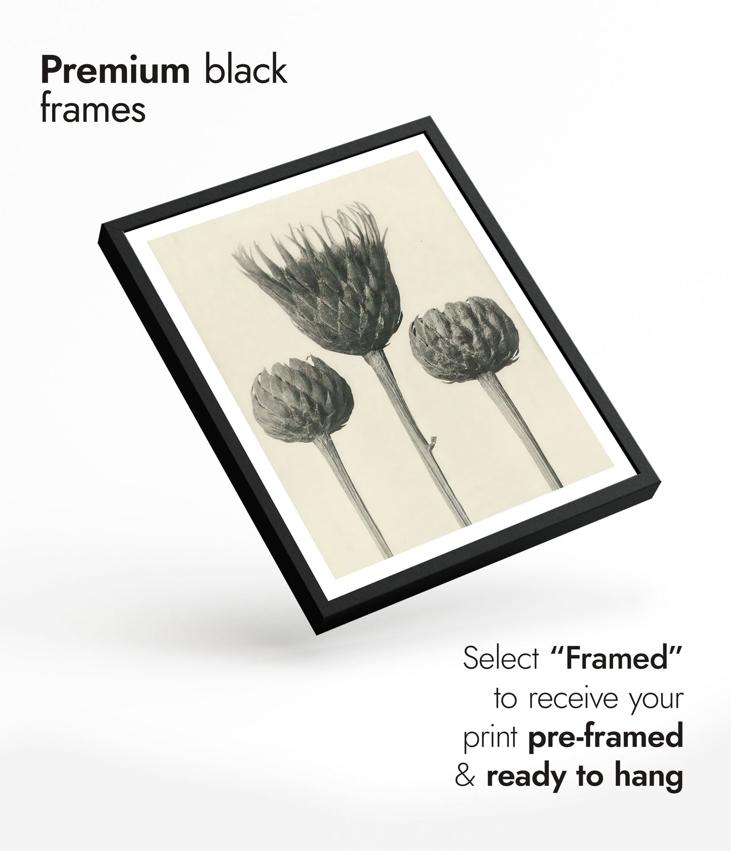 The "Plantstudie 13" poster by Karl Blossfeldt captures an intricate, black-and-white still life of three artichoke blossoms. This vintage photographic artwork highlights the elegant forms and textures of the plants, presenting a timeless piece that celebrates botanical beauty. Ideal for nature and floral photography enthusiasts.