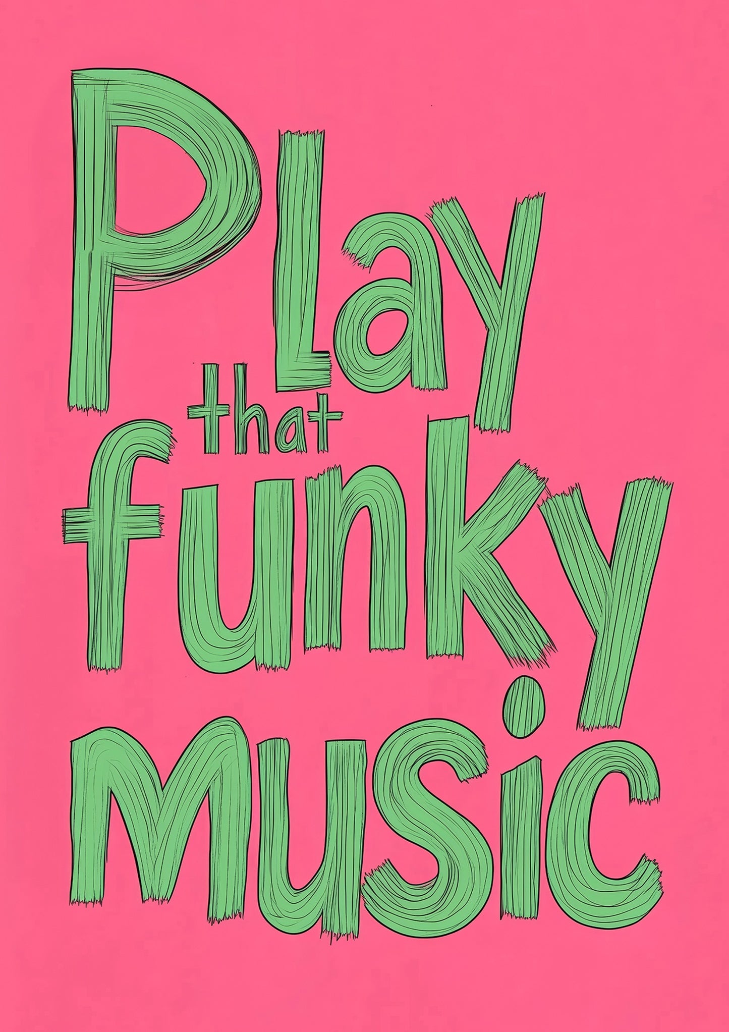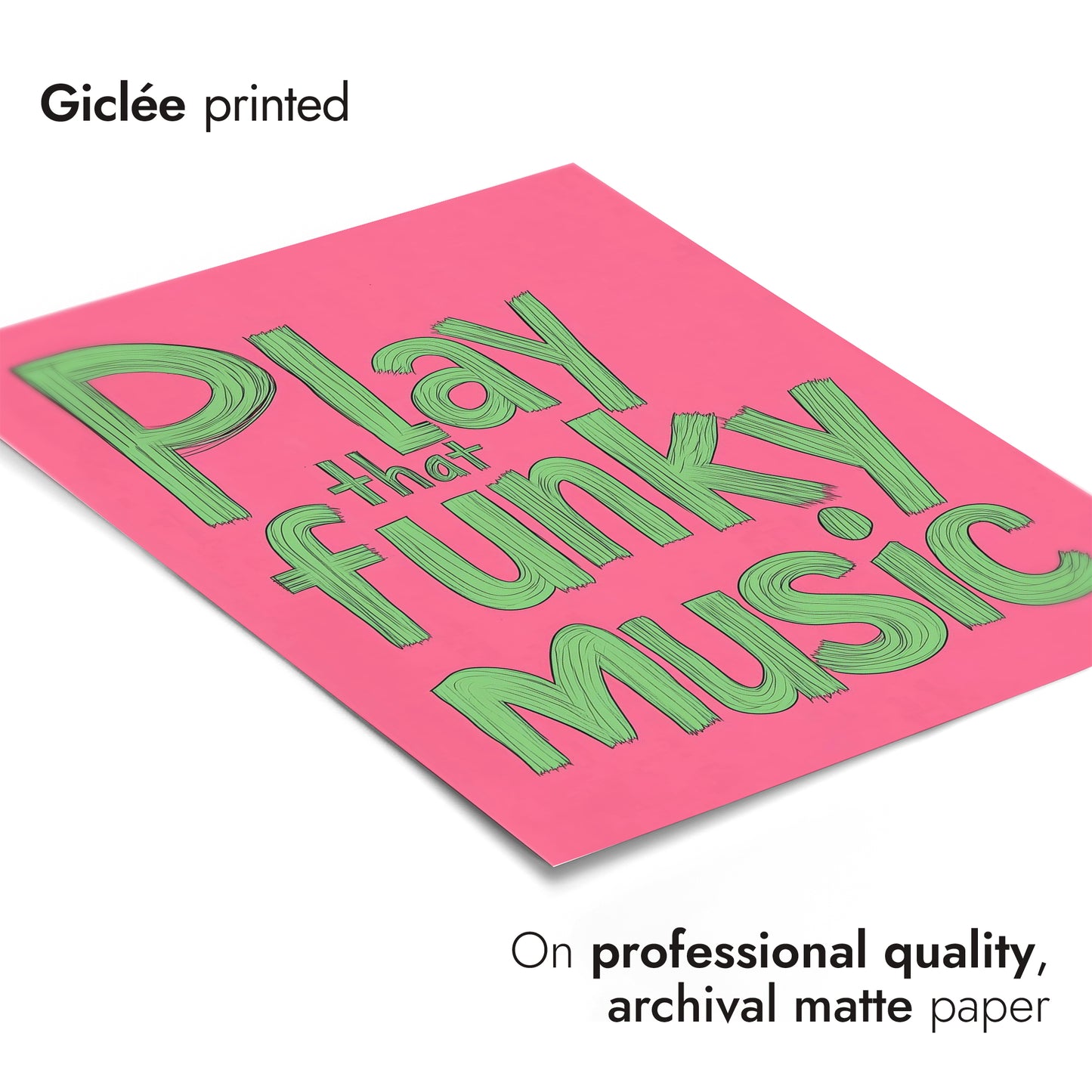 This vibrant typographic poster features the playful quote "Play That Funky Music" in bold, green letters set against a striking pink background. The energetic, hand-drawn style captures the essence of funk music, adding an artistic touch to any space. Ideal for music enthusiasts seeking a lively and fun decorative poster.