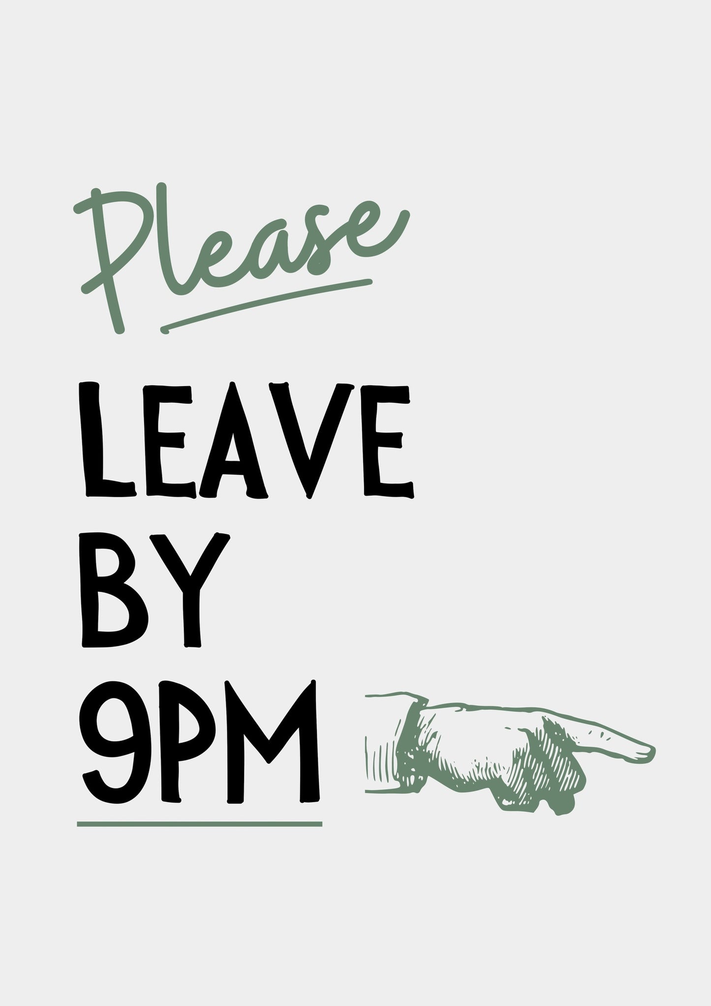This graphic typography poster features a playful quote, "Please Leave by 9PM," in a bold combination of black and green text. The humorous message is complemented by a vintage-style pointing hand illustration. Ideal for adding a touch of wit to any room, this portrait format poster strikes a perfect balance between modern design and classic elements.