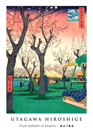 This art poster features "Plum Garden in Kamata" by Utagawa Hiroshige, showcasing a serene Japanese garden with blossoming plum trees. Depicted in traditional woodblock style, the rich colours and detailed landscape capture the essence of Ukiyo-e art. Ideal for art lovers, this portrait brings the beauty of Japanese culture and nature into any space.