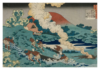 This "Poem by Kakinomoto no Hitomaro" woodblock print by Katsushika Hokusai showcases a serene Japanese rural landscape. The artwork features villagers navigating a river with plumes of smoke rising against a backdrop of rolling hills and a prominent mountain. Ideal for Ukiyo-E and traditional Japanese illustration enthusiasts, this poster captures the essence of tranquil countryside life.
