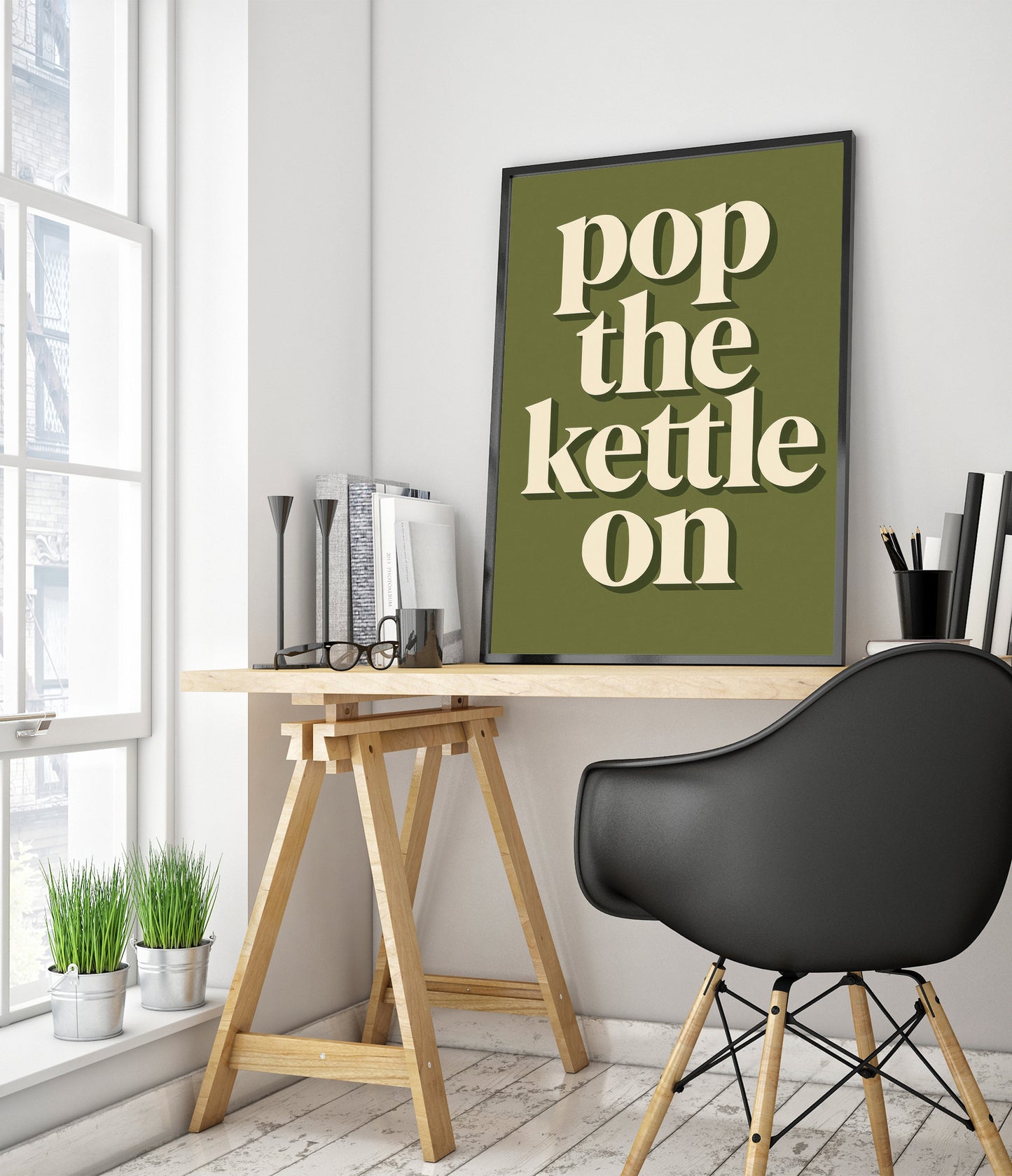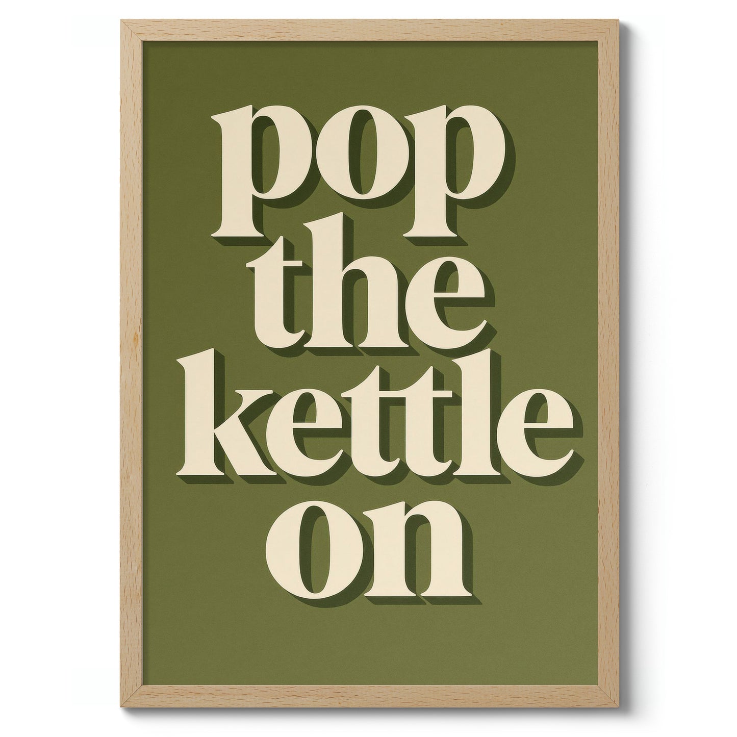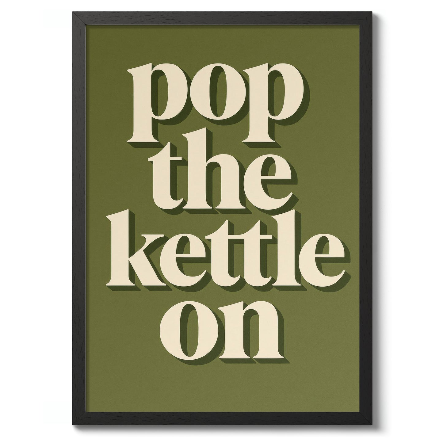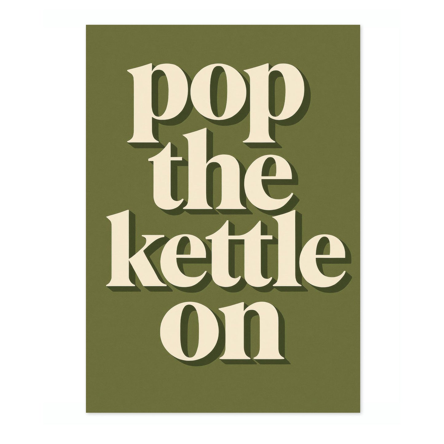 This typographic poster features the playful phrase "pop the kettle on" in bold cream-colored lettering, set against a rich olive green background. Perfect for tea lovers and kitchen decor, this graphic piece adds a touch of charm and warmth to any space. Ideal for those seeking vibrant and quirky typography art for their home or office.