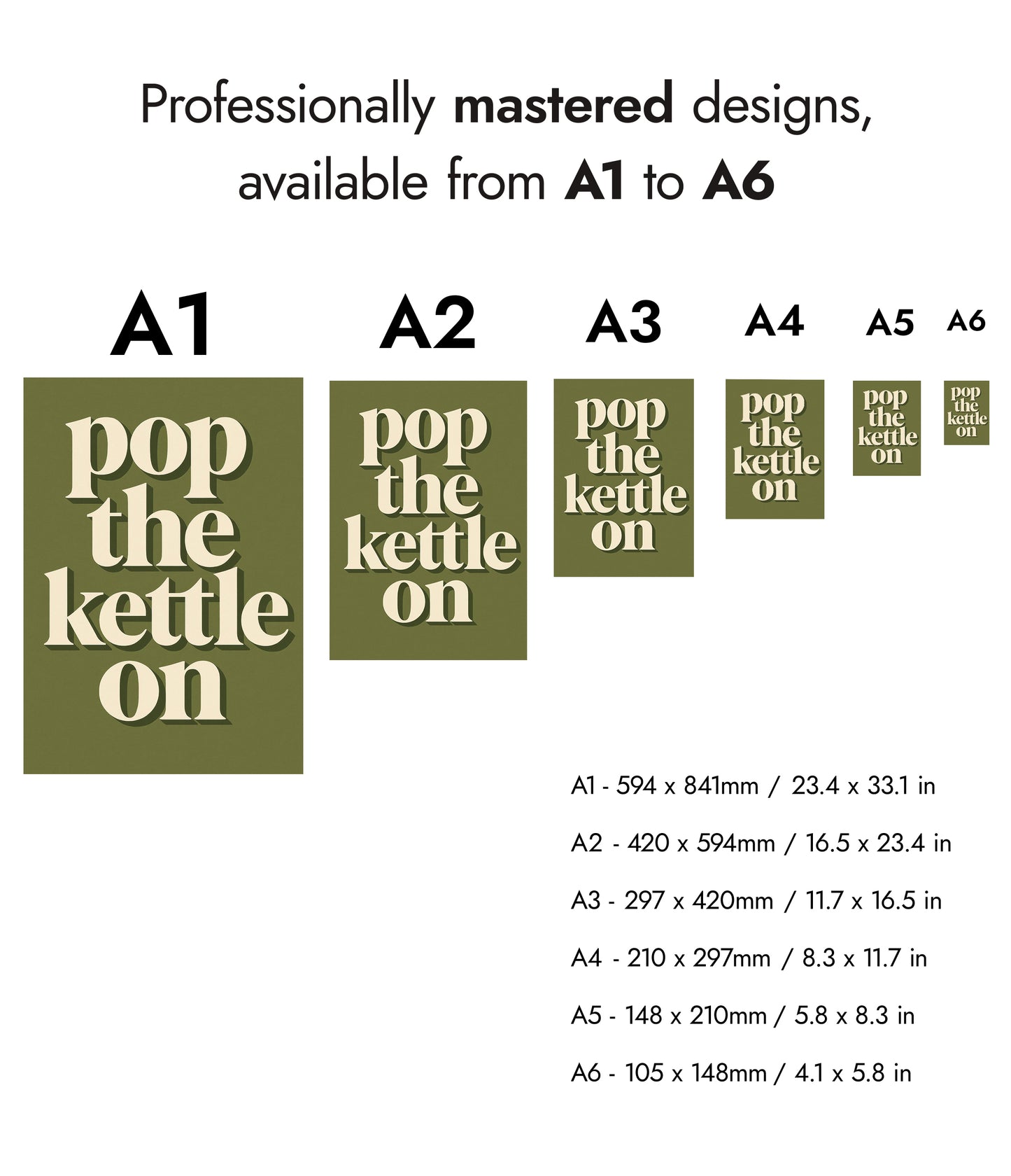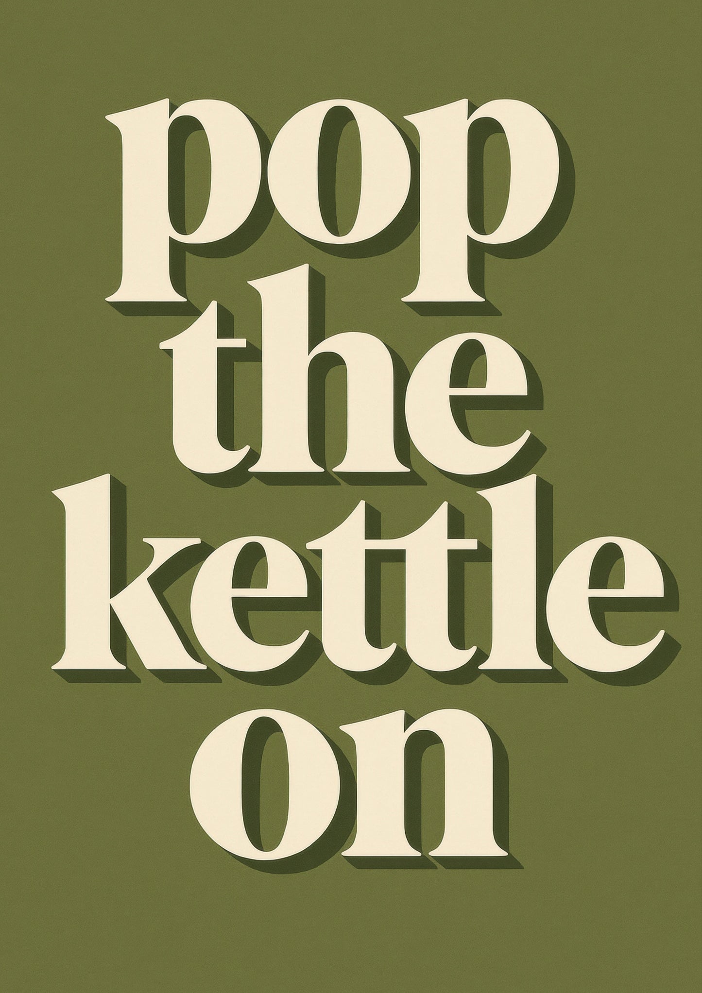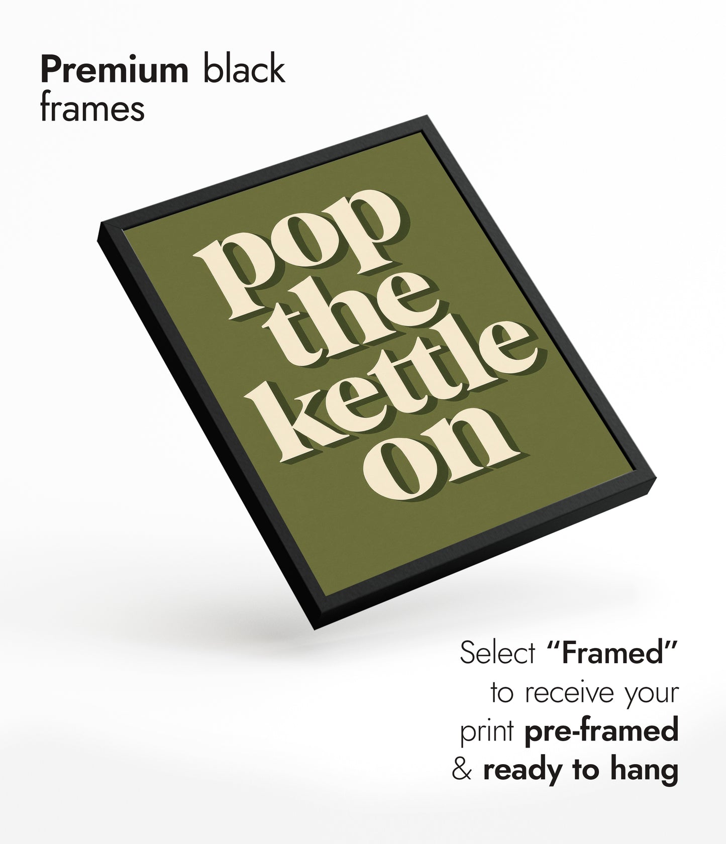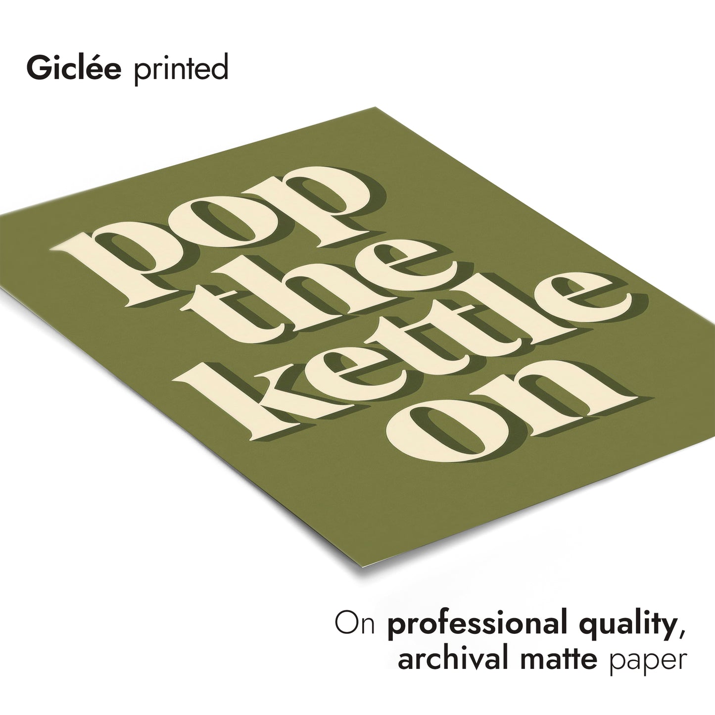 This typographic poster features the playful phrase "pop the kettle on" in bold cream-colored lettering, set against a rich olive green background. Perfect for tea lovers and kitchen decor, this graphic piece adds a touch of charm and warmth to any space. Ideal for those seeking vibrant and quirky typography art for their home or office.