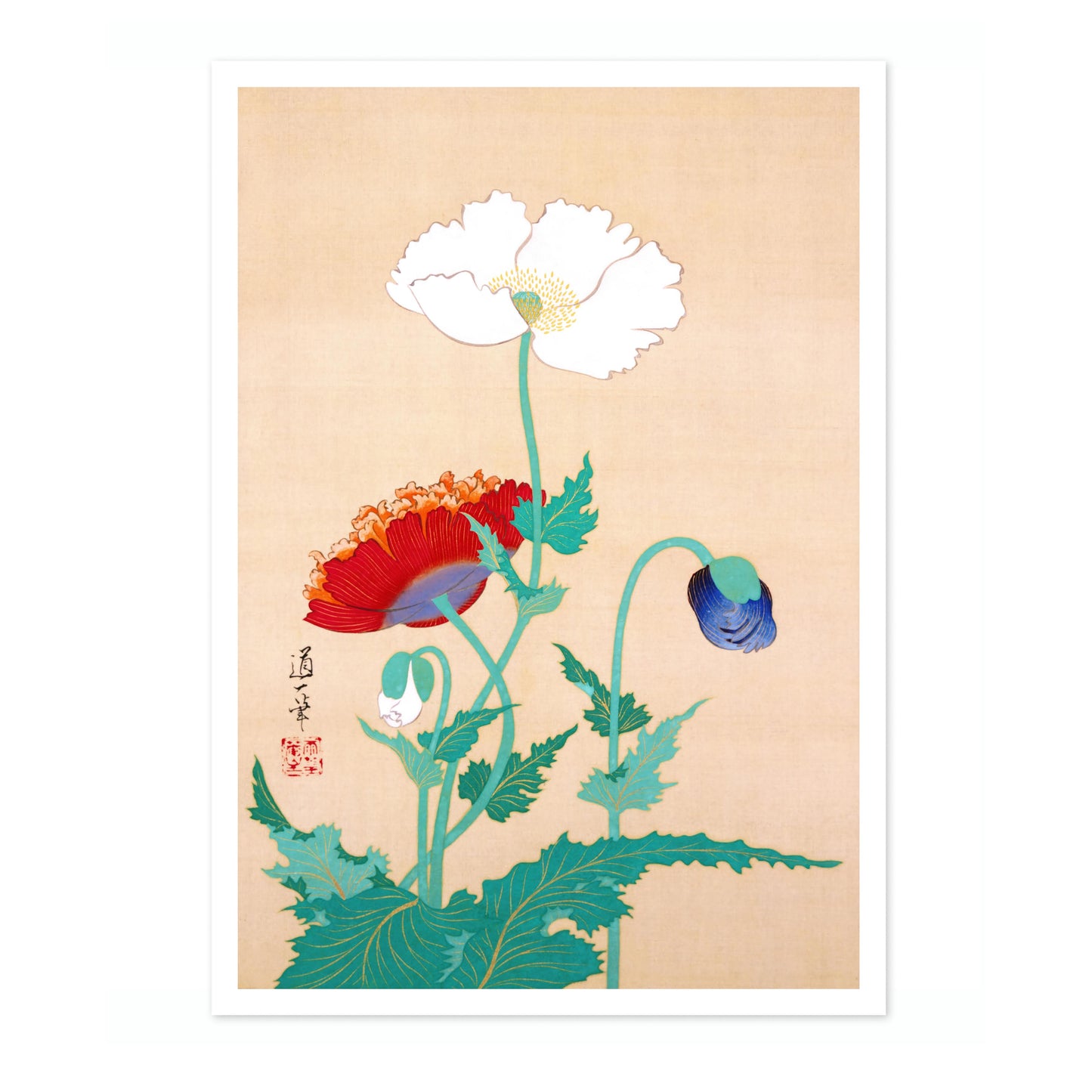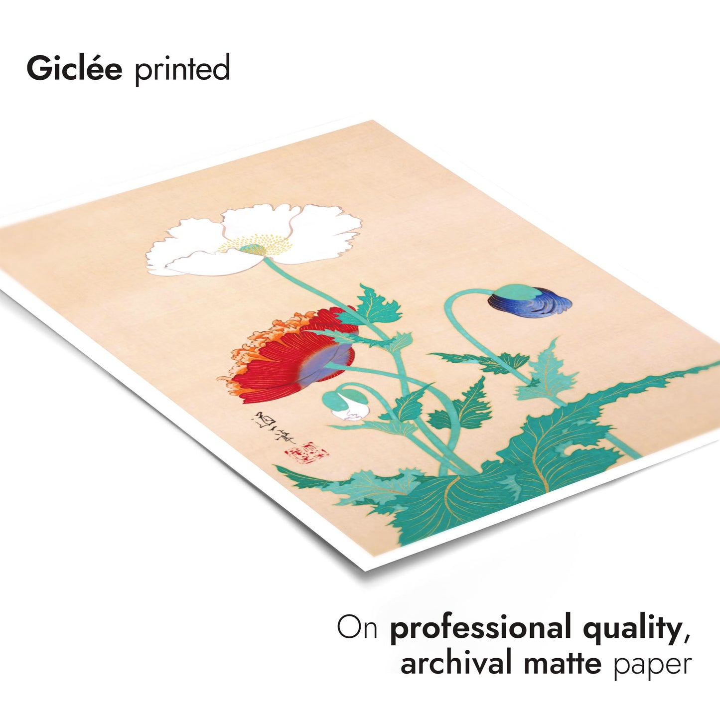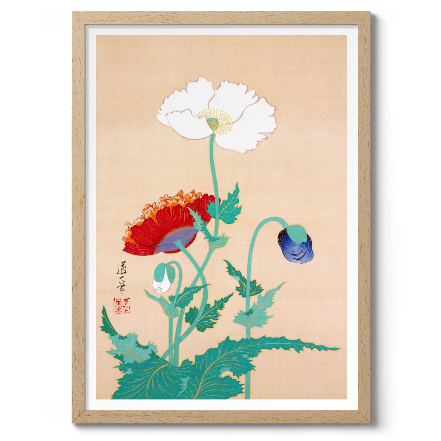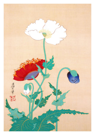 This Japanese woodblock poster by Sakai Doitsu showcases vibrant poppies in traditional Ukiyo-E style. The delicate petals contrast with the bold green leaves, creating a striking visual against the soft beige background. Ideal for adding a touch of elegance and colour to any space, this floral illustration highlights the artist's meticulous attention to detail and mastery of traditional techniques.