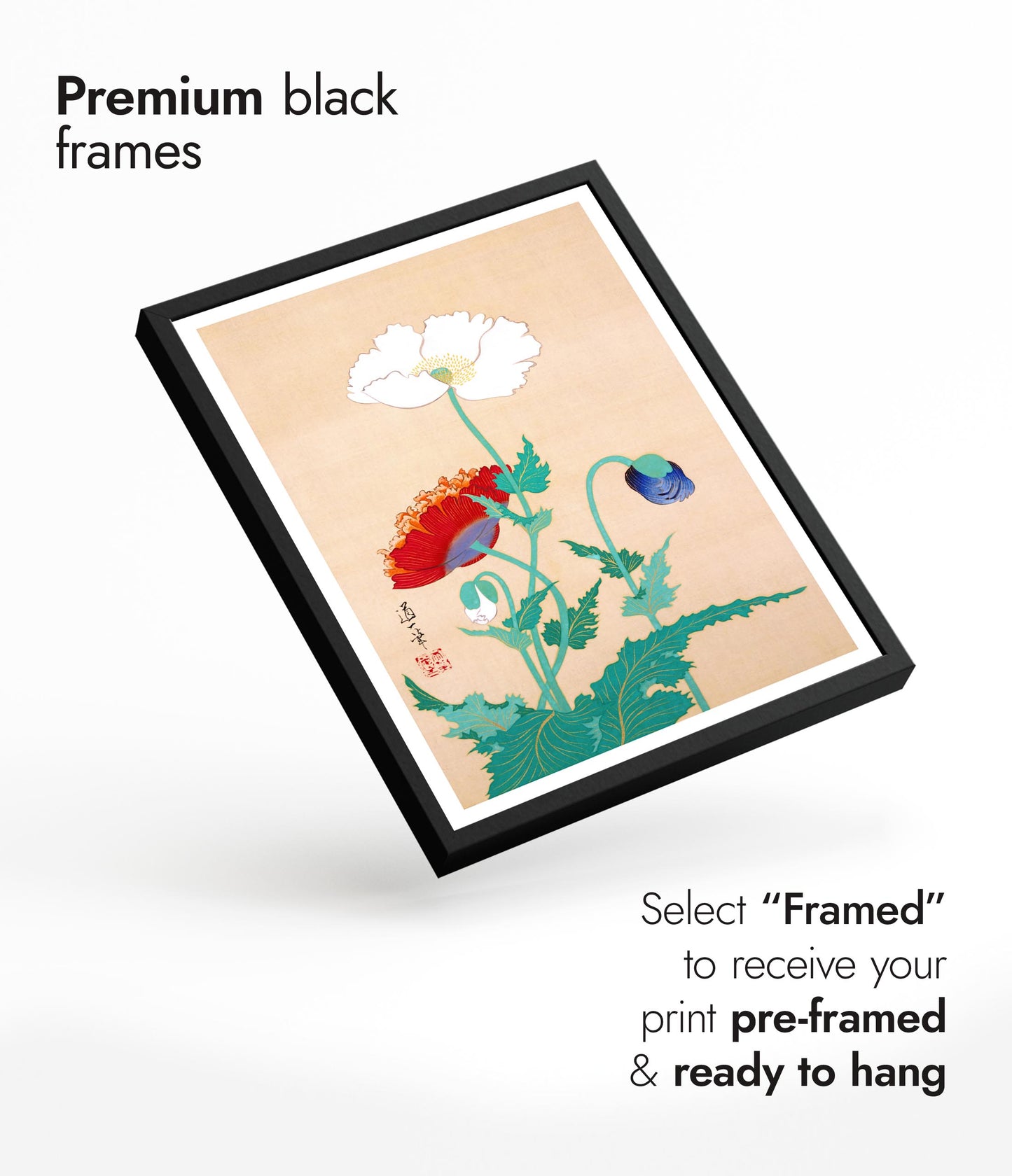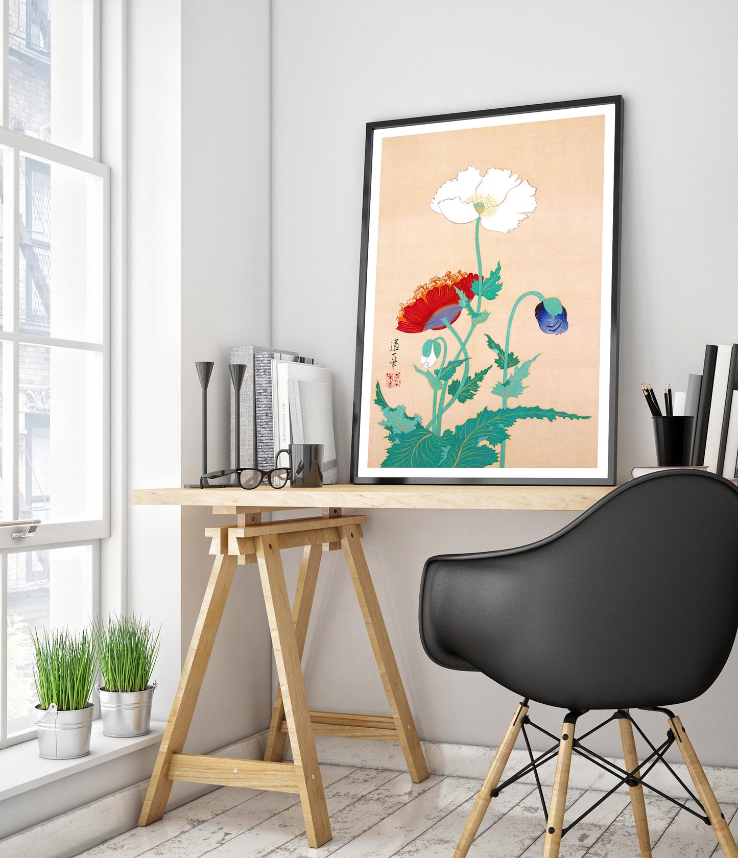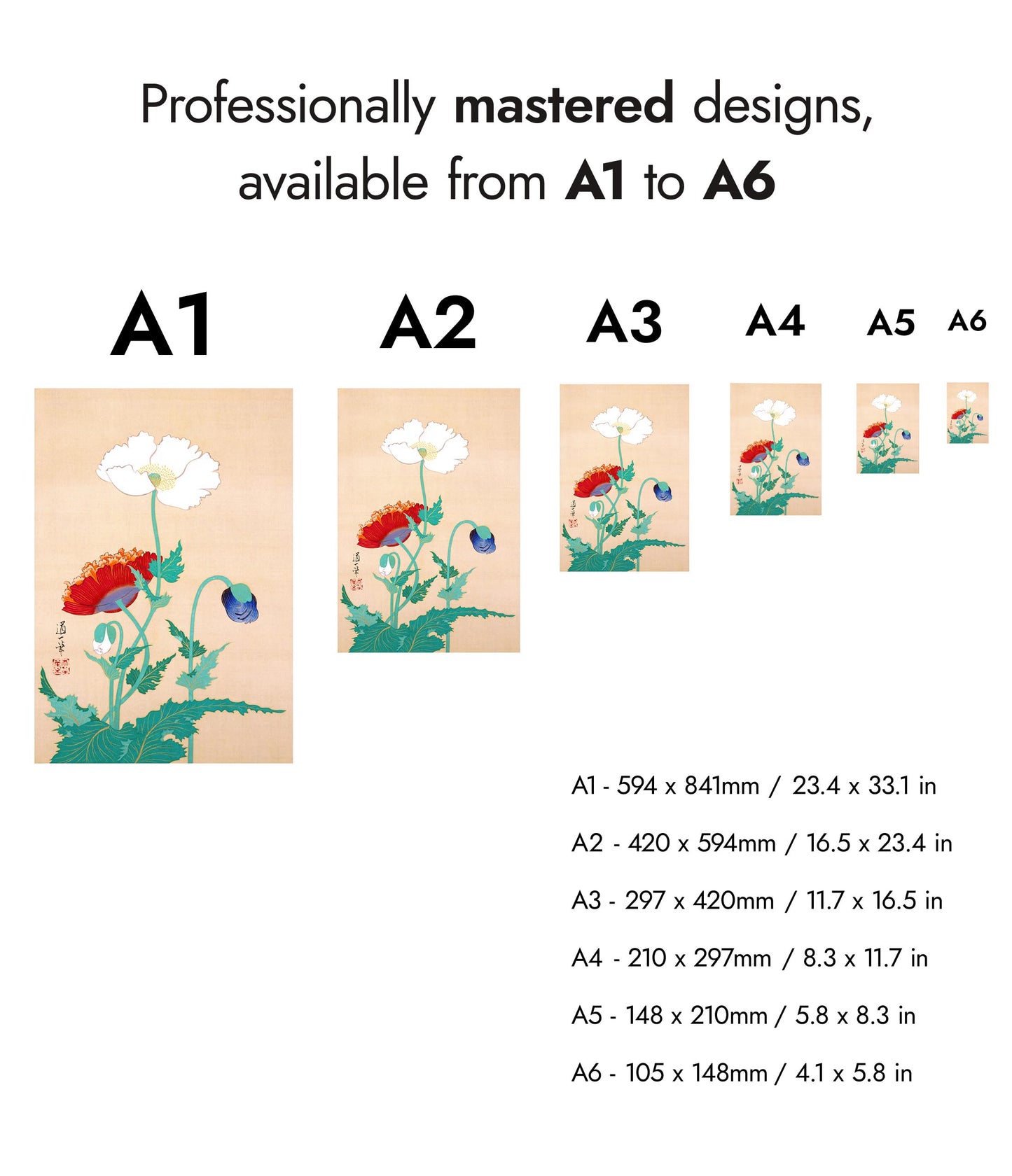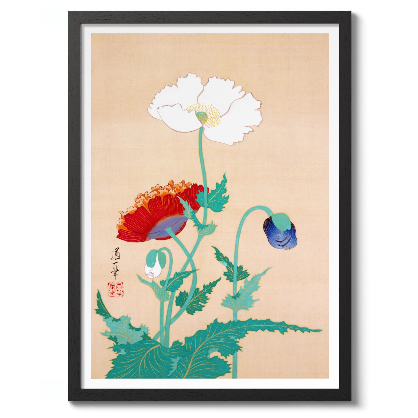 This Japanese woodblock poster by Sakai Doitsu showcases vibrant poppies in traditional Ukiyo-E style. The delicate petals contrast with the bold green leaves, creating a striking visual against the soft beige background. Ideal for adding a touch of elegance and colour to any space, this floral illustration highlights the artist's meticulous attention to detail and mastery of traditional techniques.