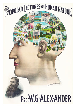 This vintage poster titled "Popular Lectures on Human Nature" features a detailed illustration of a human head with intricate scenes illustrating various aspects of human nature inside the brain. The poster prominently displays Prof. W.G. Alexander's name, enhancing its historical and educational appeal. Perfect for those intrigued by human psychology and vintage illustrations.