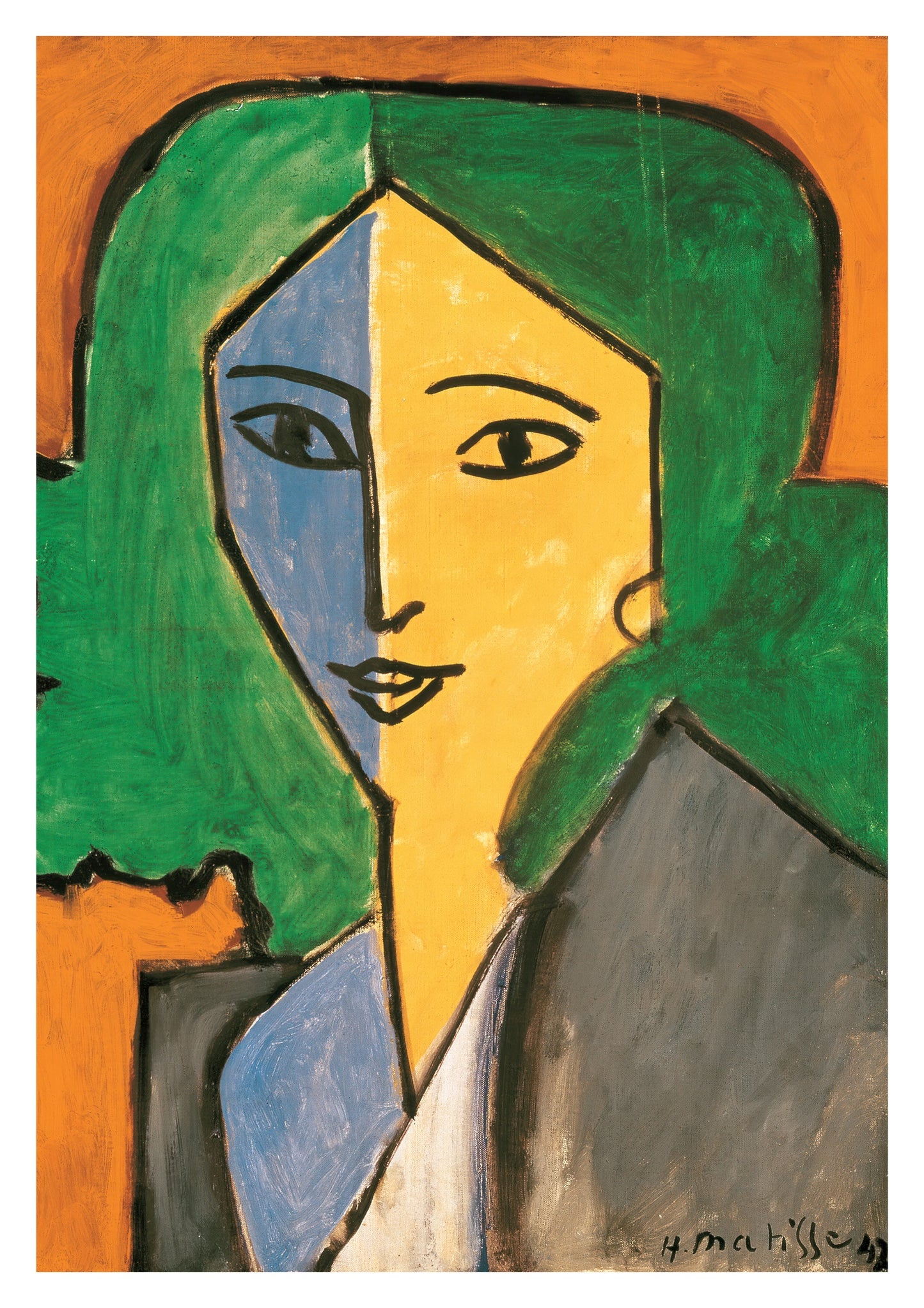 This "Portrait of Lydia Delectorskaya" by Henri Matisse showcases a vibrant blend of Fauvism and geometric styles. The poster features a striking portrayal of a woman with vivid green hair, a dual-toned blue and ochre face, and a dynamic orange background. The artwork's bold colours and simplified forms highlight Matisse's distinctive approach to portraiture. Perfect for adding an artistic touch to any space.