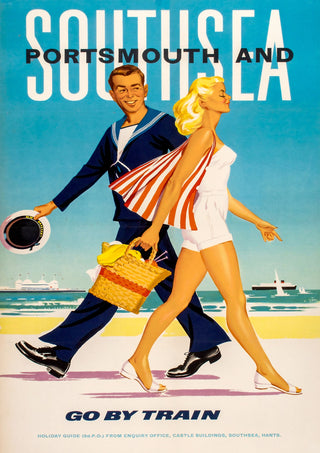 This vintage Portsmouth and Southsea poster captures a cheerful couple embarking on a coastal holiday. The retro illustration depicts them in summery attire, with the man dressed as a sailor. The bright colours and nautical theme evoke a sense of classic British seaside charm, making this travel poster an eye-catching addition to any collection.