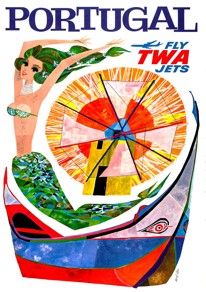This vibrant vintage poster features a stylized mermaid set against the backdrop of a colourful windmill, promoting travel to Portugal with TWA Jets. The artistic collage incorporates bold graphics and bright hues, capturing the essence of Mediterranean charm and aviation history. Ideal for adding a touch of European nostalgia to any space.