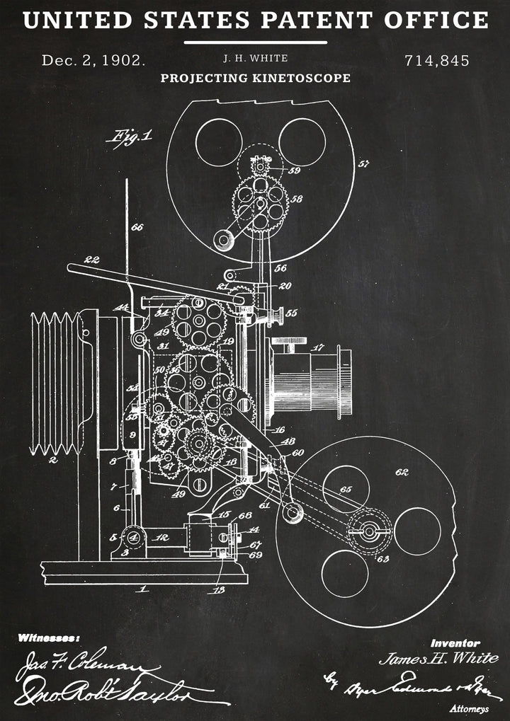 This vintage poster of the United States Patent Office showcases the schematic of a projecting kinetoscope, patented on December 2, 1902. Featuring intricate line art details, this illustration highlights the mechanical beauty of early movie projector technology. Ideal for enthusiasts of patent art and vintage schematics, it brings a touch of historical innovation to any space.