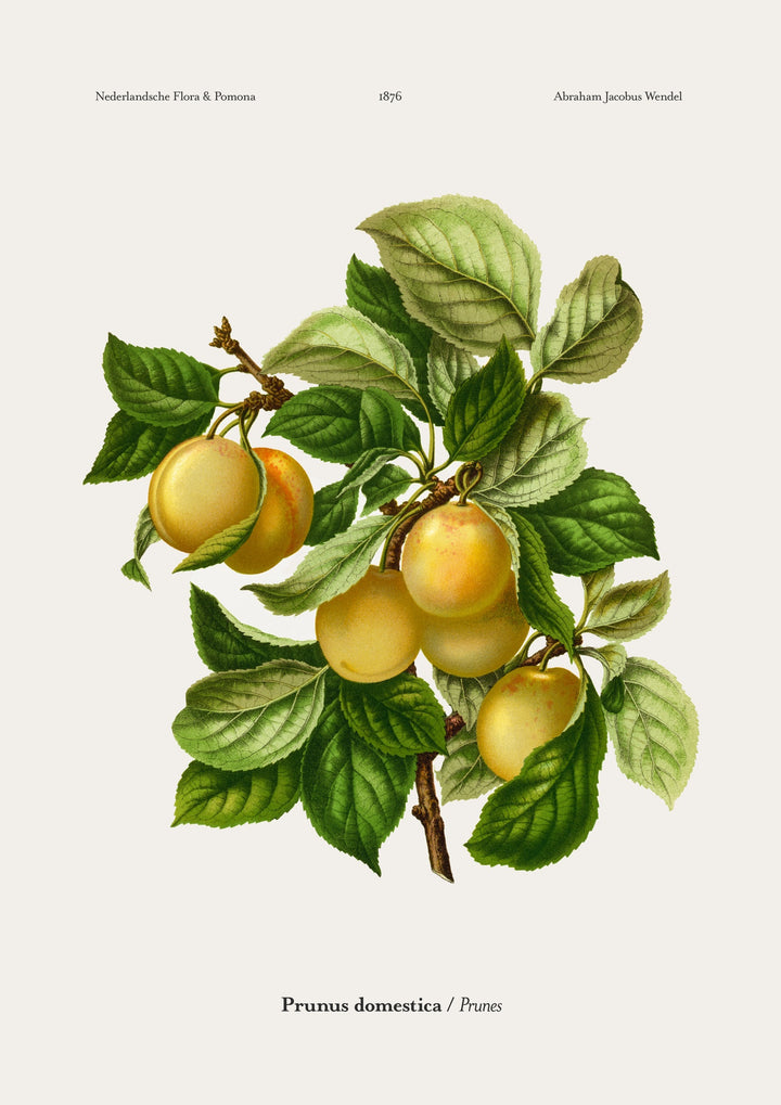 This vintage botanical poster by A. J. Wendel showcases the detailed illustration of Prunus domestica, commonly known as prunes. The artwork features lush green leaves and ripe, yellow prunes depicted with intricate linework and rich colour. Ideal for adding a touch of nature and classic style to any space. Perfect for enthusiasts of vintage botanical prints.