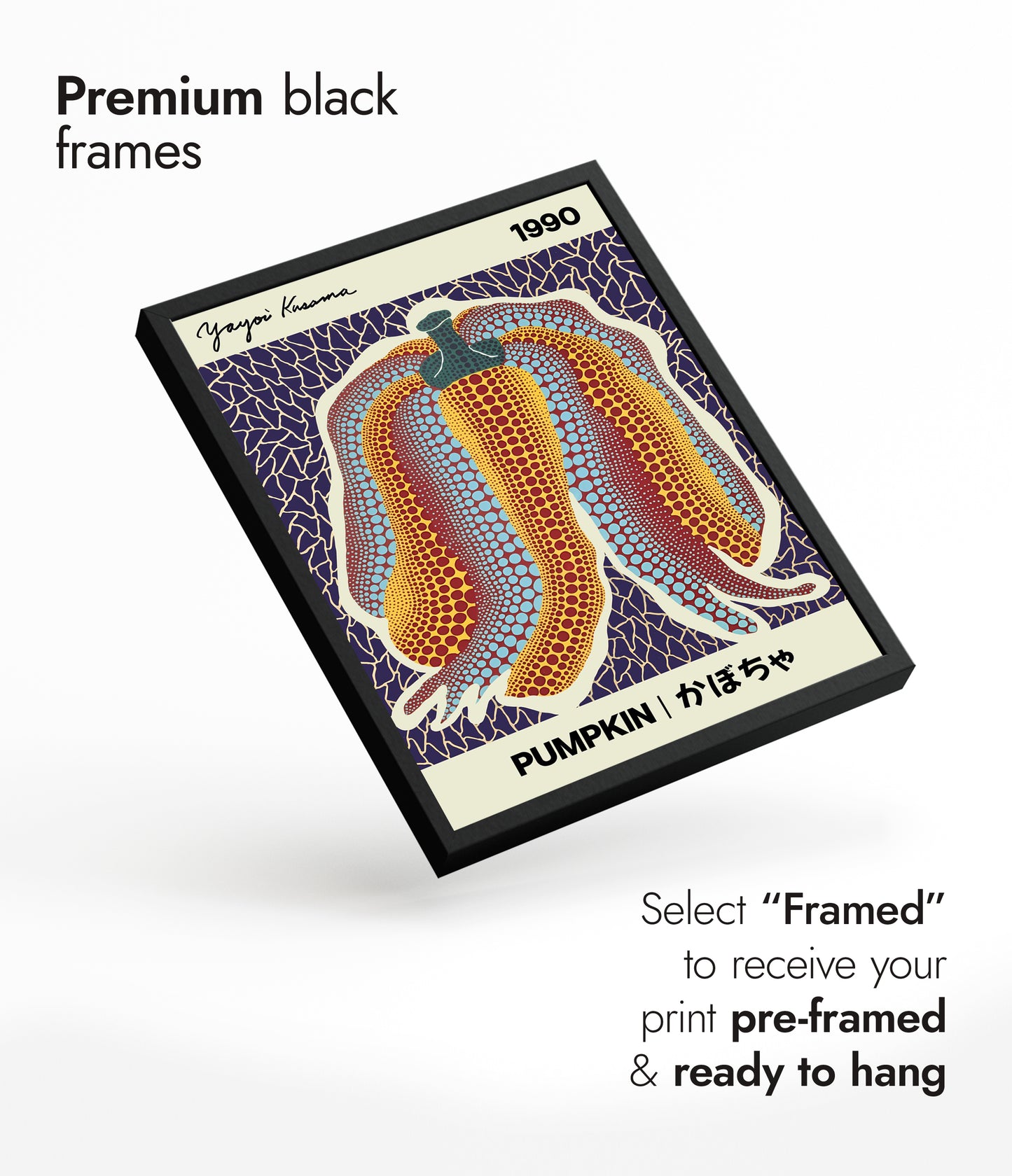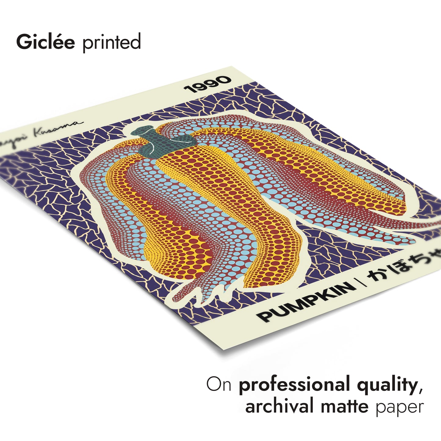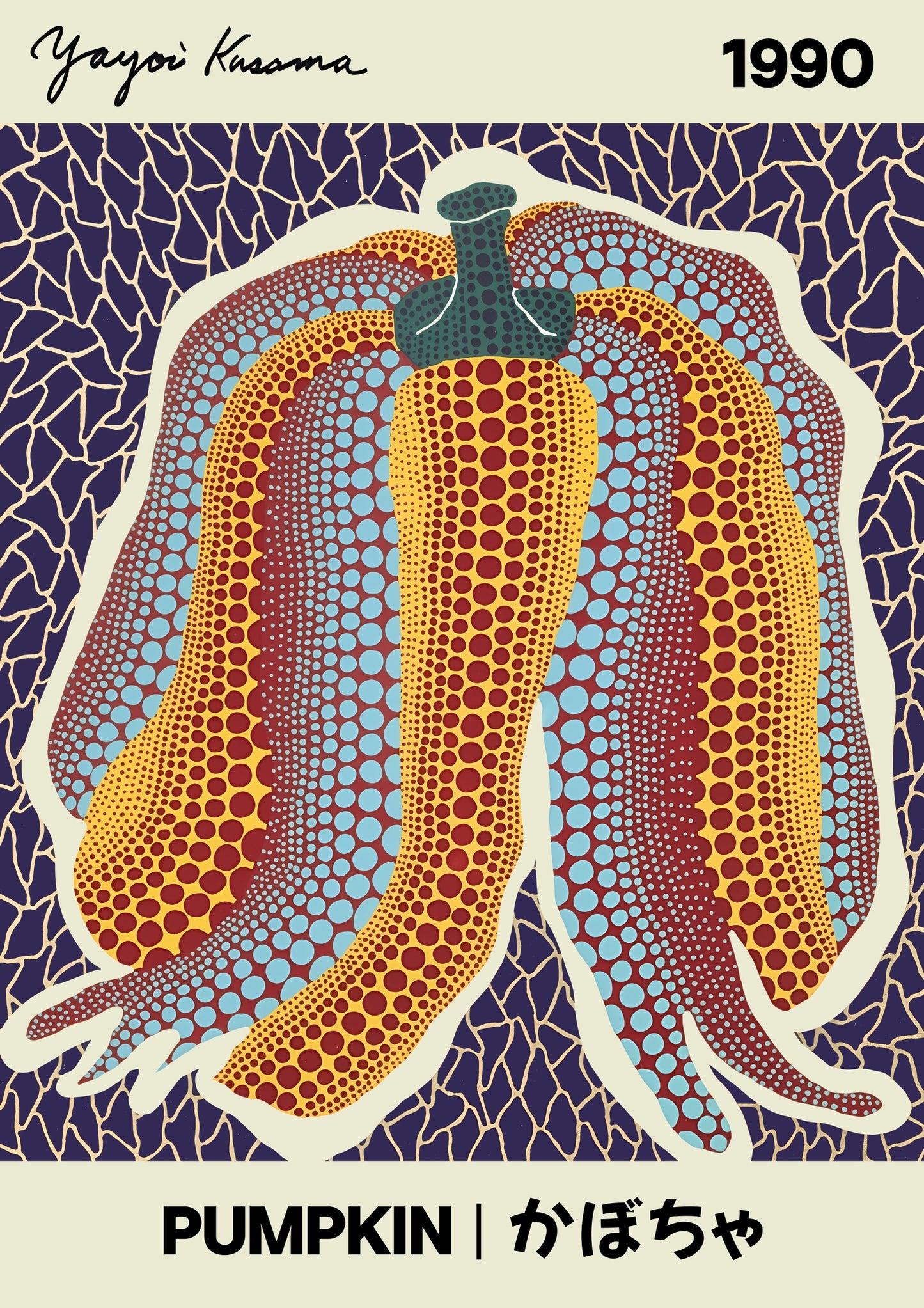 "Pumpkin 1990 Beige" poster by Yayoi Kusama showcases a vibrant, abstract depiction of a pumpkin adorned with meticulously arranged dots. This modern art piece features a striking beige background highlighting the pumpkin's bold colors and textured patterns. Kusama's signature style captures a minimalist yet profound aesthetic, making it a remarkable addition to any contemporary art collection.