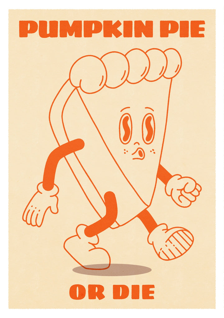This playful portrait poster features a retro-inspired cartoon of a walking pumpkin pie slice, complete with expressive eyes and anthropomorphic limbs. Titled "Pumpkin Pie or Die," the orange typography and graphic illustration capture the essence of whimsical Halloween humor, perfect for modern decor. Ideal for food enthusiasts and typography lovers.