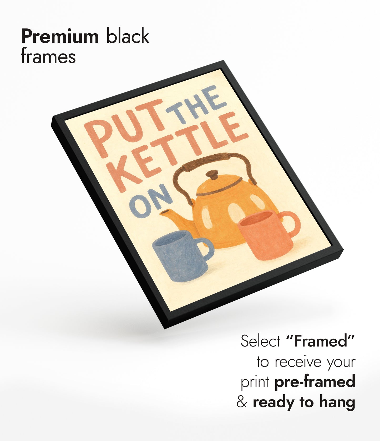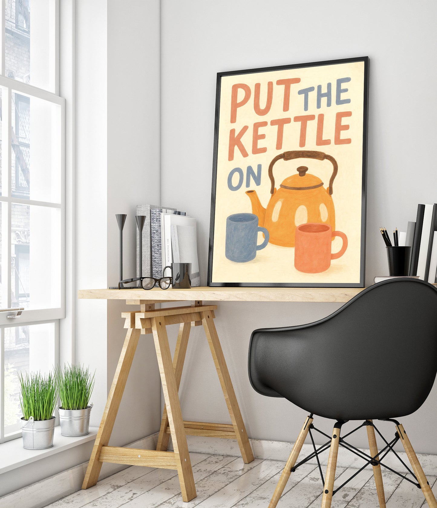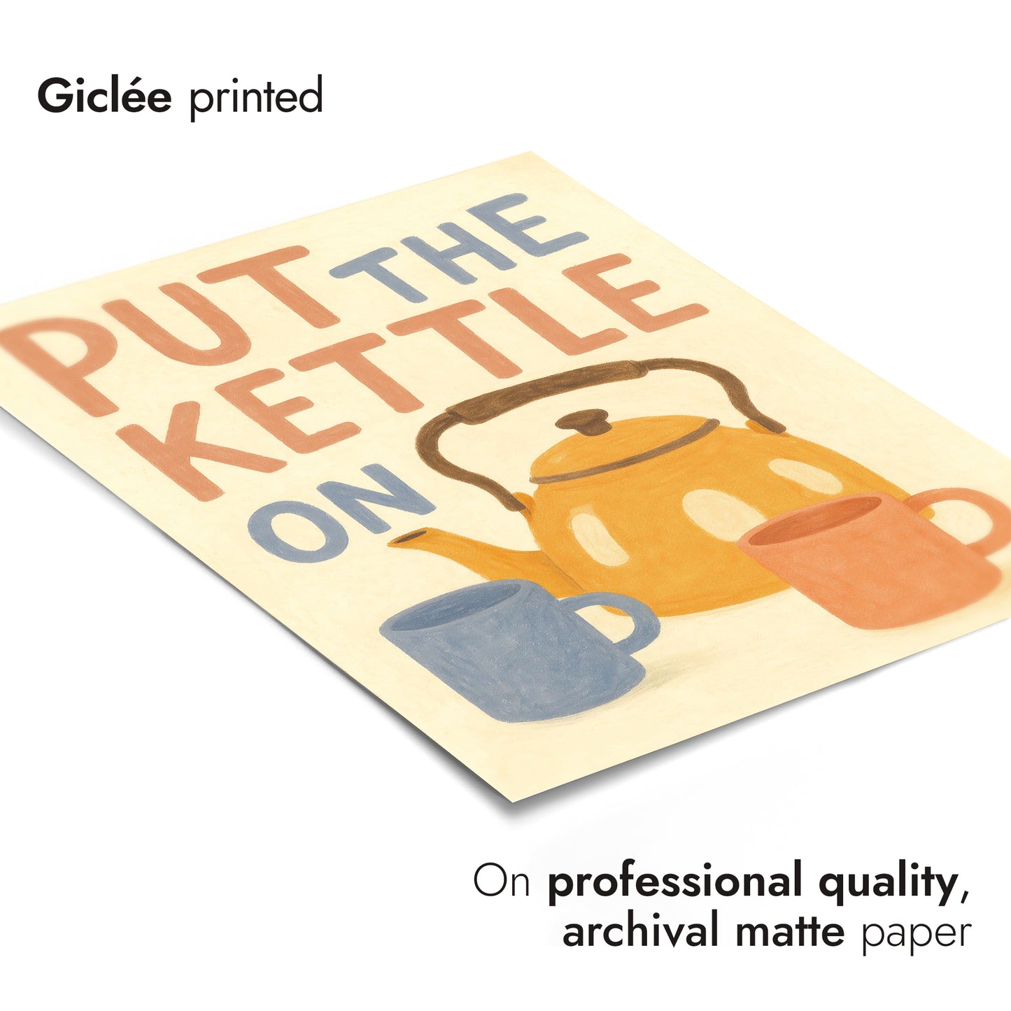 This typographic poster, titled "Put the Kettle On," features a playful illustration of a vibrant orange kettle accompanied by blue and pink mugs. The bold, inviting text enhances the cozy tea theme, making it a perfect addition to kitchens or dining spaces. With its graphic style and warm tones, this artwork beautifully celebrates the simple joy of tea preparation.