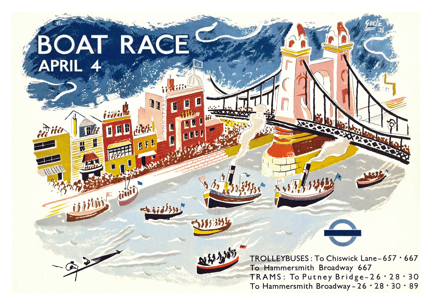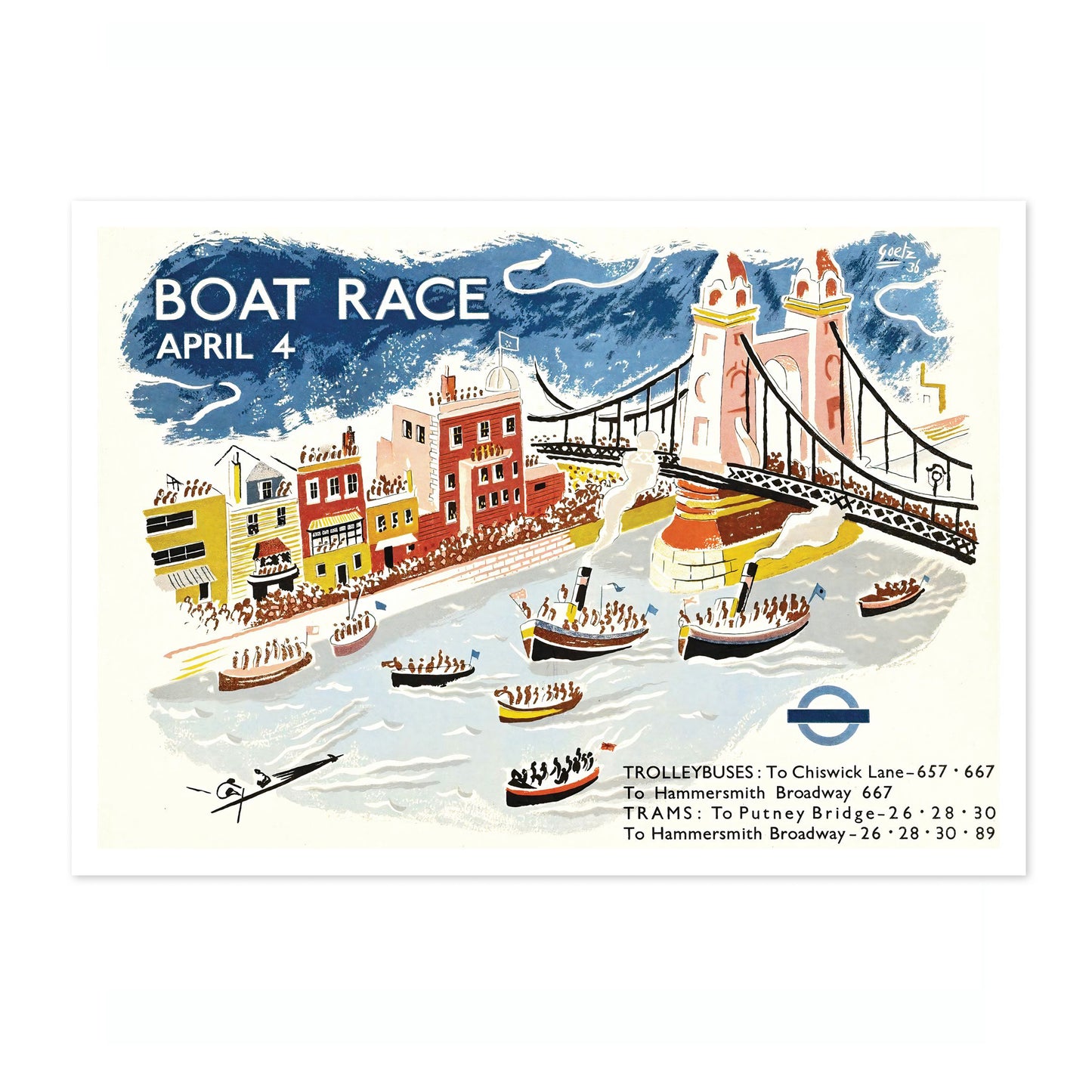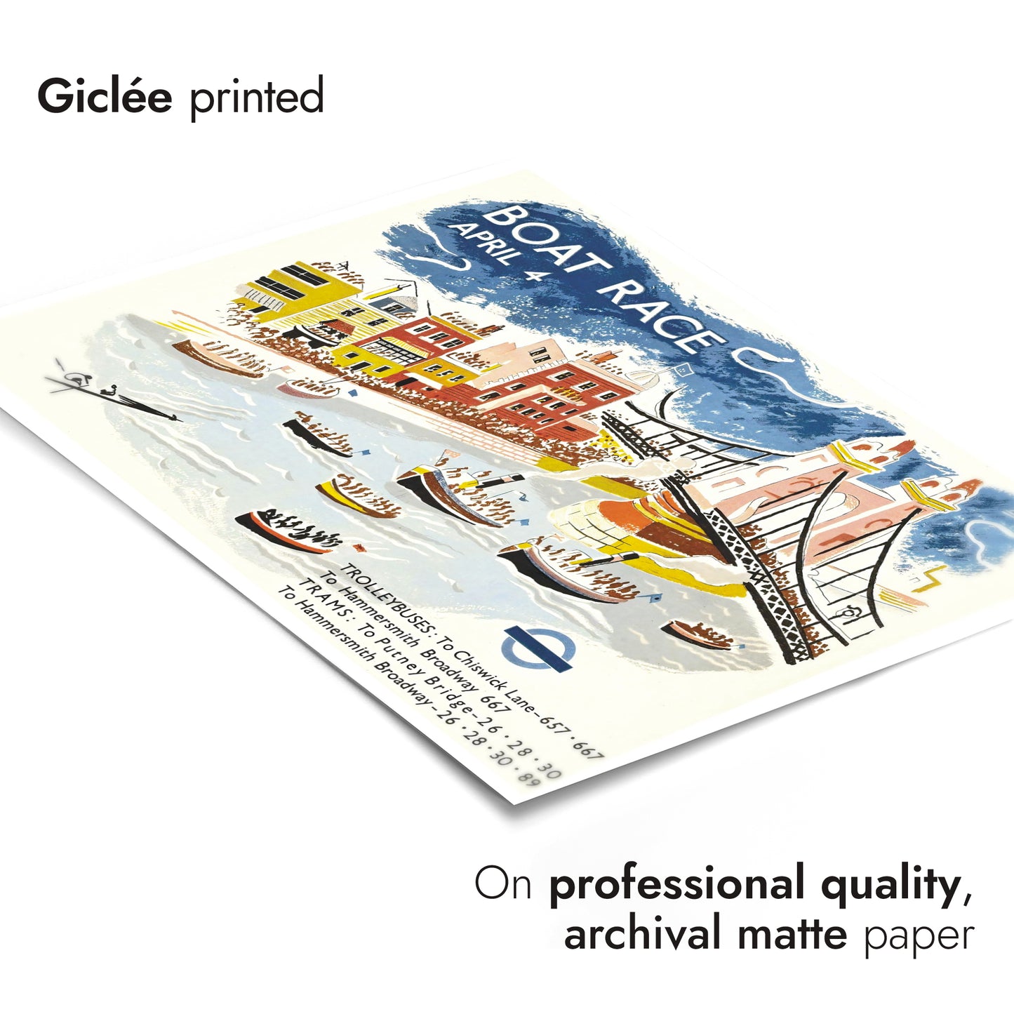 This vintage illustration poster, "Putney Bridge Boat Race," captures the vibrant energy of a London rowing race. Featuring the iconic Putney Bridge, a lively crowd, and competitive boats on the River Thames, this art print highlights classic London transport with trolleybus and tram announcements. The blue and white tones emphasize the dynamic scene, ideal for fans of sports-themed vintage art.