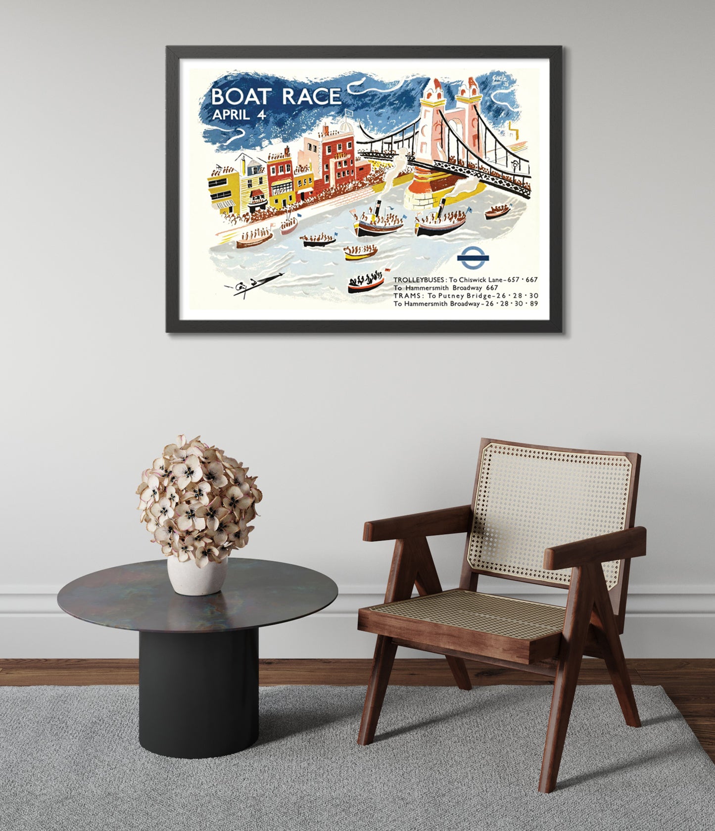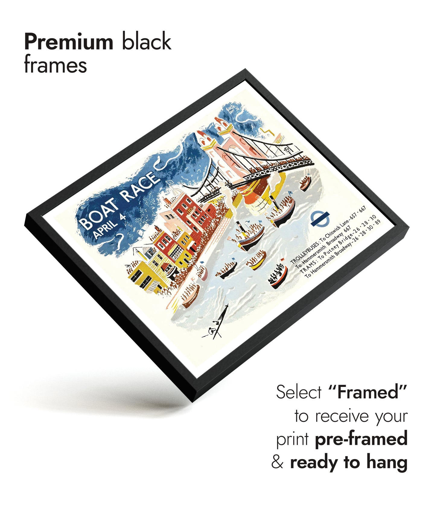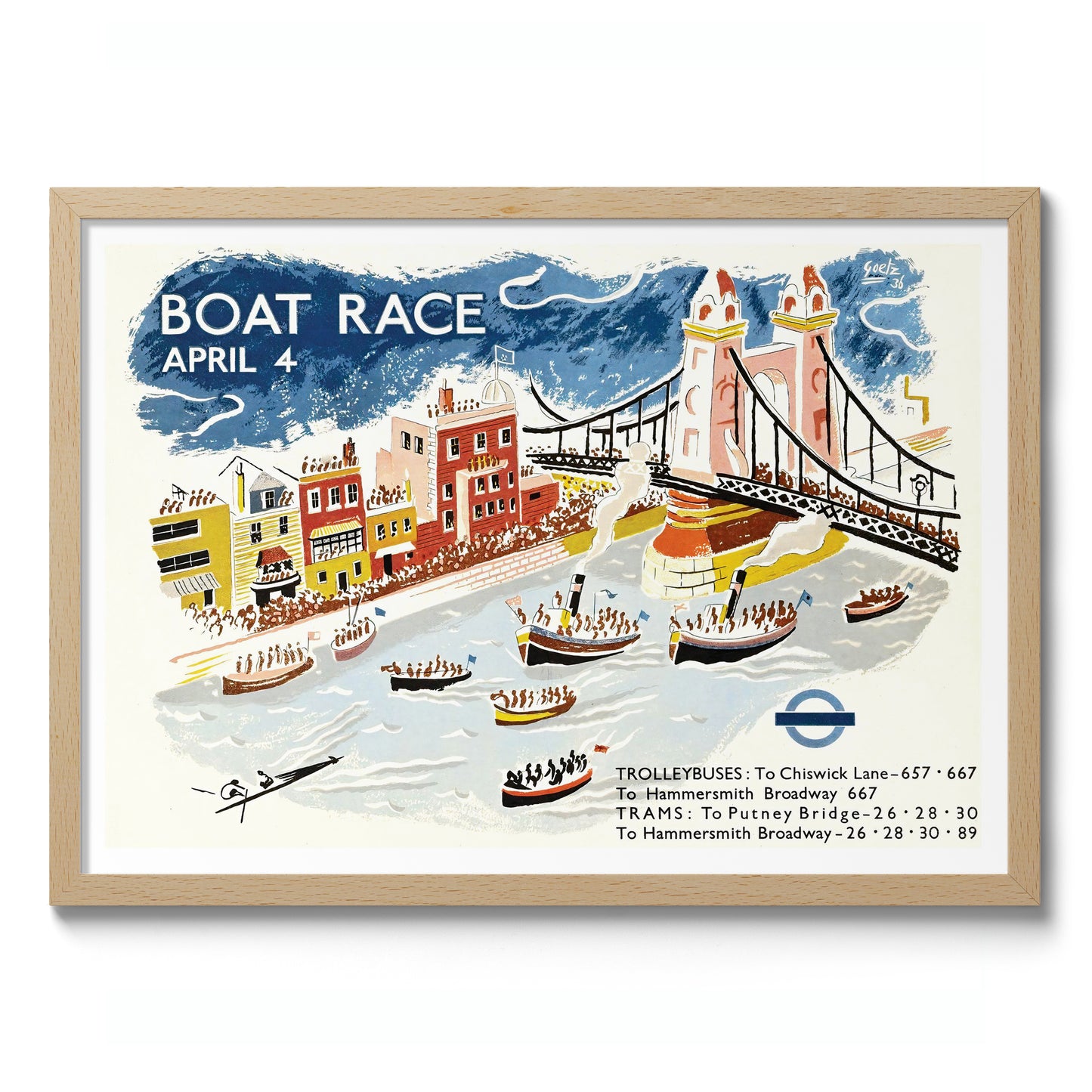This vintage illustration poster, "Putney Bridge Boat Race," captures the vibrant energy of a London rowing race. Featuring the iconic Putney Bridge, a lively crowd, and competitive boats on the River Thames, this art print highlights classic London transport with trolleybus and tram announcements. The blue and white tones emphasize the dynamic scene, ideal for fans of sports-themed vintage art.