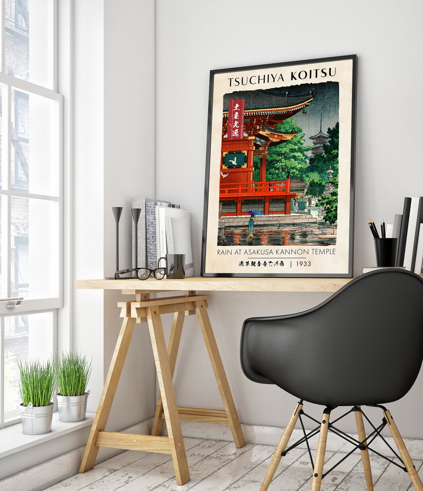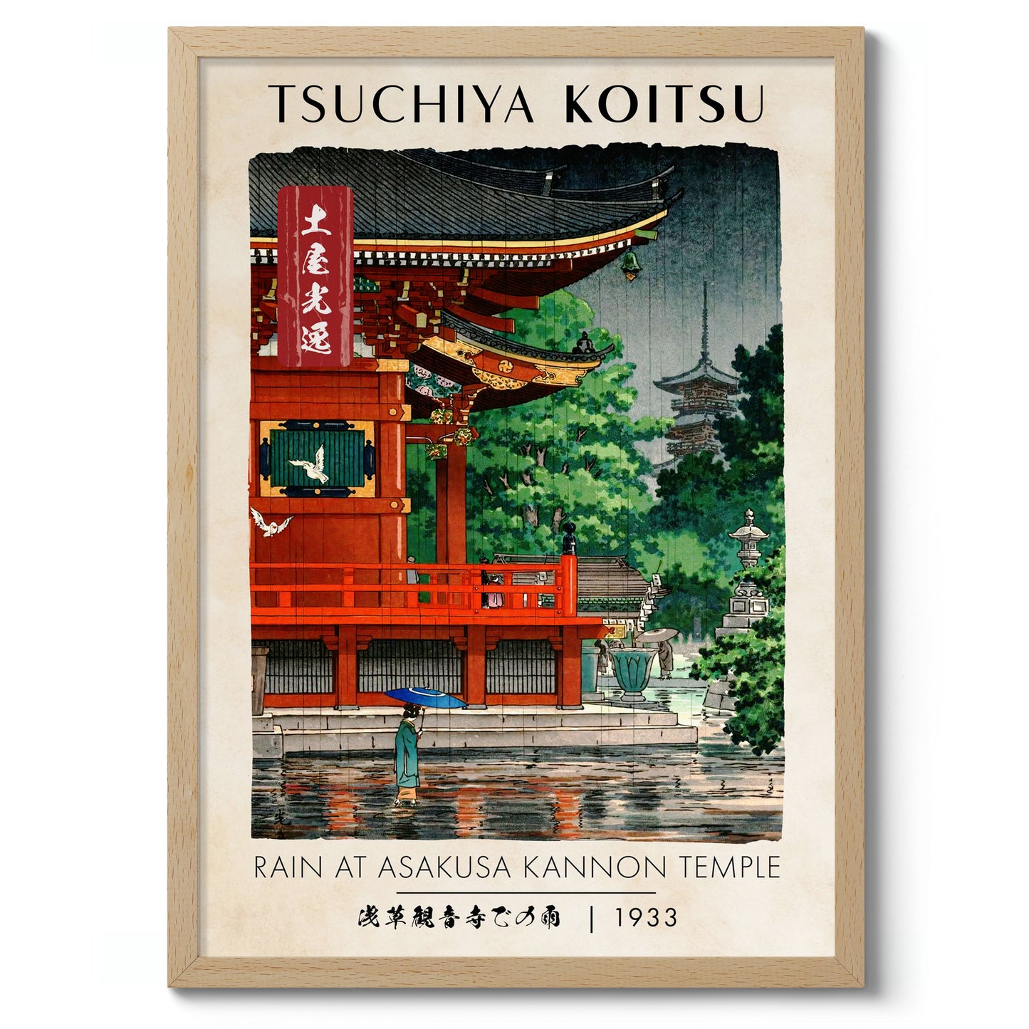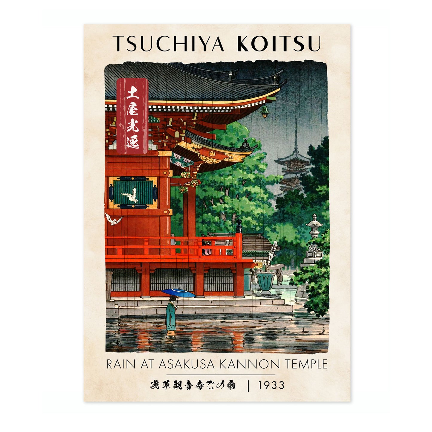 This captivating poster features Tsuchiya Koitsu's "Rain at Asakusa Kannon Temple," a classic example of Shin-Hanga style woodblock art. The scene showcases a traditionally vibrant red pagoda amidst lush greenery, with figures walking through rain-soaked temple grounds. Subtle reflections along the wet surfaces evoke a serene atmosphere, blending cultural and natural elements typical of Japanese artistry. Perfect for adding depth and cultural richness to any space.