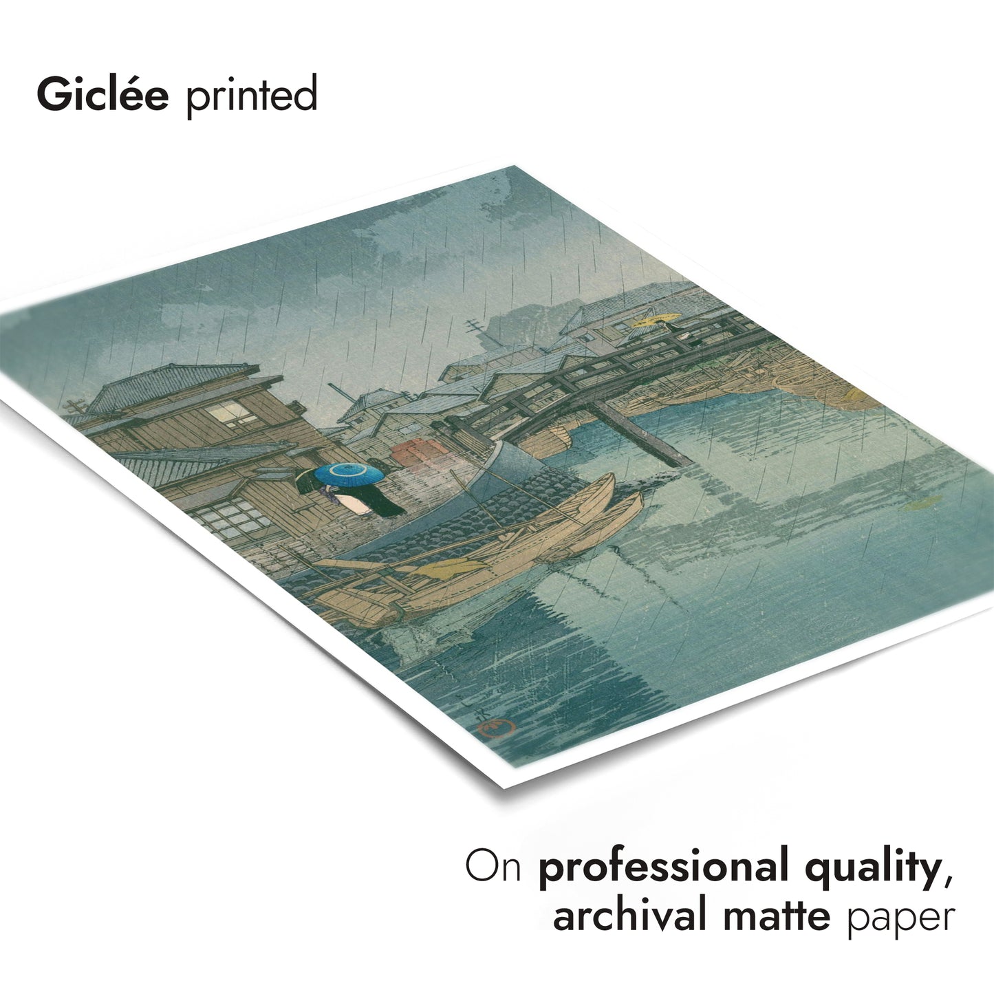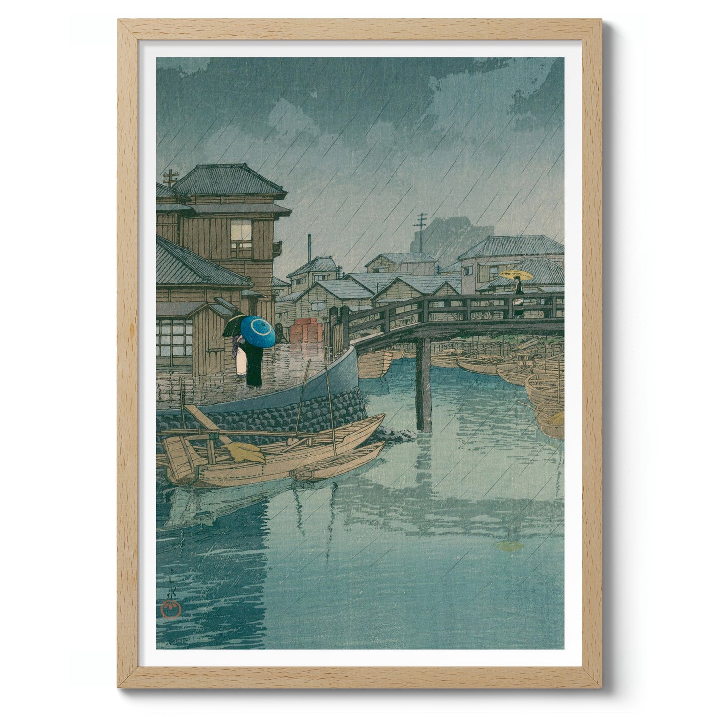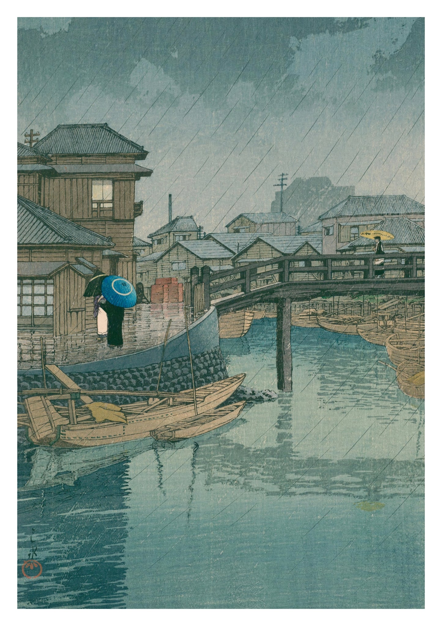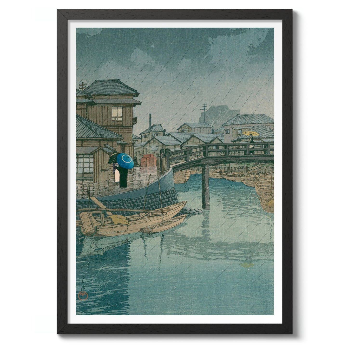 This "Rain in Shinagawa" poster by Kawase Hasui beautifully captures a serene riverside scene under a gentle rain. Traditional woodblock artistry highlights the tranquil blend of town, bridge, and evening atmosphere. The vintage Japanese style evokes peaceful village life, with muted colors enhancing the calm reflection of the town in the river and figures shielded under umbrellas, adding a touch of cultural authenticity.