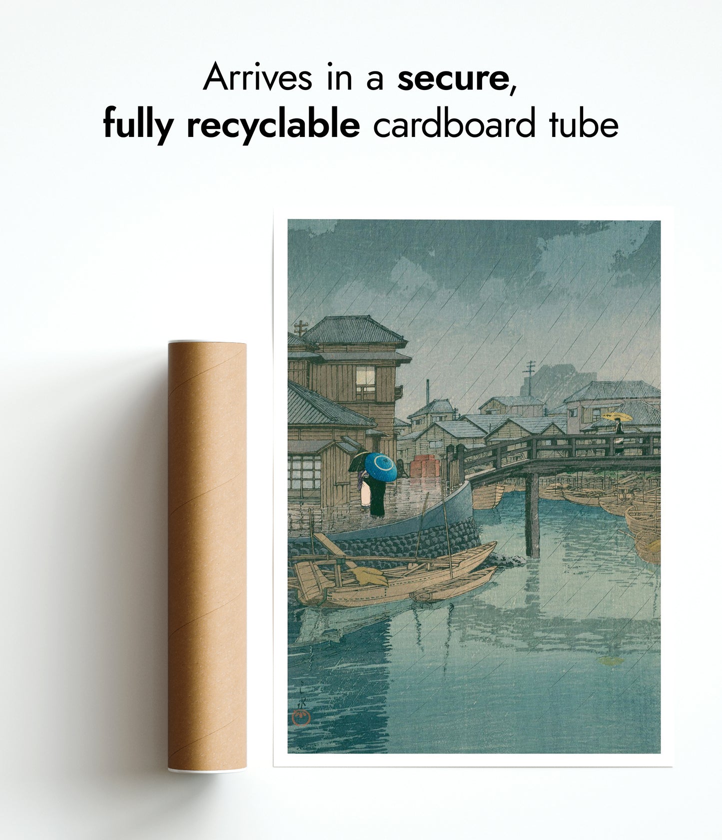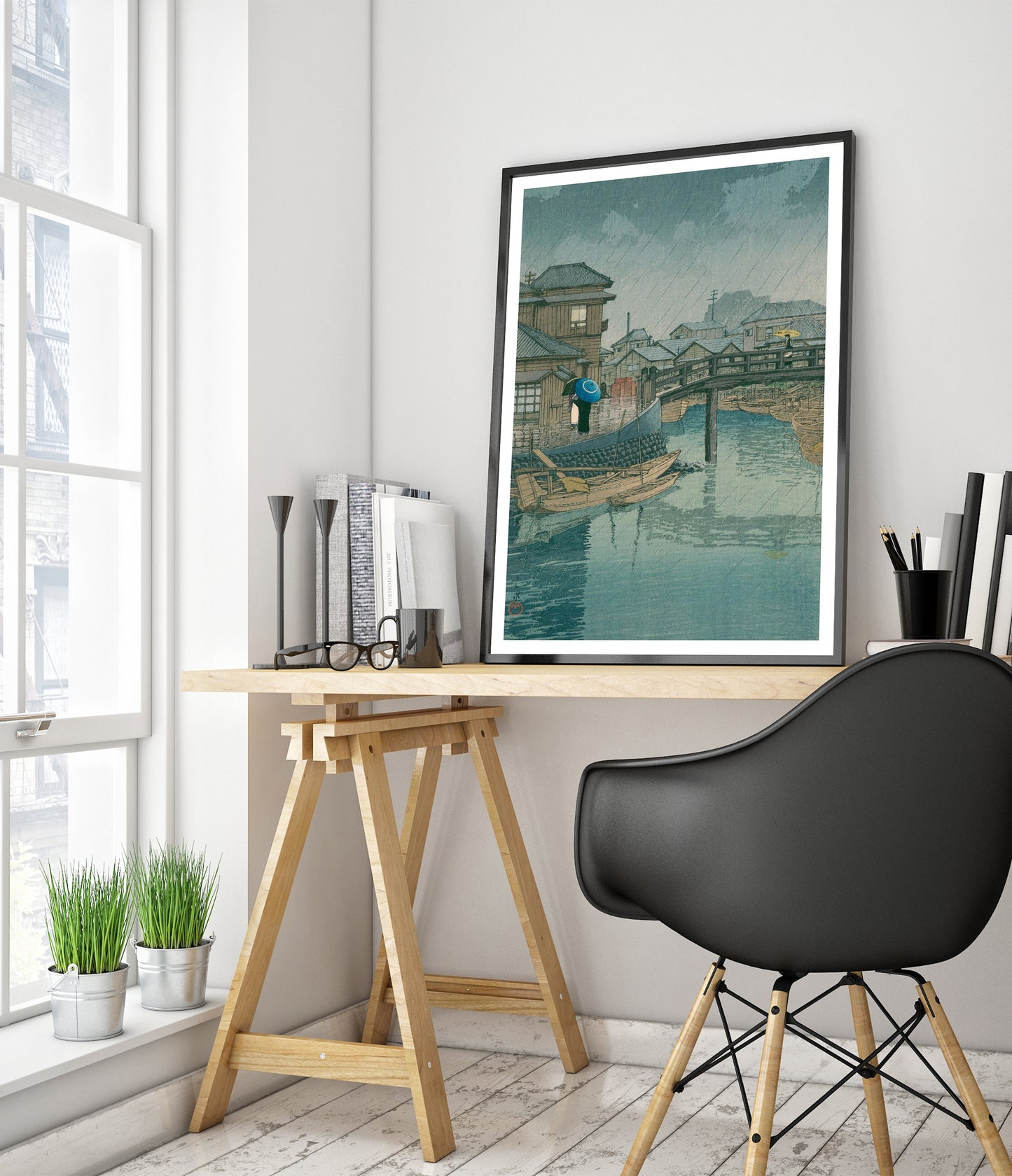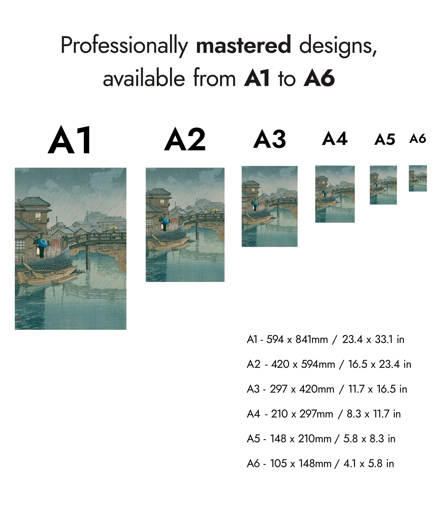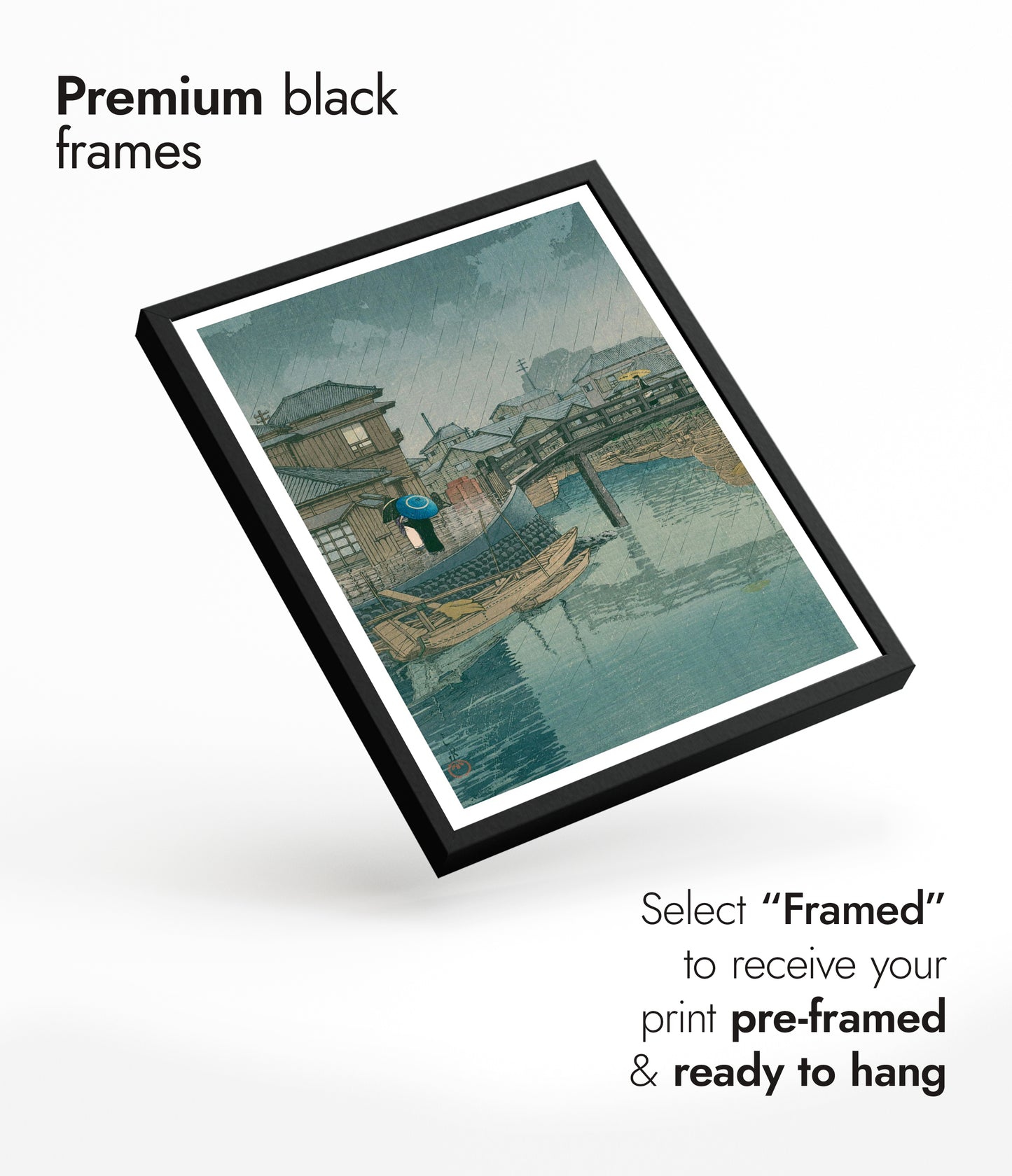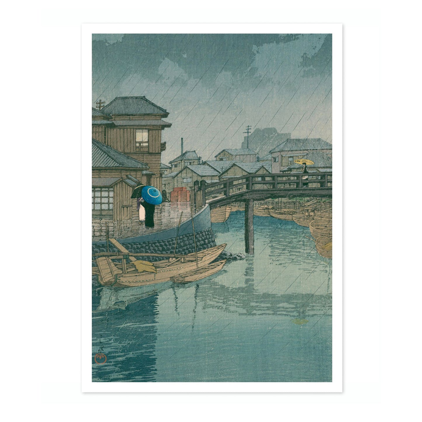 This "Rain in Shinagawa" poster by Kawase Hasui beautifully captures a serene riverside scene under a gentle rain. Traditional woodblock artistry highlights the tranquil blend of town, bridge, and evening atmosphere. The vintage Japanese style evokes peaceful village life, with muted colors enhancing the calm reflection of the town in the river and figures shielded under umbrellas, adding a touch of cultural authenticity.