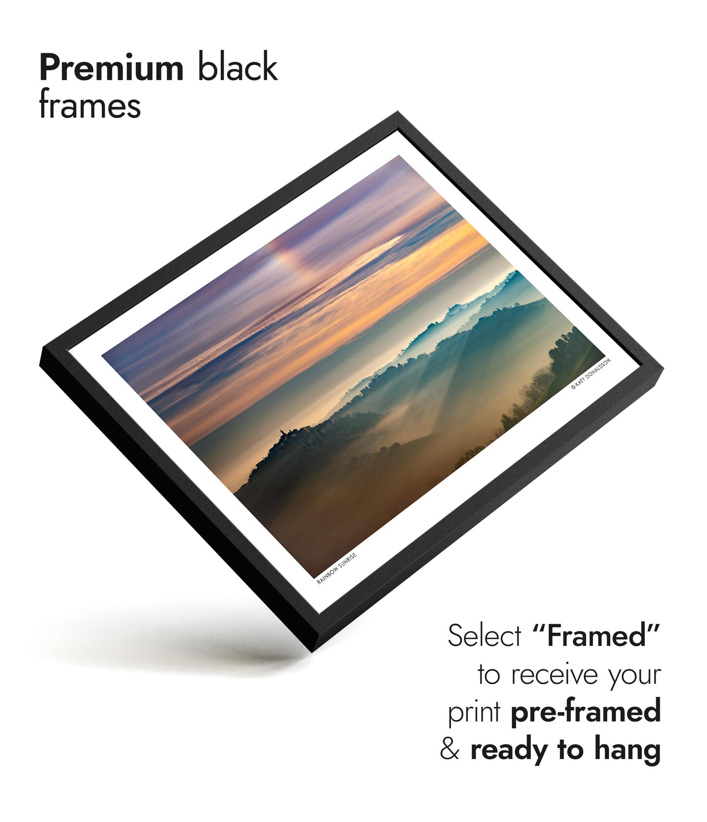 Solid wood frames available in black stained or natural finishes, with UV resistant acrylic glass. Framed orders arrive pre-installed with your choice of print, ready to hang. Available in all print sizes.