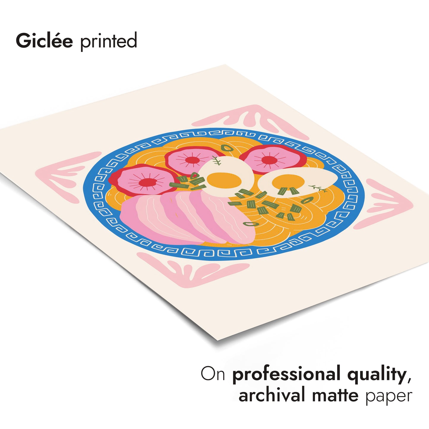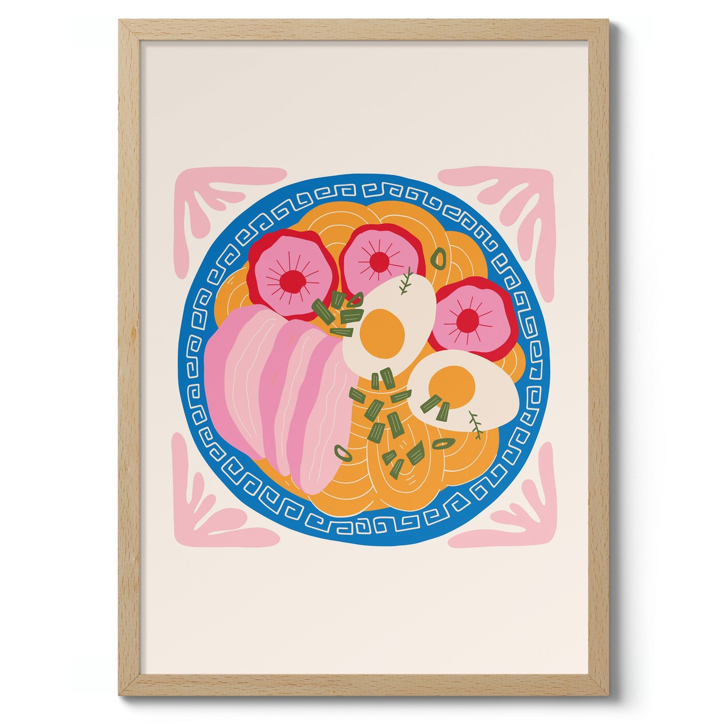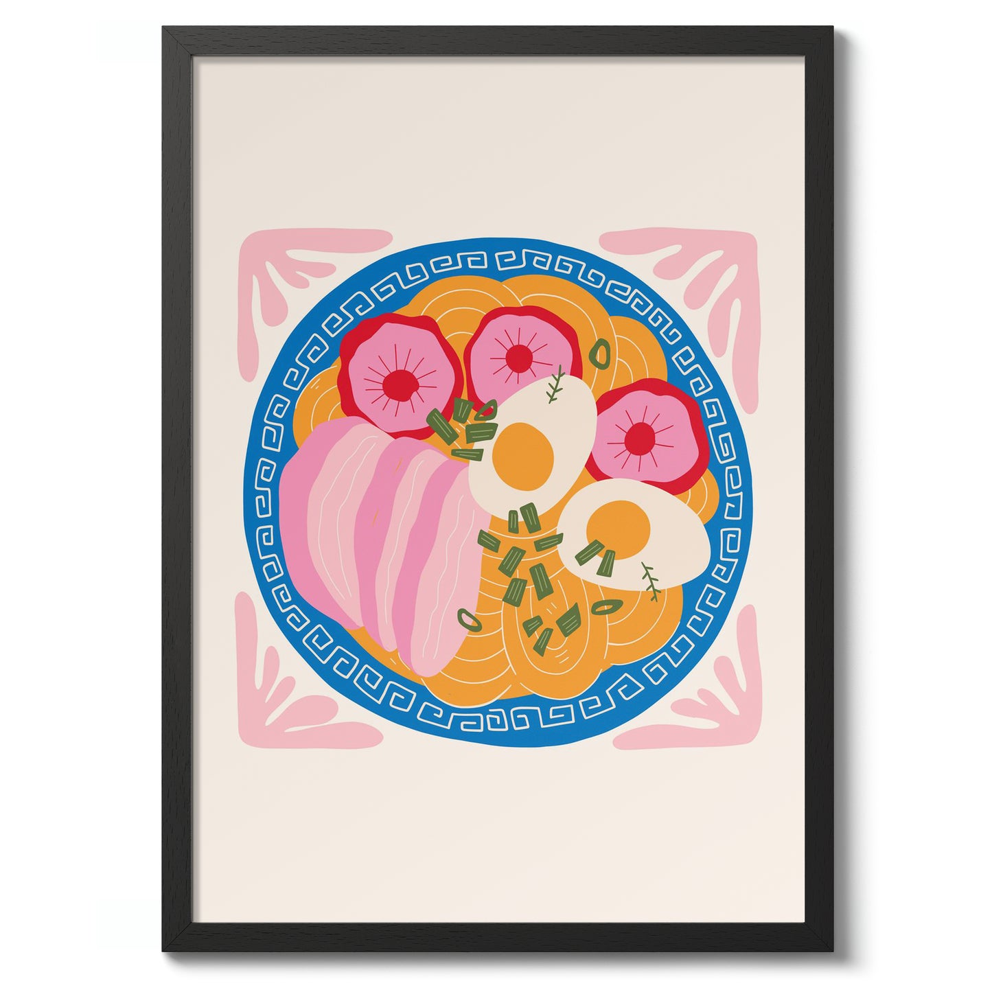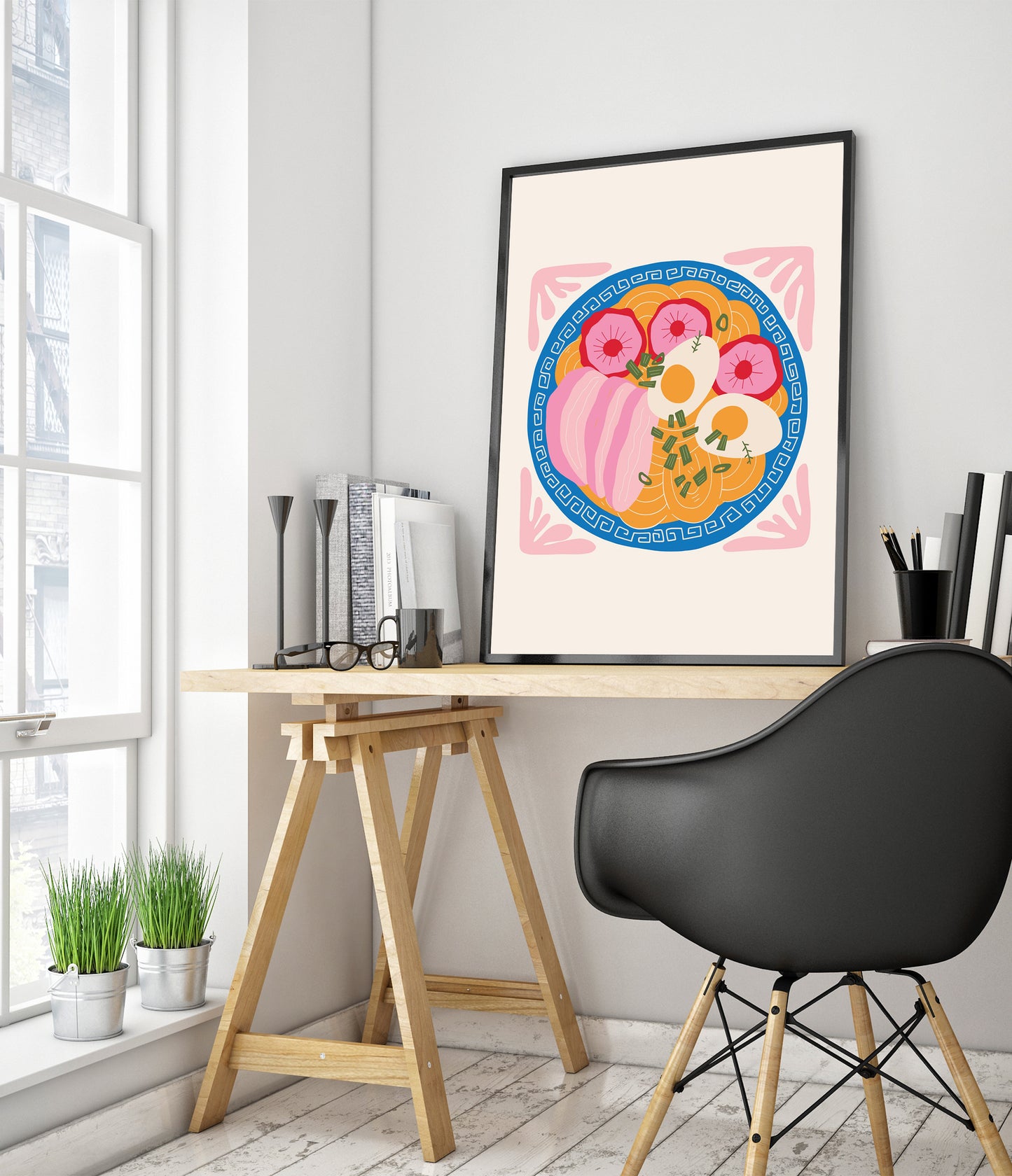 This modern graphic illustration poster features a vibrant ramen bowl, showcasing intricate slices of pork, halves of boiled eggs, and vibrant narutomaki, garnished with green onions. The contrasting colors of pink, blue, and orange create an eye-catching composition, perfect for kitchen-themed decor. The poster's playful style adds a contemporary touch, celebrating culinary artistry. Ideal for food enthusiasts and art lovers alike.