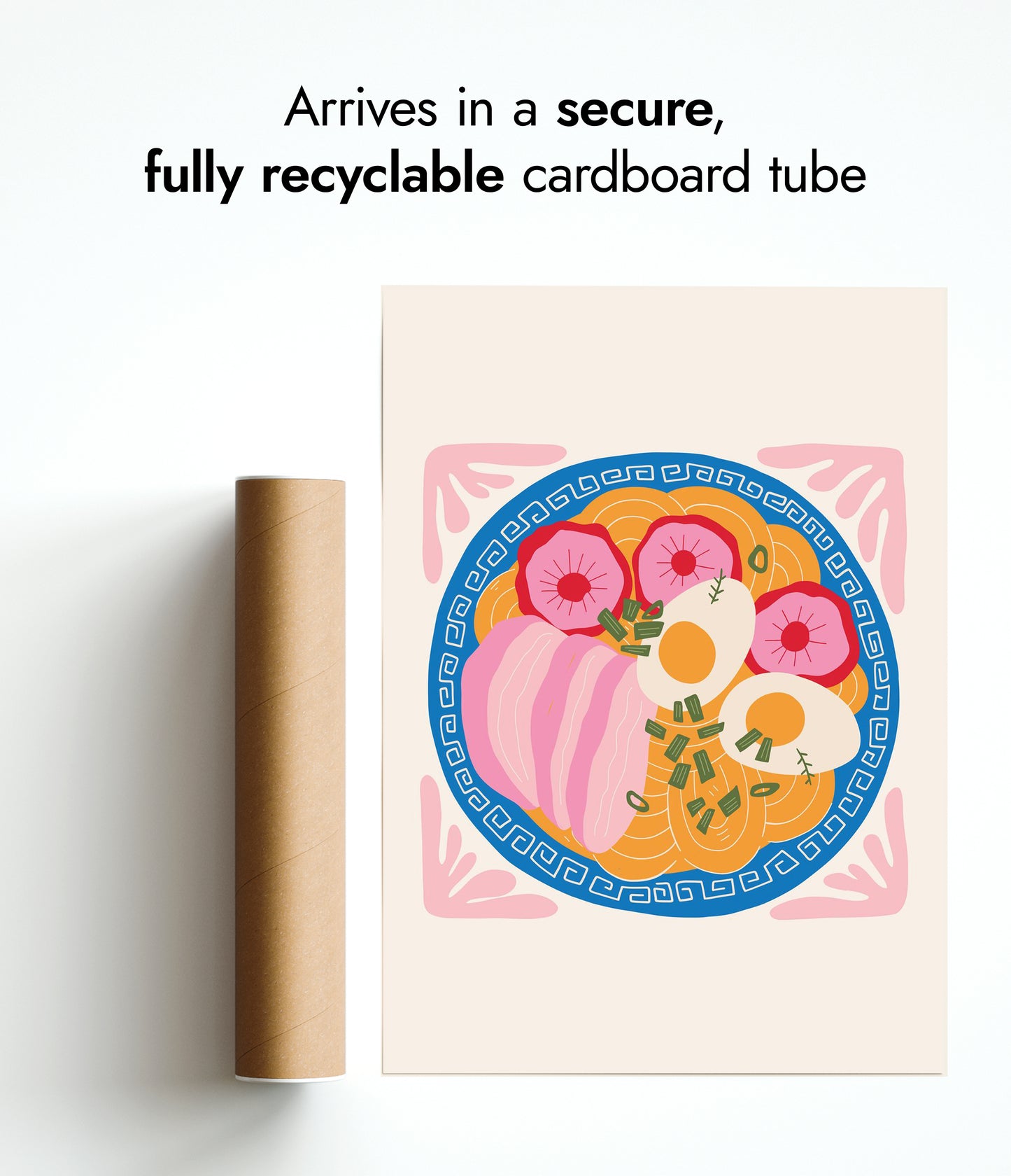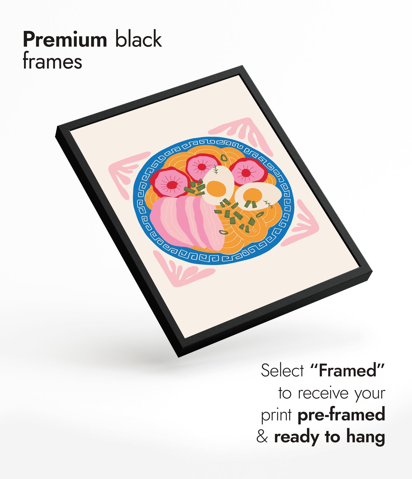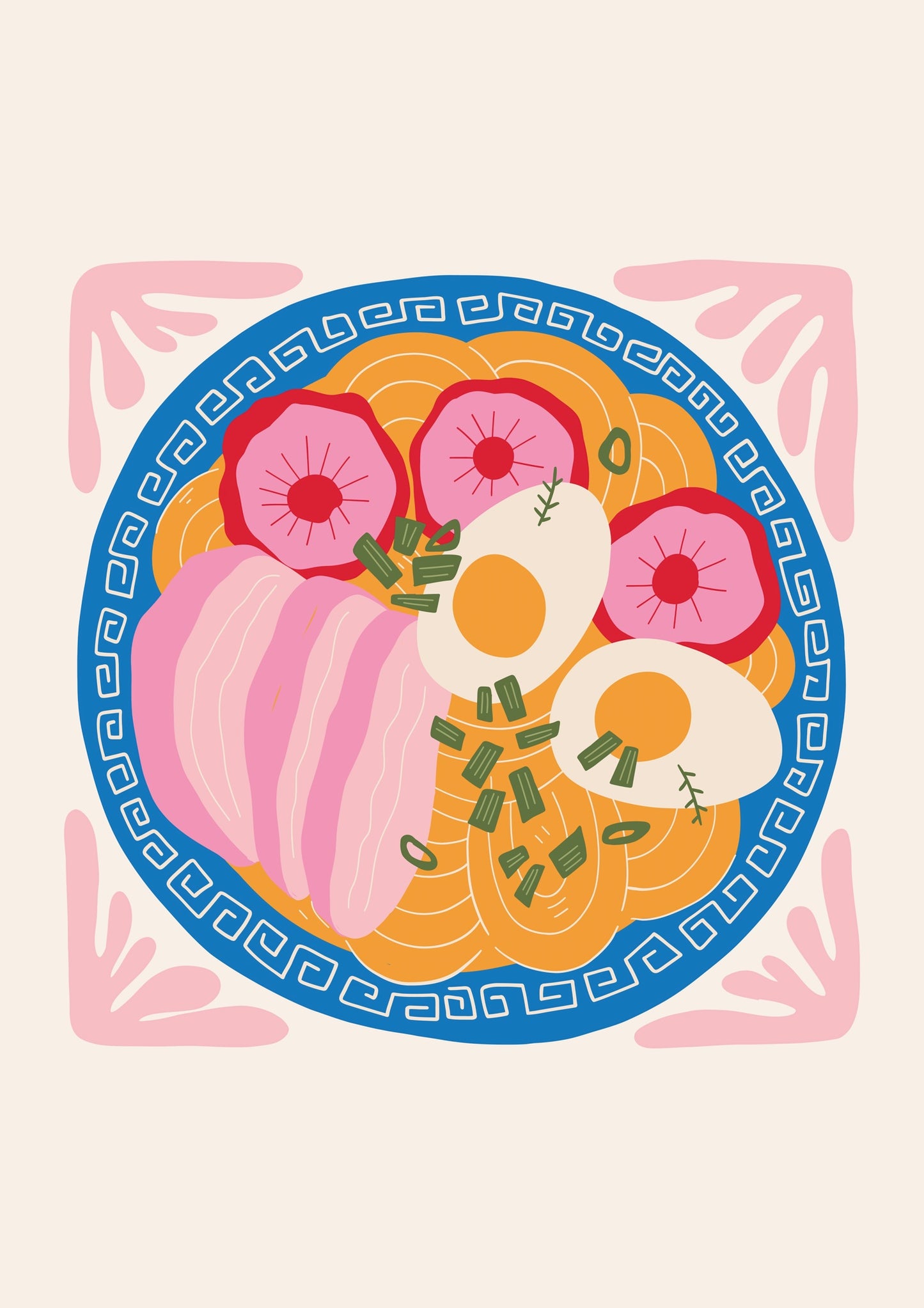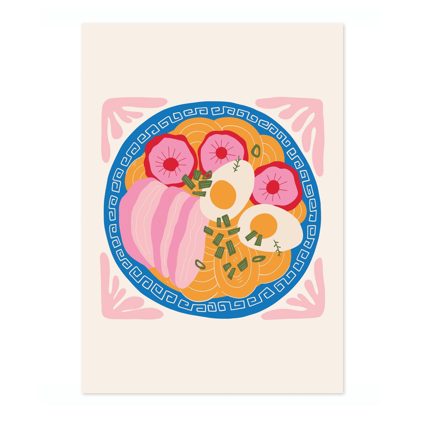 This modern graphic illustration poster features a vibrant ramen bowl, showcasing intricate slices of pork, halves of boiled eggs, and vibrant narutomaki, garnished with green onions. The contrasting colors of pink, blue, and orange create an eye-catching composition, perfect for kitchen-themed decor. The poster's playful style adds a contemporary touch, celebrating culinary artistry. Ideal for food enthusiasts and art lovers alike.