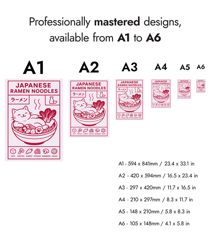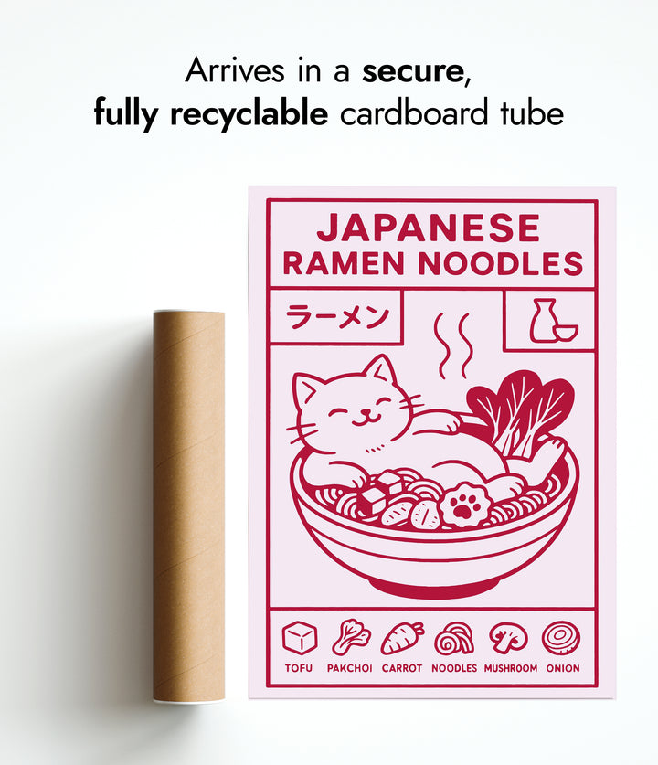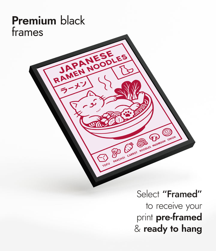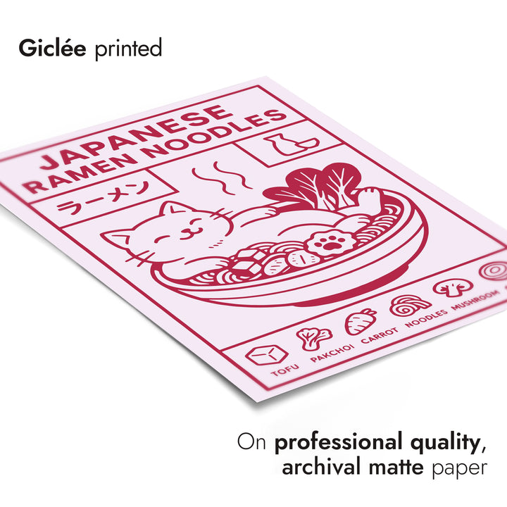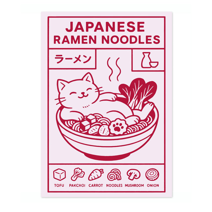 This charming poster features a contented cat lounging in a steaming bowl of ramen, blending anime aesthetics with playful Japanese elements. Illustrated in pink graphic style, it highlights ingredients like tofu, pak choi, and mushrooms, emphasizing a love for Japanese cuisine. Ideal for fans of kawaii culture and food-inspired art, this piece infuses culinary charm with cute appeal.