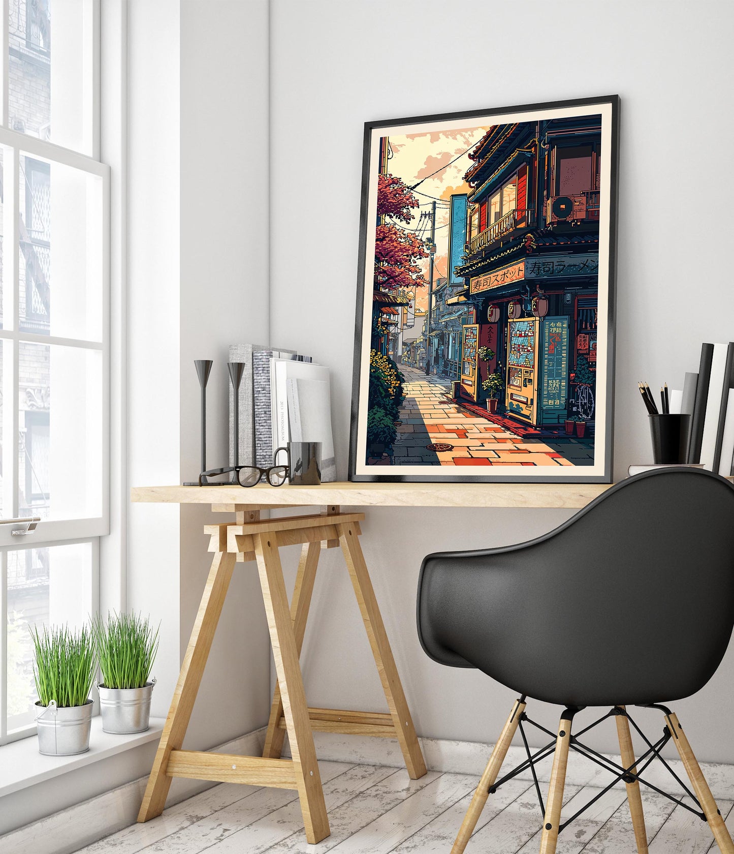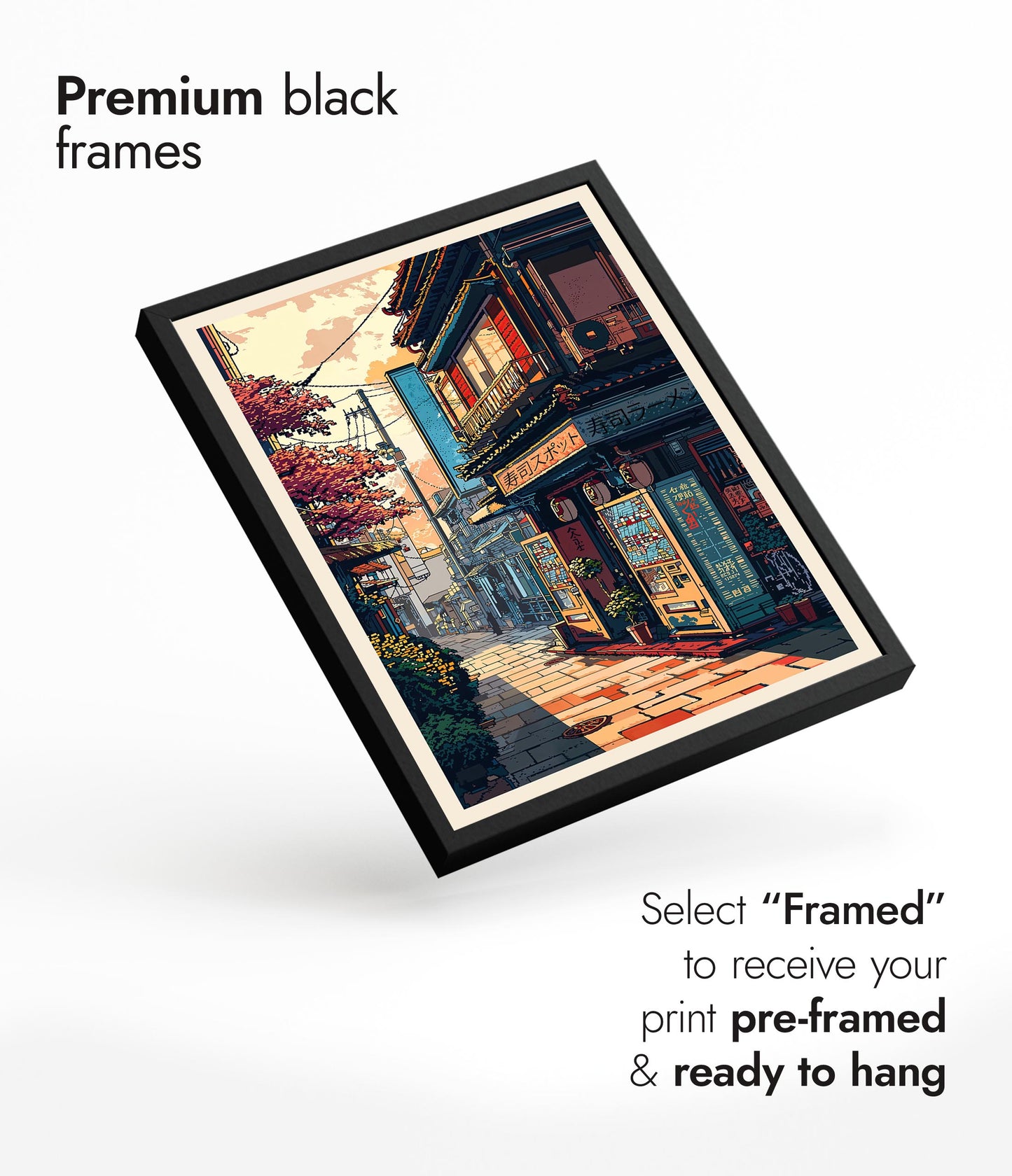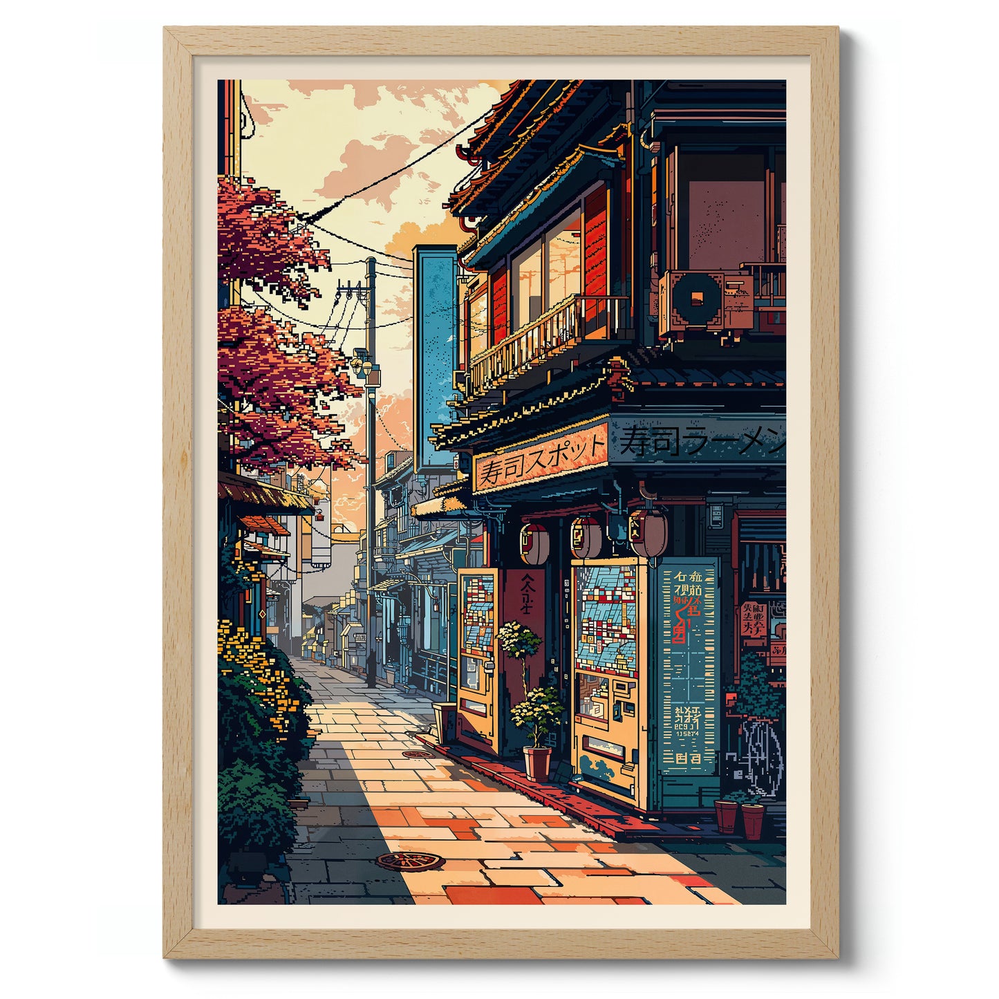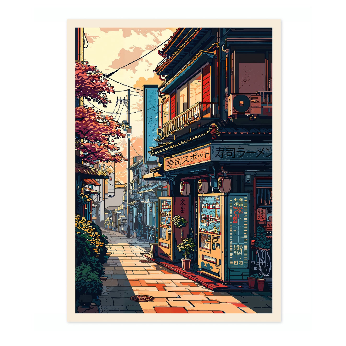This poster, titled "Ramen Vending Machine," features a charming Japanese street scene beautifully illustrated in an anime style. The artwork captures the essence of a bustling ramen shop corner, adorned with traditional signage and set under the warm hues of a setting sun. The intricate details of the vending machine and blossoming trees evoke a nostalgic ambiance, transporting viewers to a serene Japanese neighborhood.
