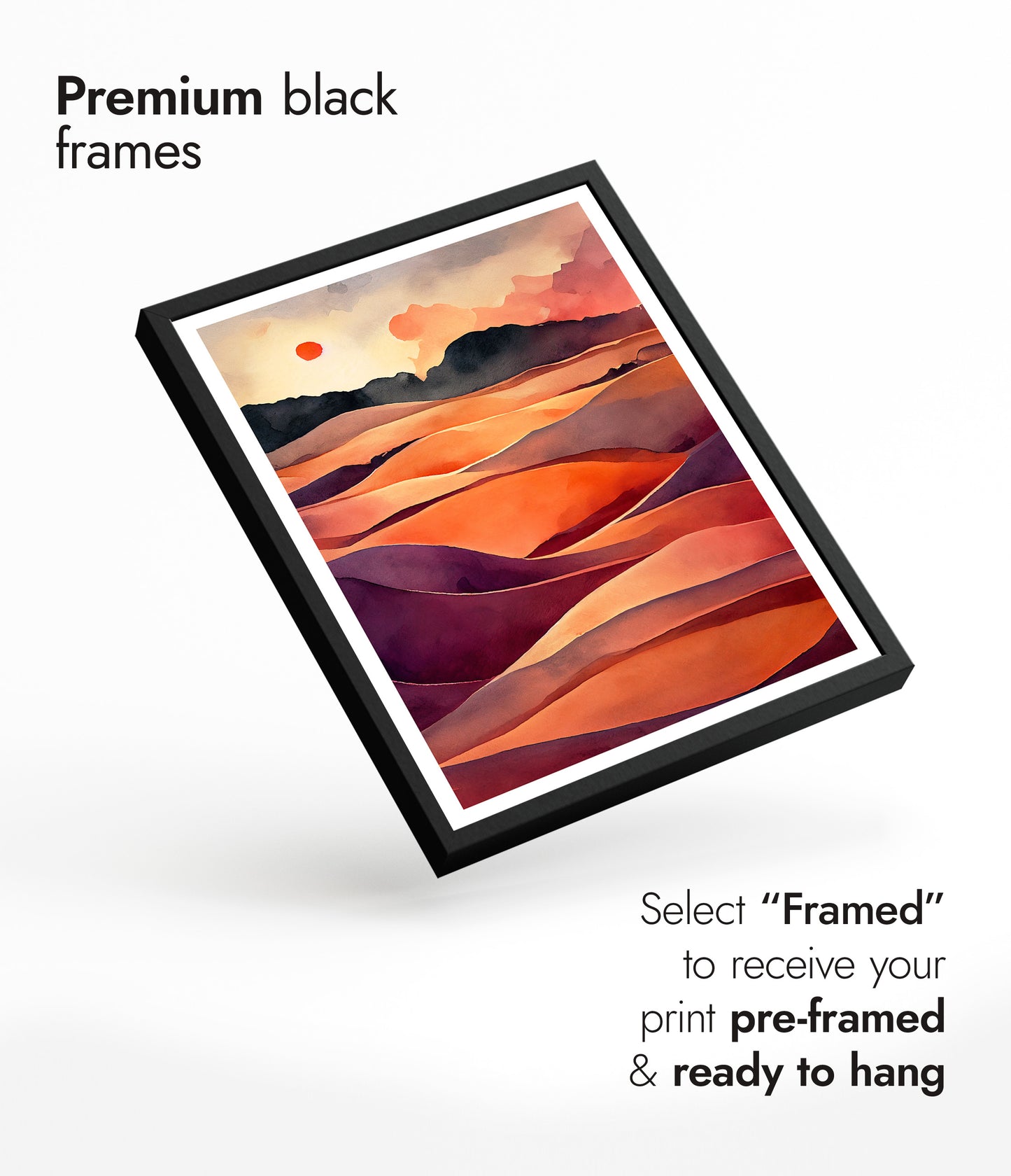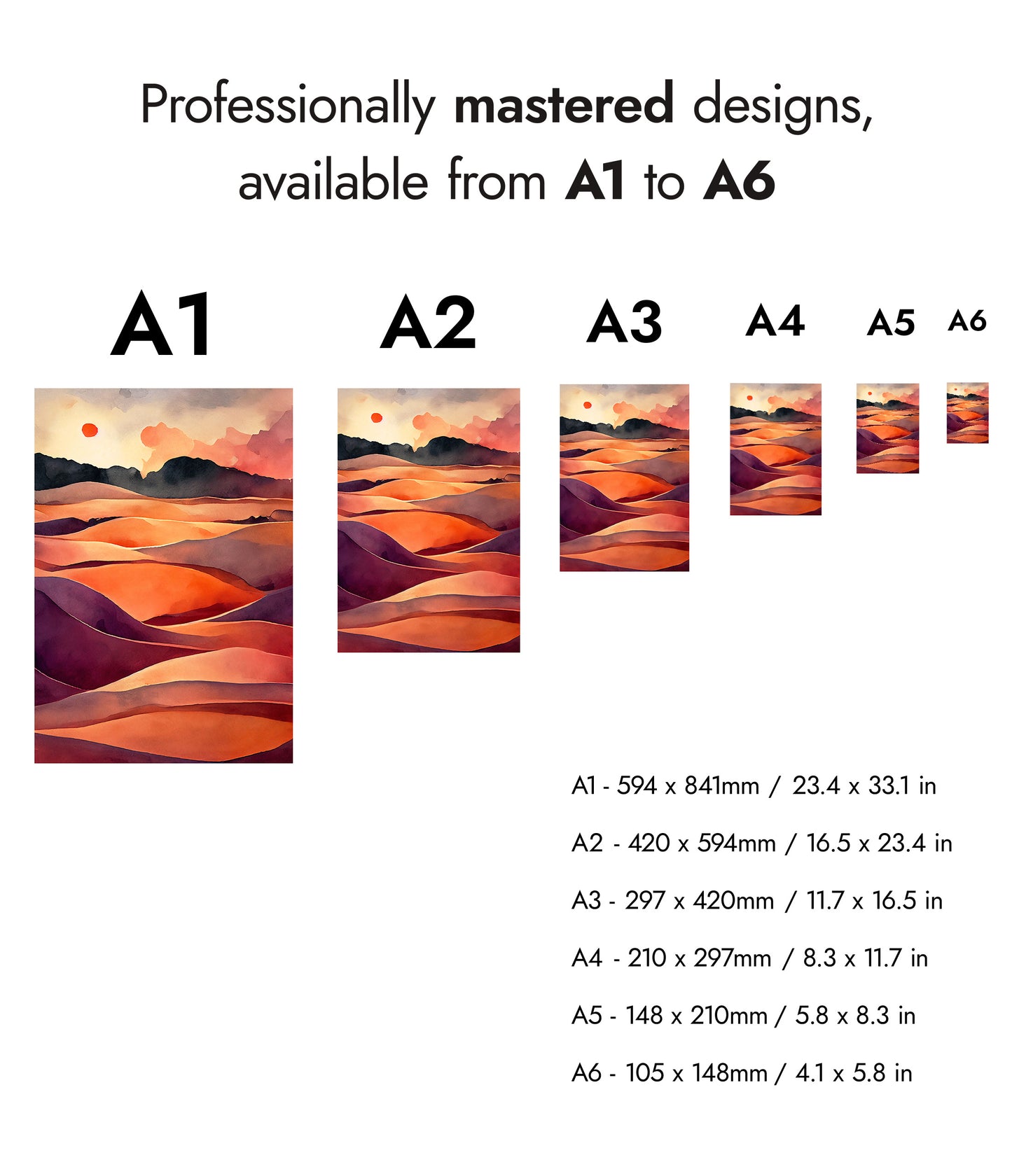 This "Red Desert" watercolour poster captures the serene beauty of a sun-drenched desert landscape. The abstract portrayal features rolling sand dunes bathed in shades of red and orange, contrasted by a setting sun and distant mountains. Ideal for adding a touch of artistic warmth to any space, this artwork celebrates the captivating allure of desert sunsets.