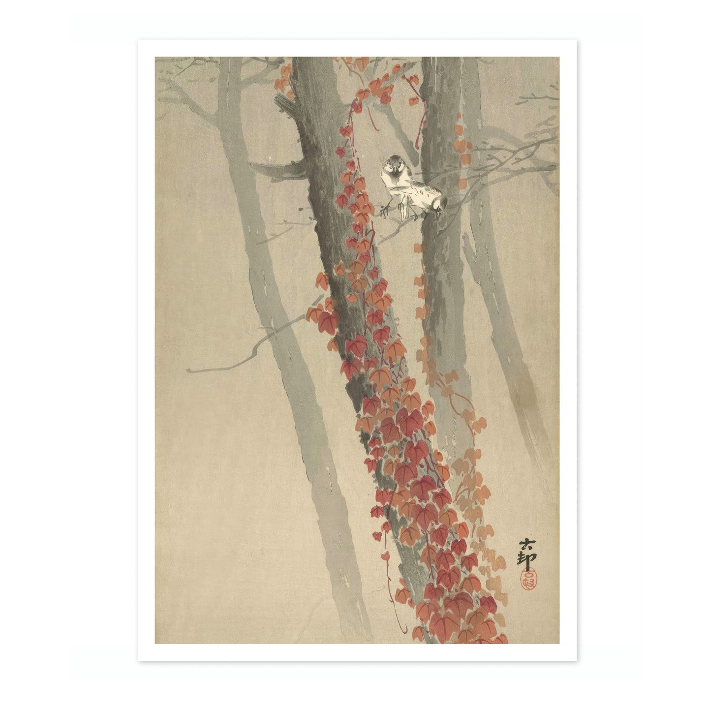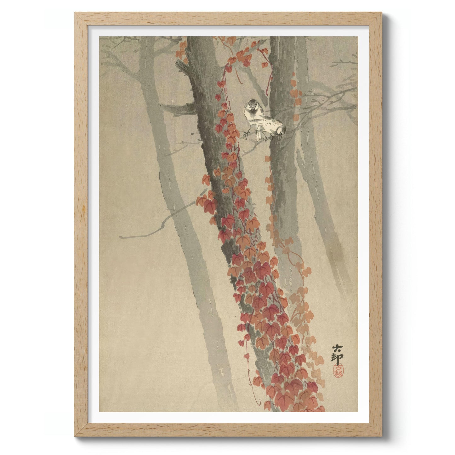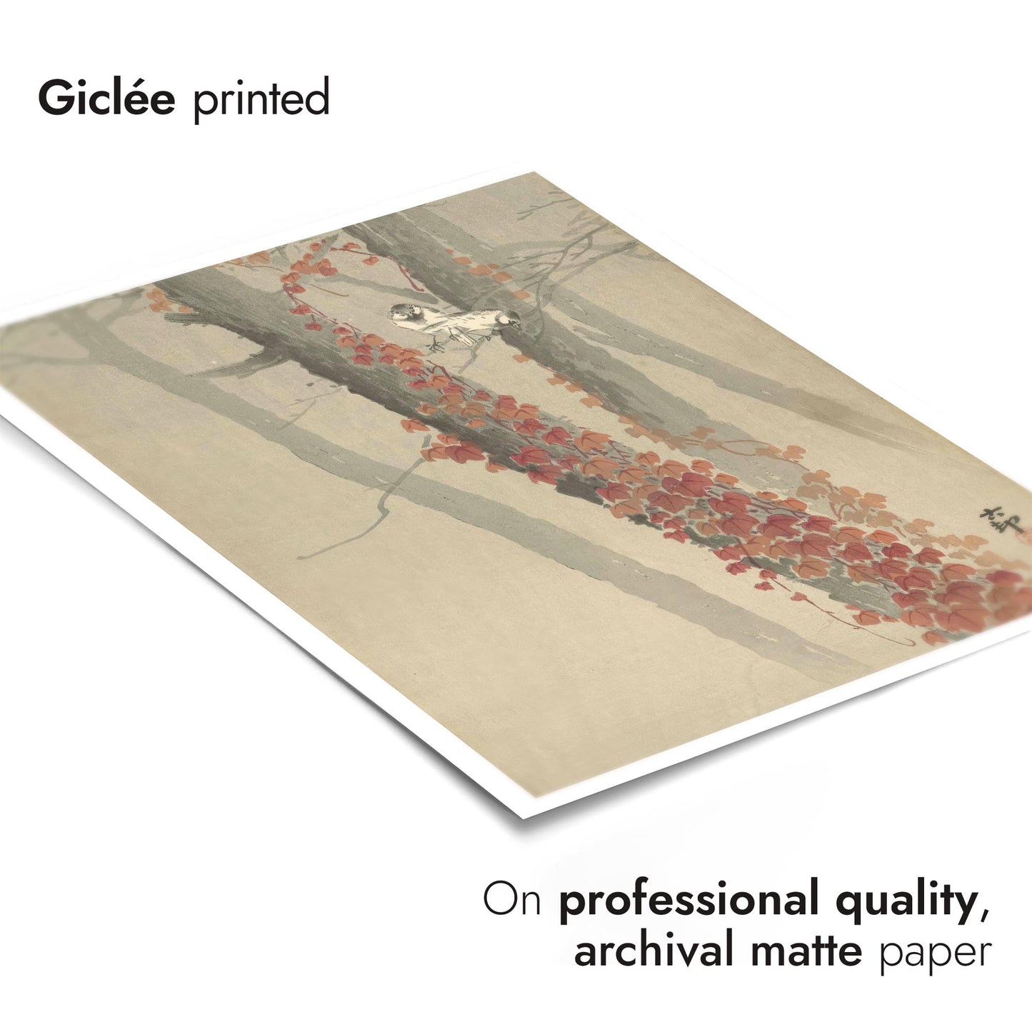 Ohara Koson's "Red Ivy" poster showcases a serene traditional woodblock illustration. A delicate bird perches on a tree enveloped in vibrant red ivy, contrasting beautifully with the muted background. This Japanese ukiyo-e print captures the timeless elegance of nature through detailed depictions of leaves and serene forest ambiance, making it a perfect addition for traditional art lovers.
