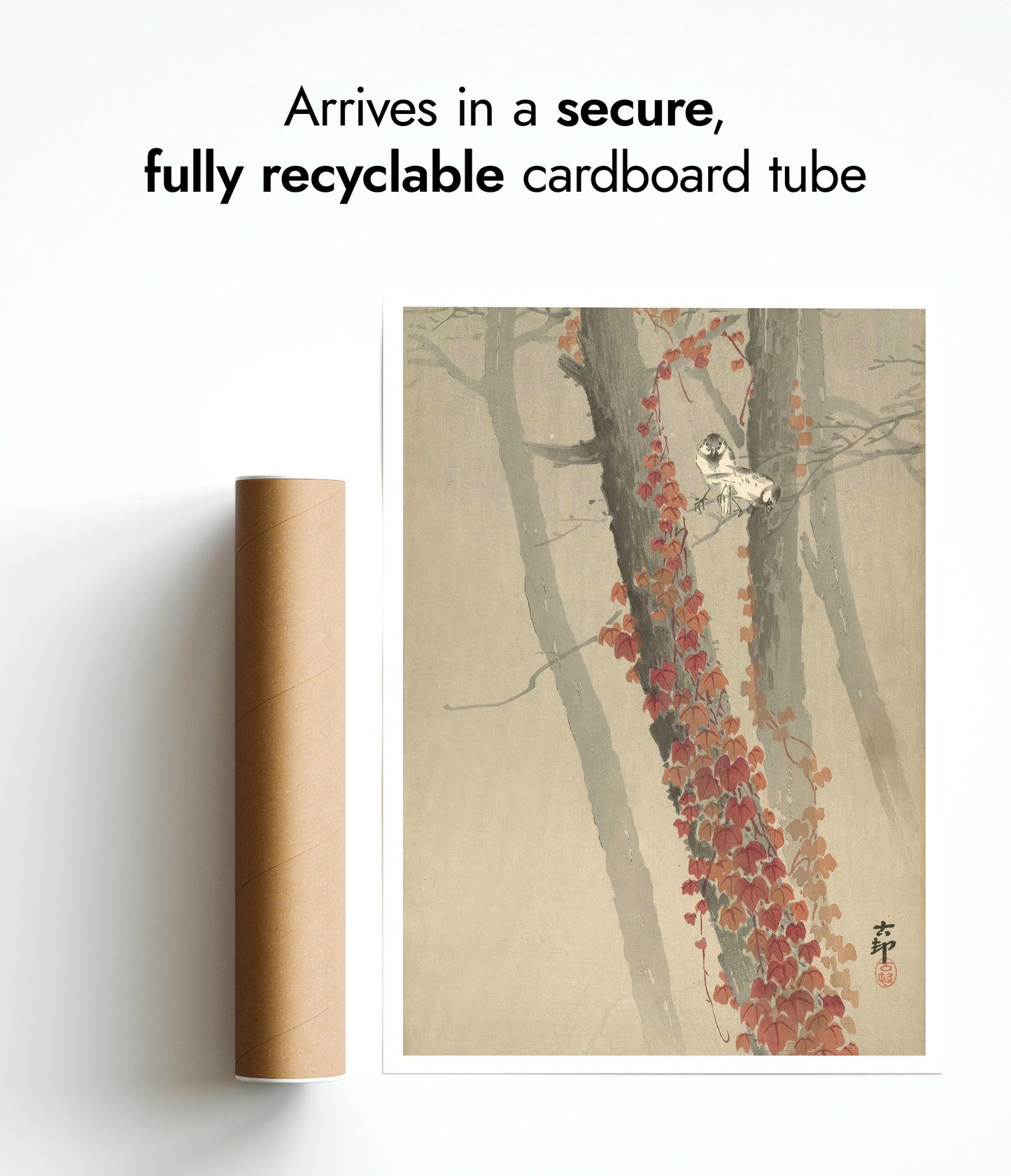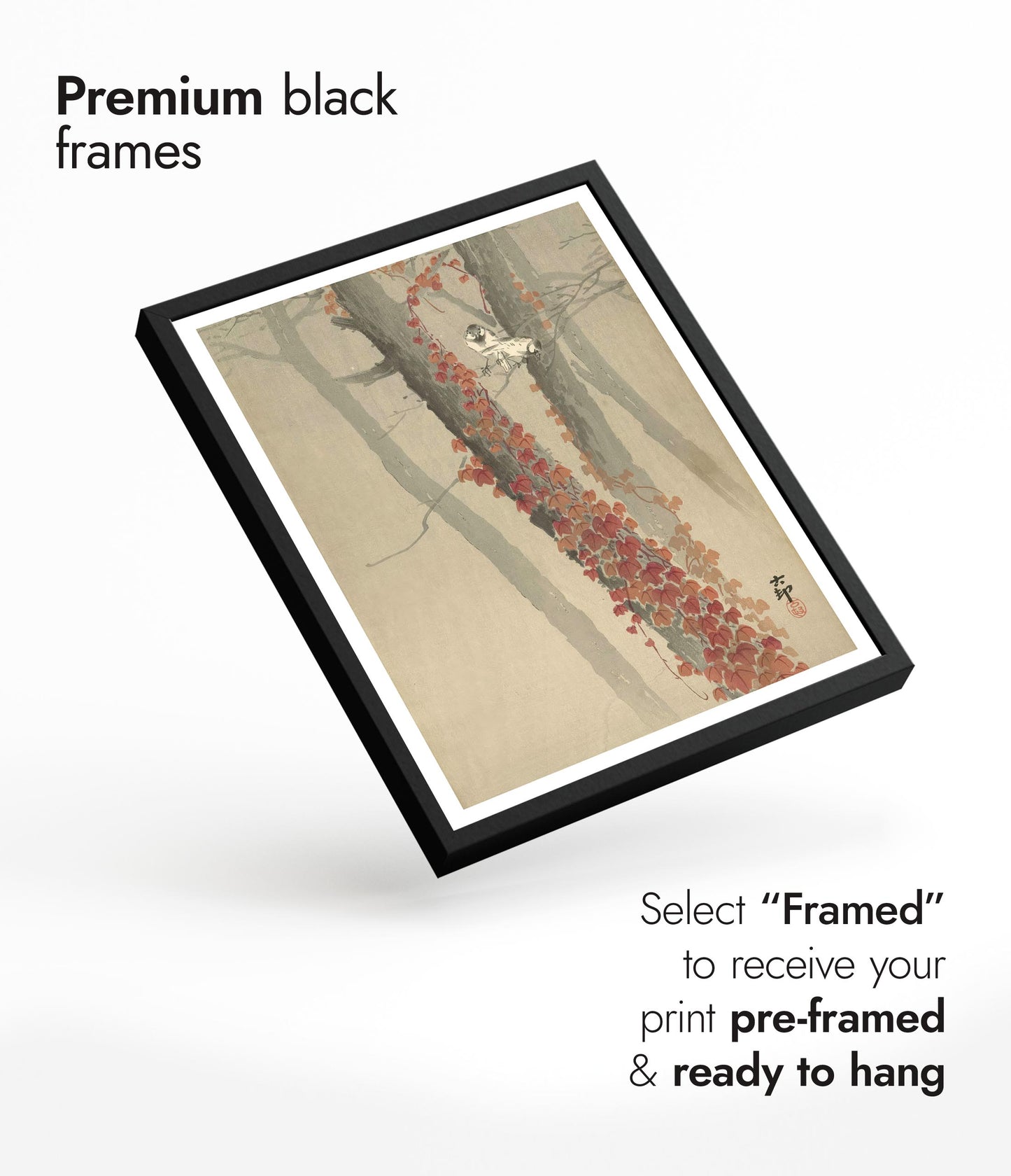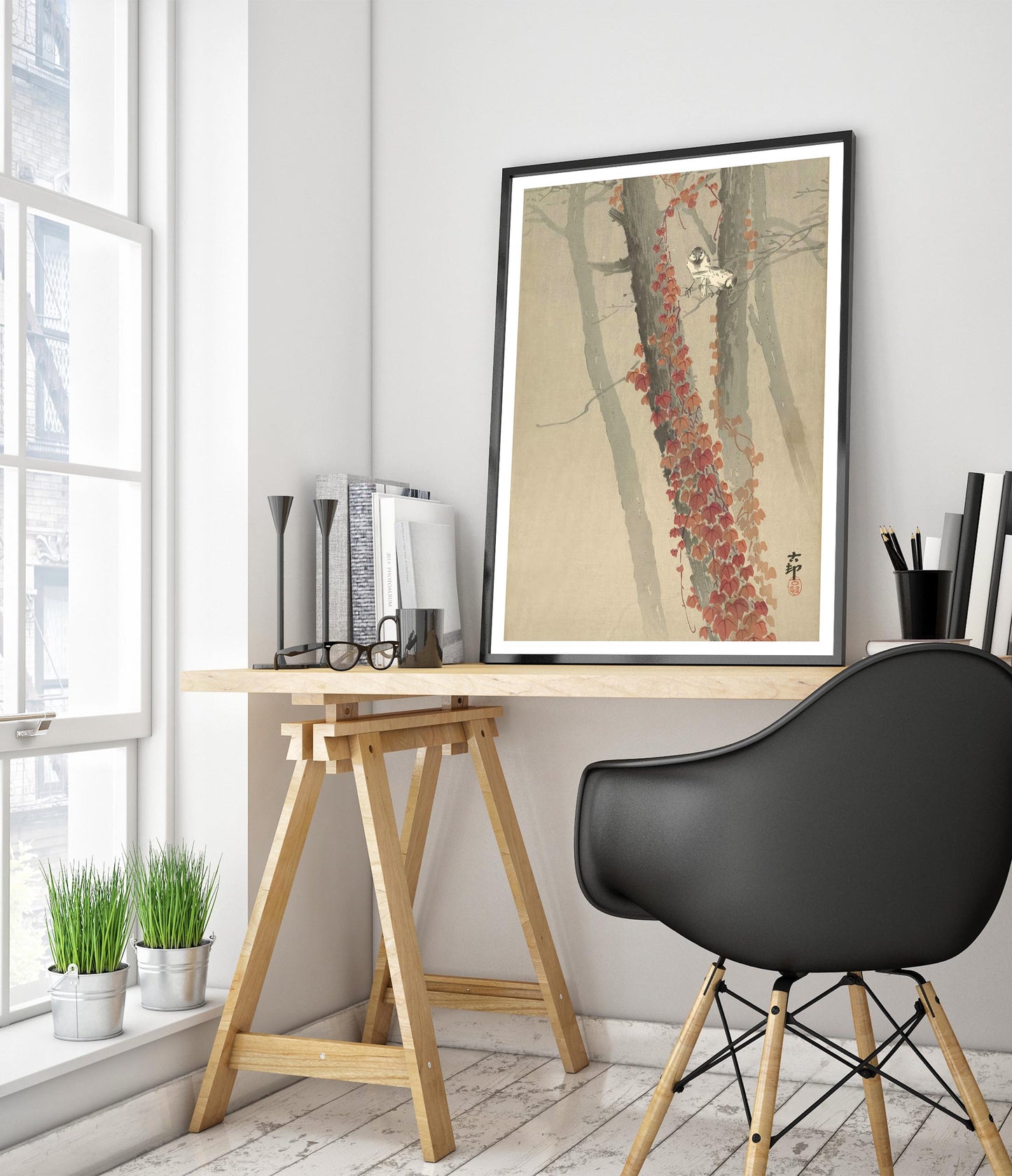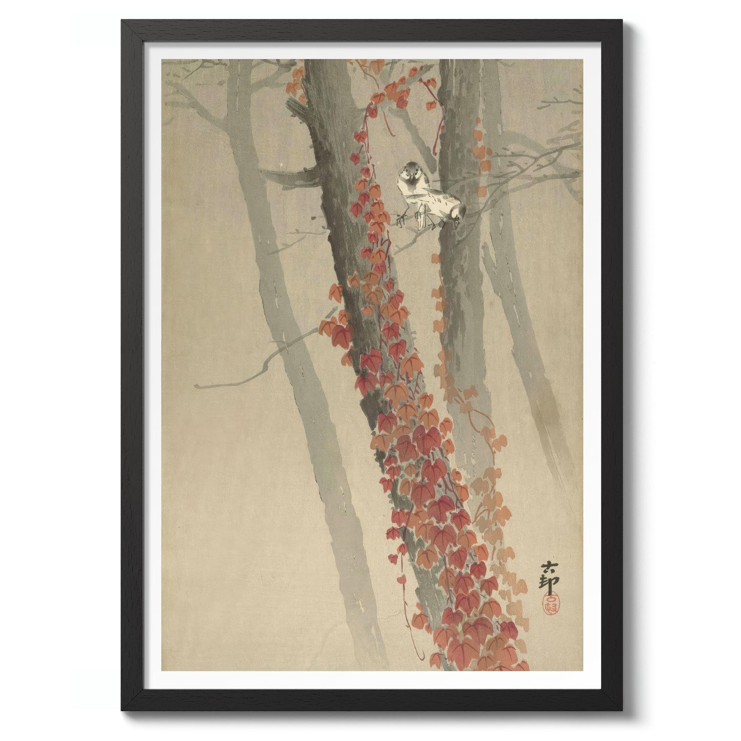 Ohara Koson's "Red Ivy" poster showcases a serene traditional woodblock illustration. A delicate bird perches on a tree enveloped in vibrant red ivy, contrasting beautifully with the muted background. This Japanese ukiyo-e print captures the timeless elegance of nature through detailed depictions of leaves and serene forest ambiance, making it a perfect addition for traditional art lovers.
