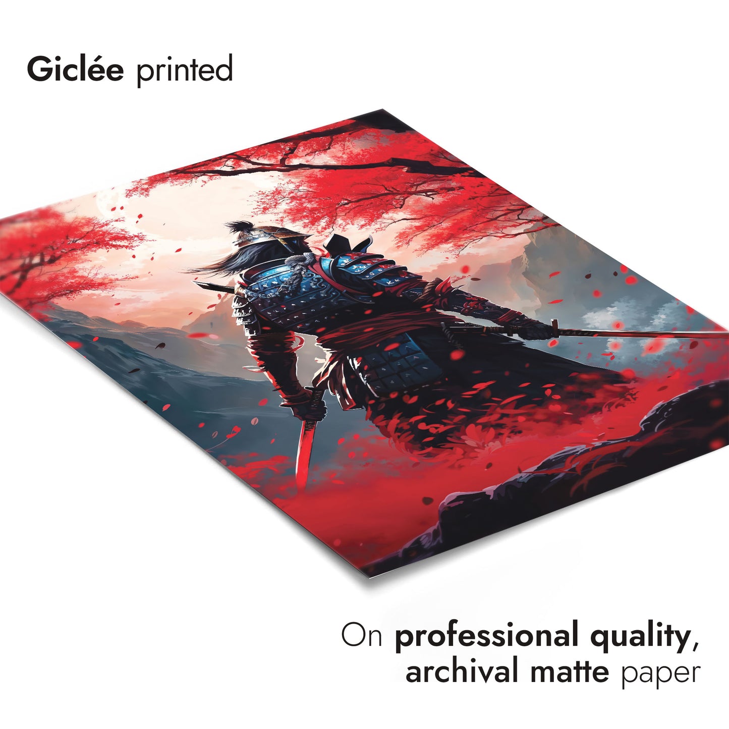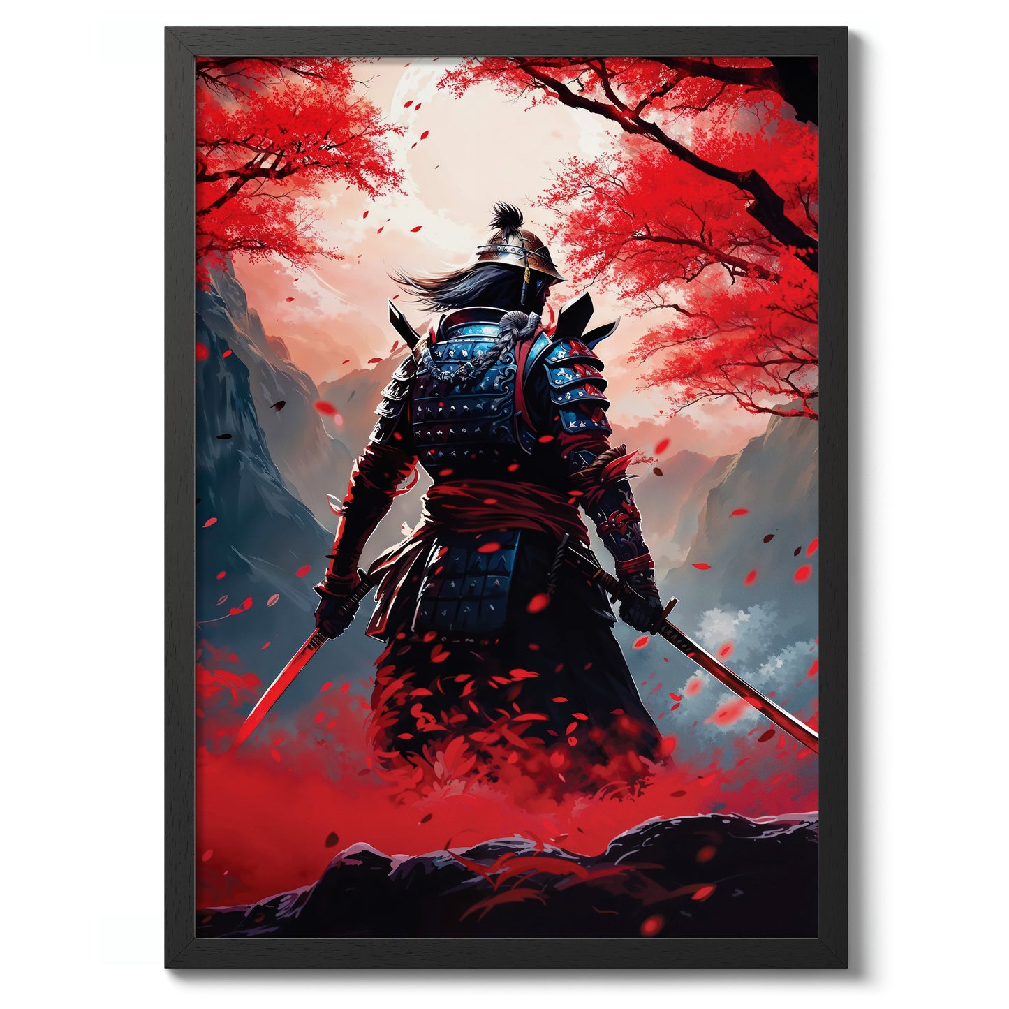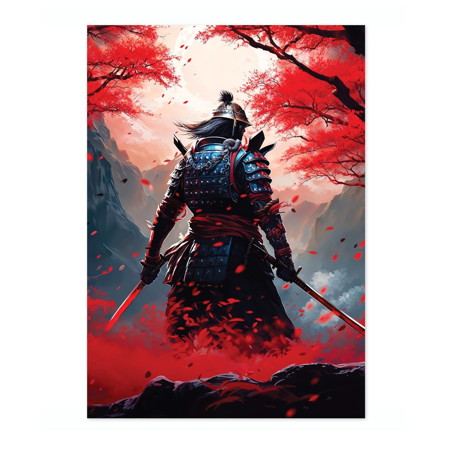 The "Red Samurai" poster captures a lone samurai warrior standing amidst a vibrant field of red blossoms. Set against a mountainous backdrop, the image highlights the intricacies of traditional samurai armor contrasted with the serene, yet intense fall foliage. Perfect for fans of anime and Japanese culture, this illustration brings modern artistry to the legendary samurai spirit.