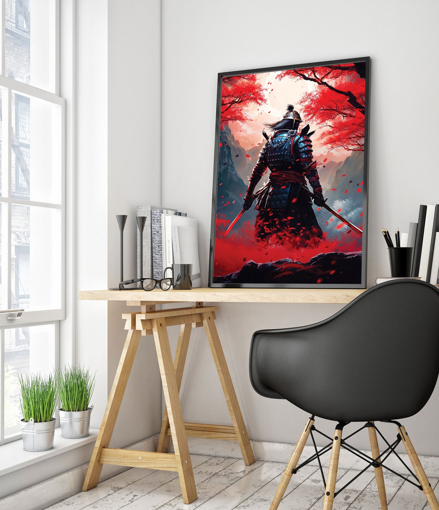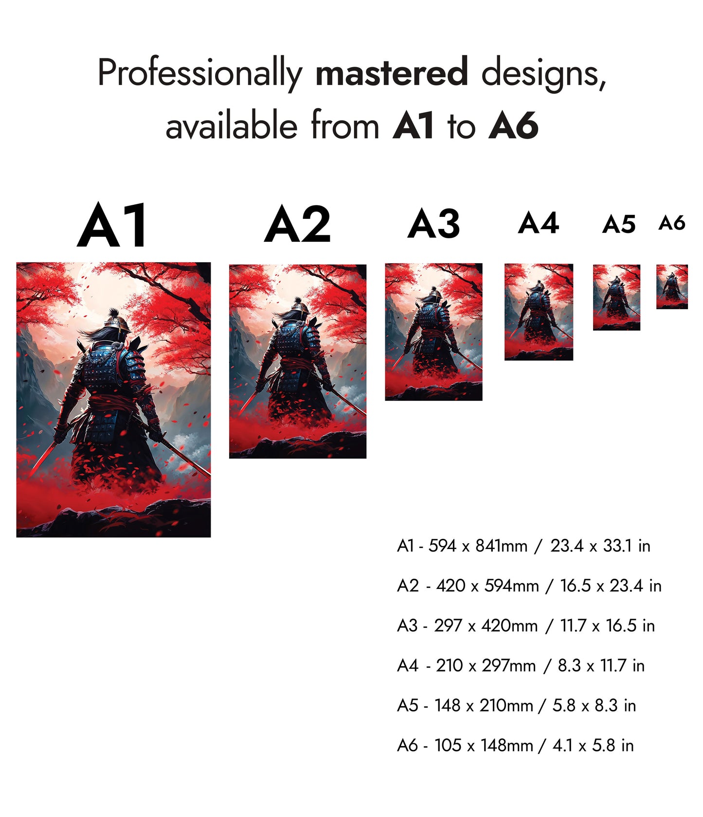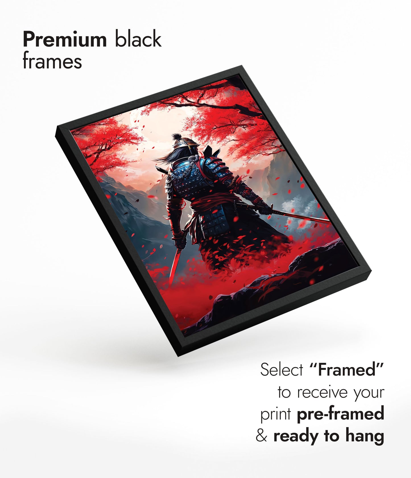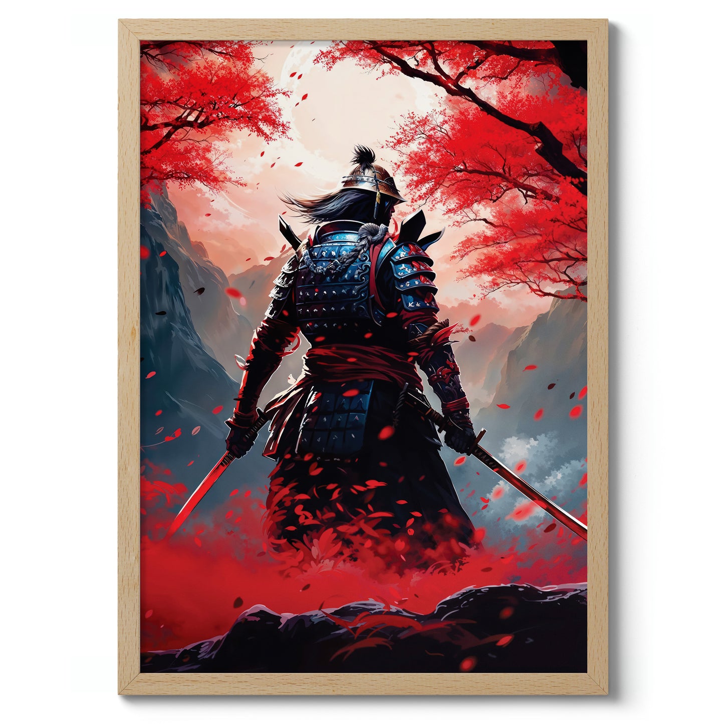 The "Red Samurai" poster captures a lone samurai warrior standing amidst a vibrant field of red blossoms. Set against a mountainous backdrop, the image highlights the intricacies of traditional samurai armor contrasted with the serene, yet intense fall foliage. Perfect for fans of anime and Japanese culture, this illustration brings modern artistry to the legendary samurai spirit.