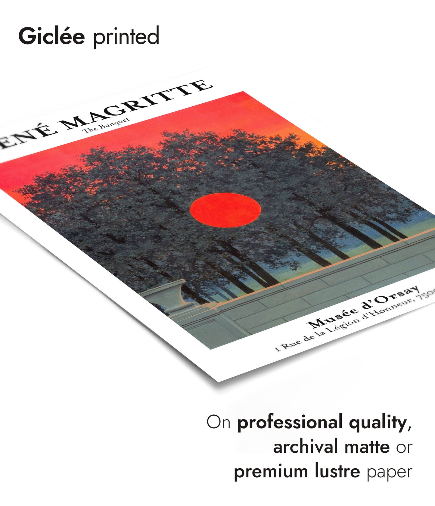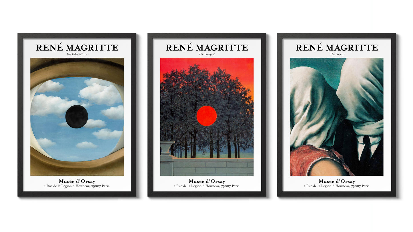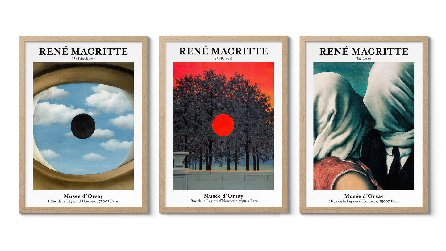 This set of three René Magritte posters beautifully captures the essence of surrealism, featuring distinct elements like an enigmatic eye, a forest at sunset, and an abstract couple. Each poster is representative of Magritte's unique, thought-provoking style, offering viewers a glimpse into his imaginative and dream-like worlds. Ideal for art enthusiasts, these prints are perfect for adding a touch of the surreal to any space.