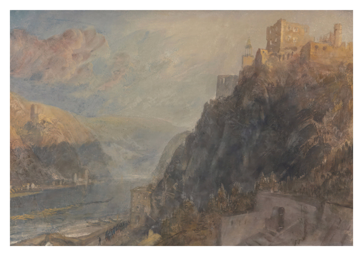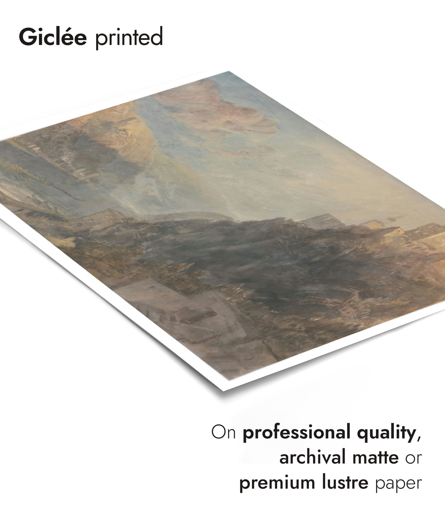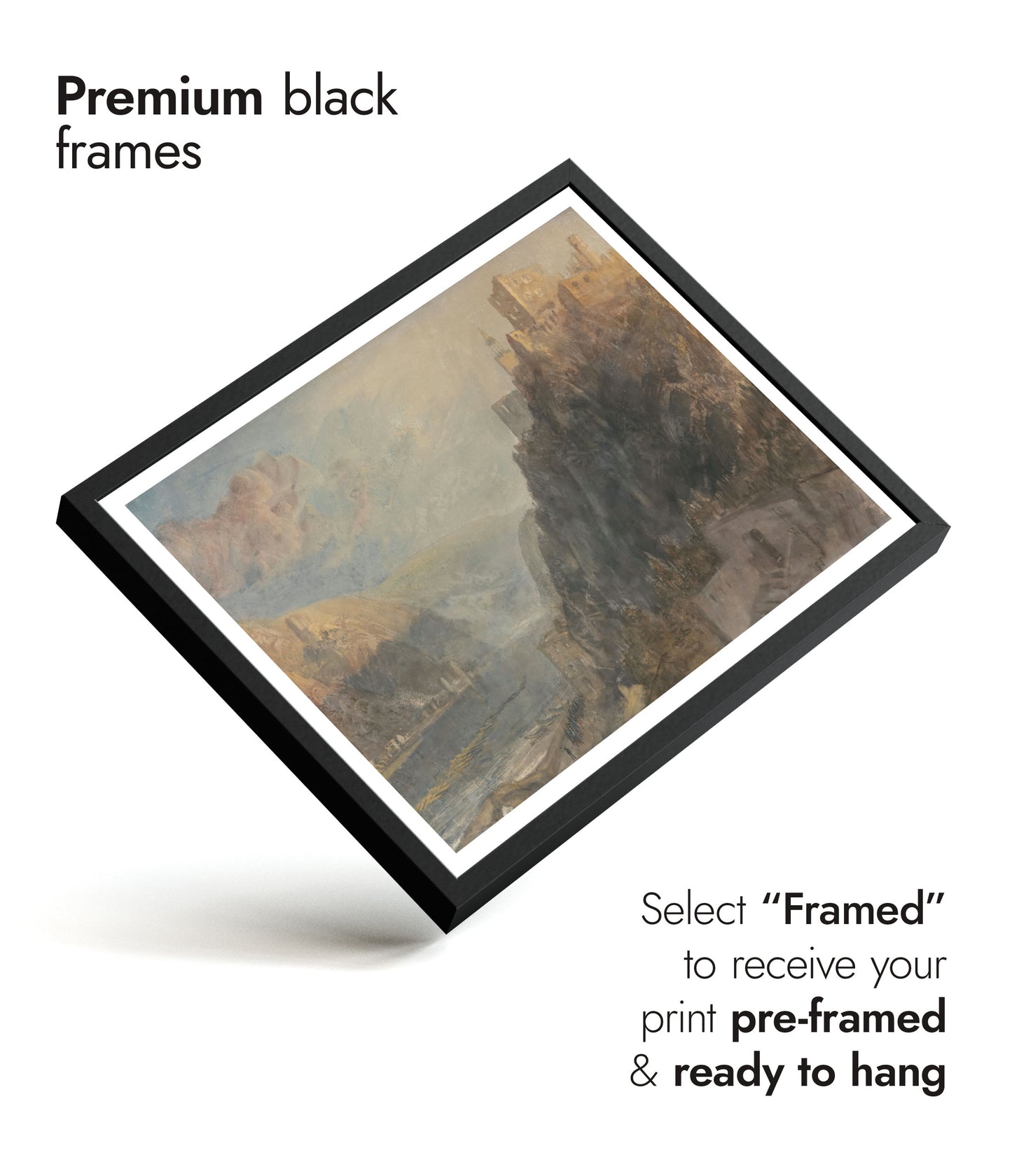This poster, "Rheinfels Looking to Katz and Gourhausen" by J. M. W. Turner, captures a serene German landscape in a Romantic style. The painting showcases a picturesque cliffside village overlooking a winding river valley, enveloped in soft, muted tones. Turner's masterful use of light and shadow enhances the tranquil, atmospheric quality of this European scene. Ideal for landscape and Romanticism art enthusiasts.