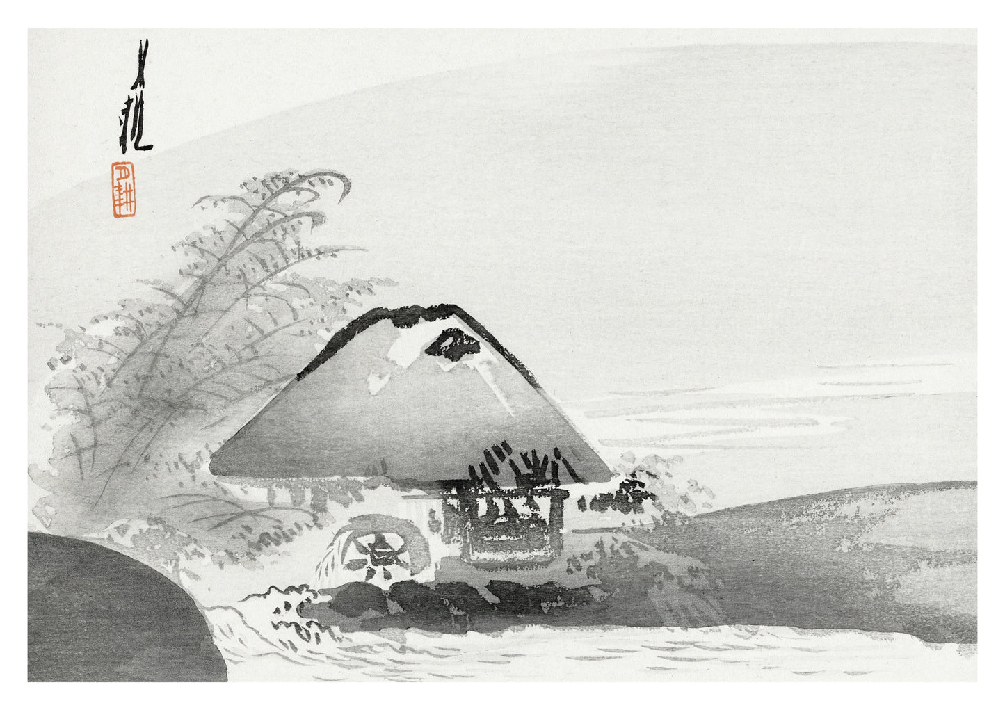 This "River Landscape" poster by Ogata Gekko beautifully captures a serene Japanese countryside scene. Featuring a quaint cottage nestled by a flowing river, complemented by delicate bamboo and gentle waves. Rendered in traditional Japanese painting style, this artwork exudes tranquility and nature's simplicity. Perfect for adding a touch of cultural elegance to any space.