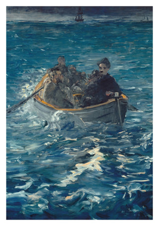 This poster features Édouard Manet's iconic painting, "Rochefort's Escape." The impressionistic artwork captures the dramatic scene of a small boat in choppy blue waters, emphasizing the movement of the waves and the urgency of the escape. The dark, muted figures in the boat contrast with the vibrant sea, creating a dynamic maritime scene full of emotion and tension.