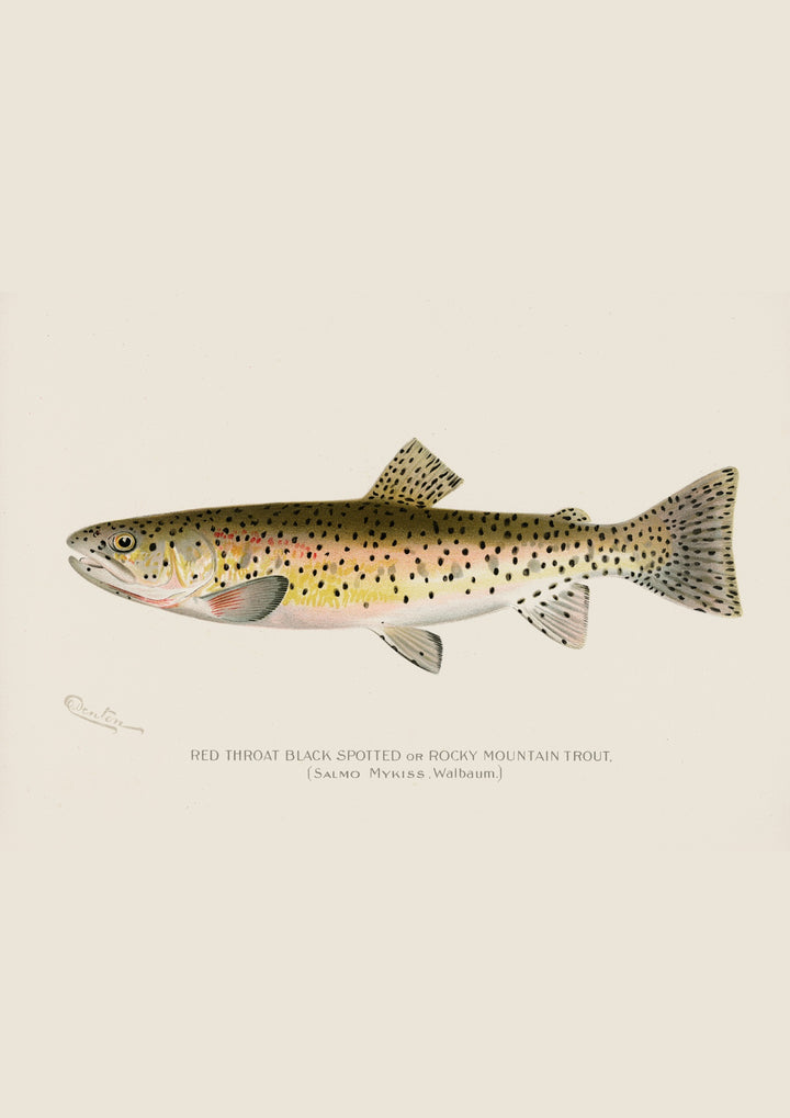 The "Rocky Mountain Trout" poster by Sherman F. Denton features a detailed vintage illustration of the Red Throat Black Spotted Rocky Mountain Trout. Highlighted with fine lines and natural colours, this zoological artwork captures the trout's distinctive markings. Ideal for nature and animal enthusiasts, this portrait poster brings a touch of historical charm to any space.