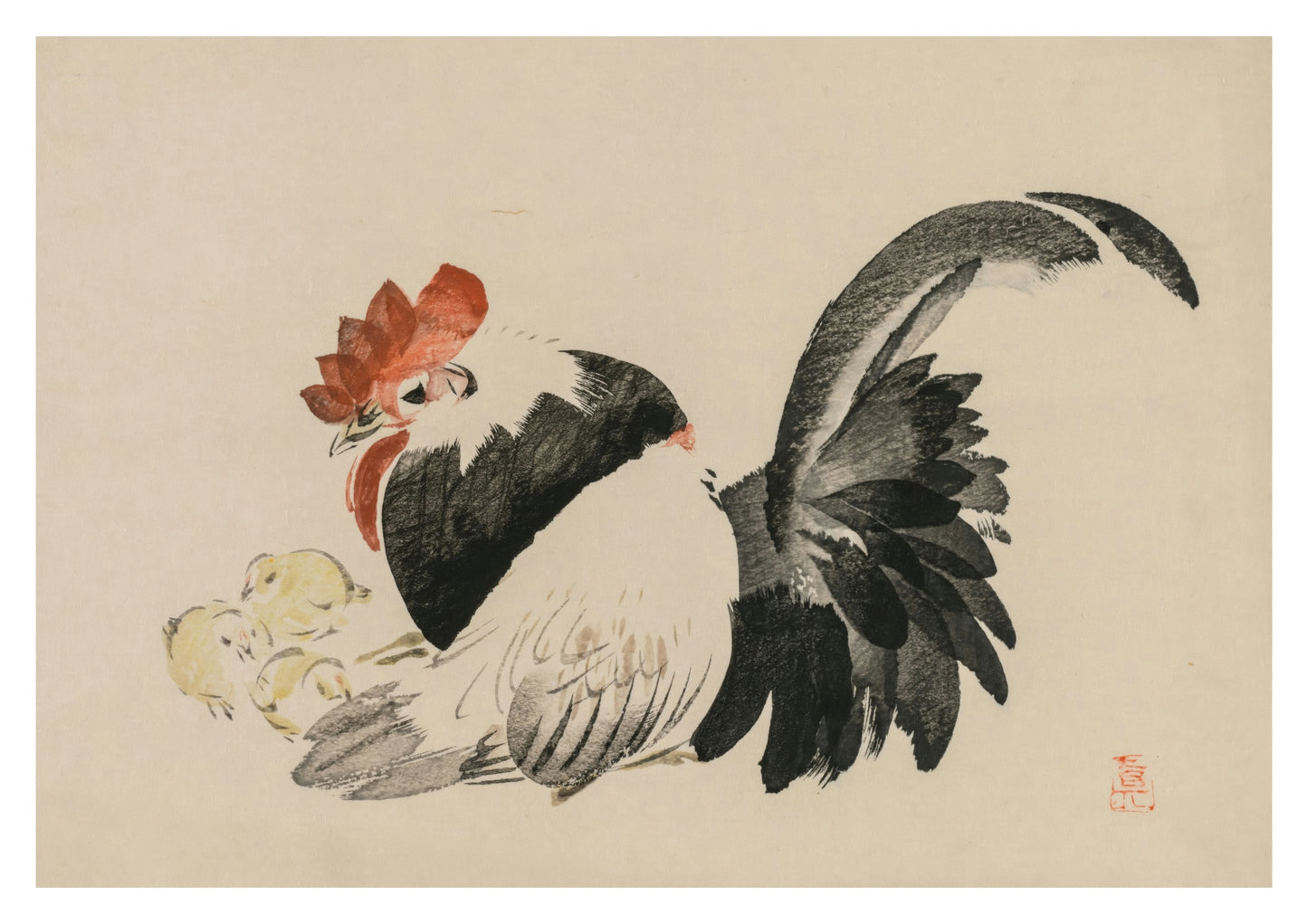 This striking Japanese poster, titled "Rooster, Hen & Chicks," by artist Shibata Zeshin, features a traditional depiction of a detailed rooster, a nurturing hen, and their delicate chicks against a minimalist backdrop. The warm, earthy tones and intricate brushwork highlight a serene family scene, embodying classical Japanese artistry and animal themes in this evocative landscape print.