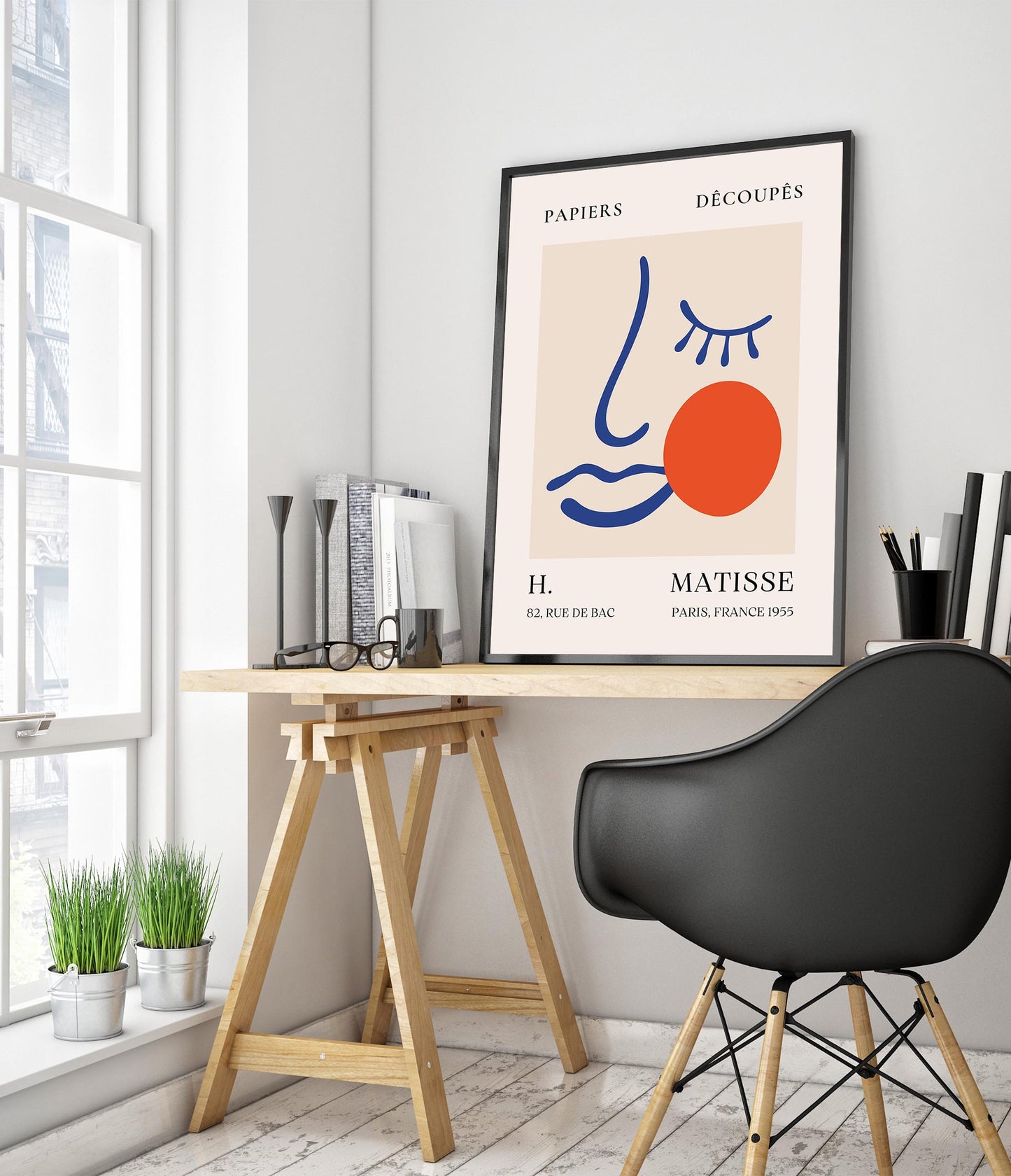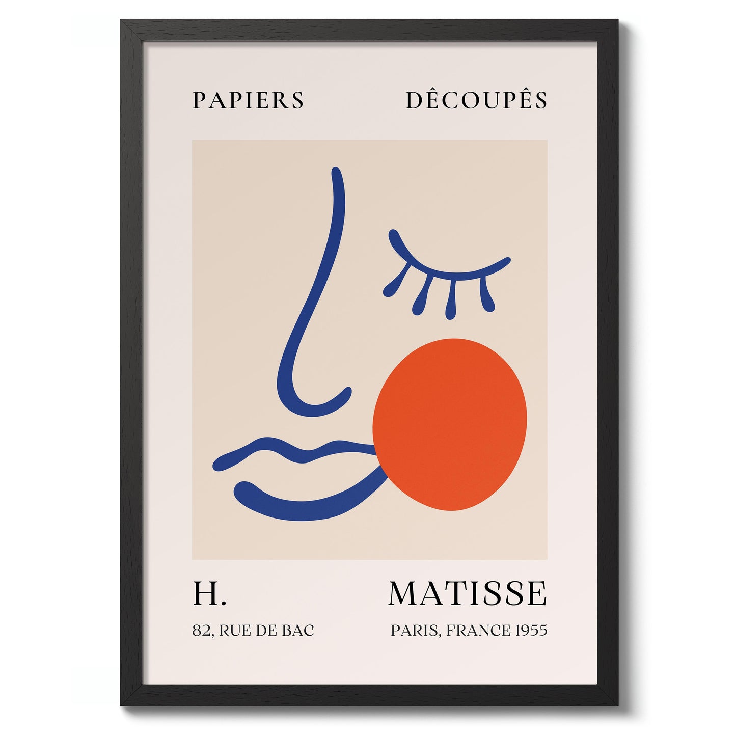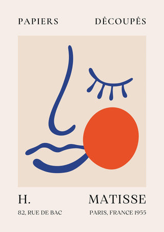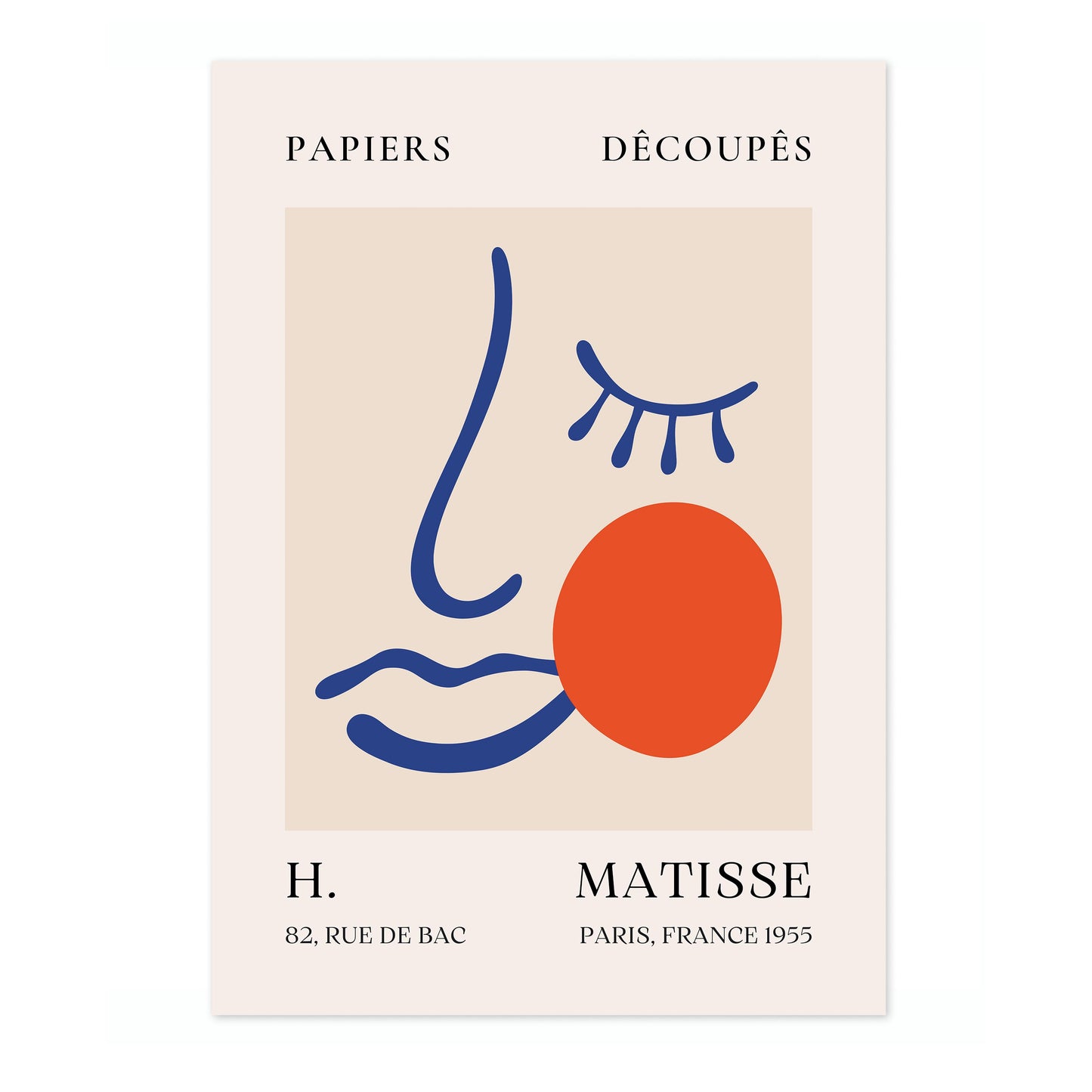 This "Rue de Bac, Papier Découpés" poster by Henri Matisse features minimalistic and abstract graphic elements. A stylized face with bold blue lines, an orange circle, and simplistic forms create a striking composition. Perfect for modern and minimalist decor, this art print is an homage to Matisse's legendary cut-out technique and exemplifies his refined artistic expression.