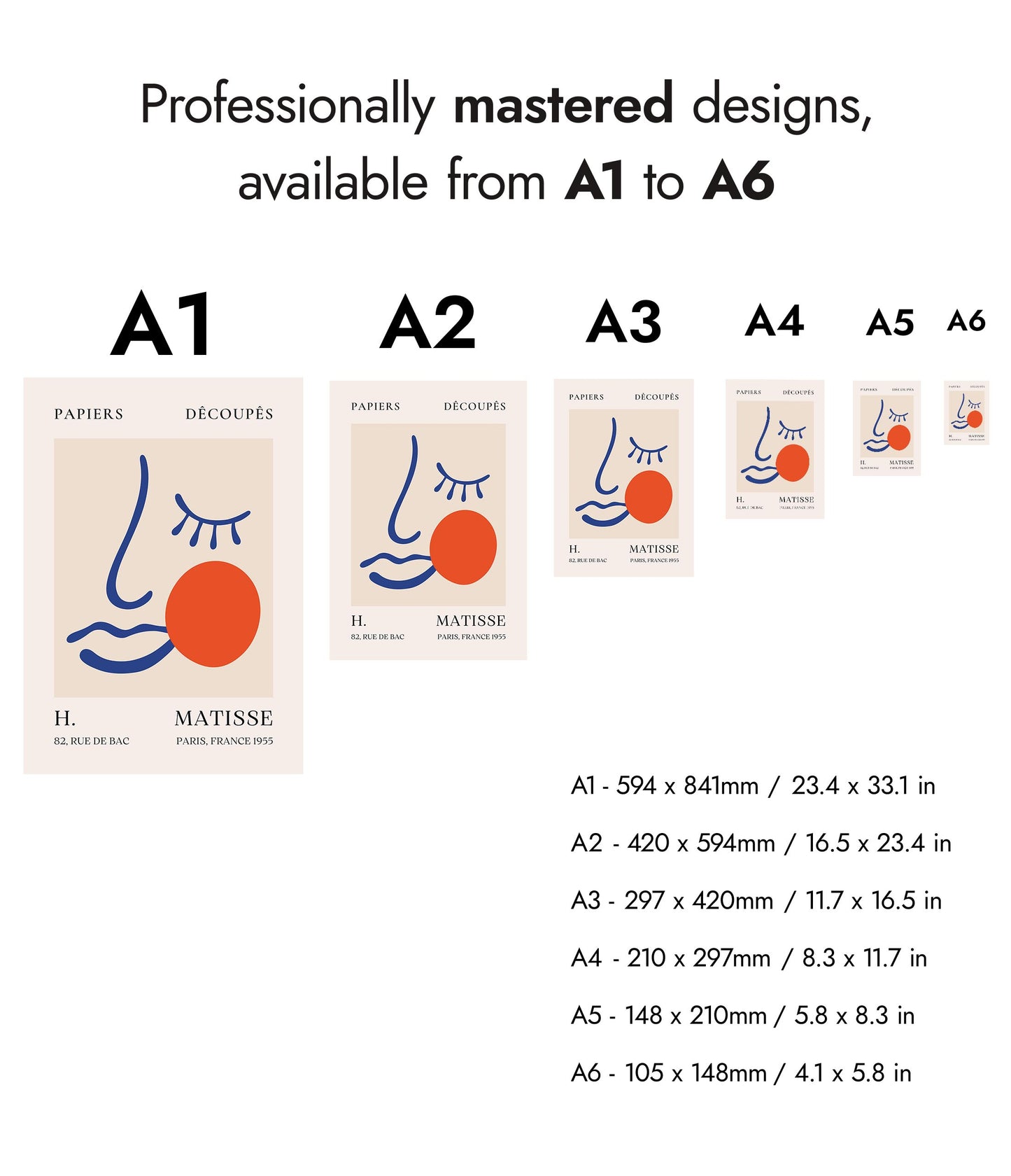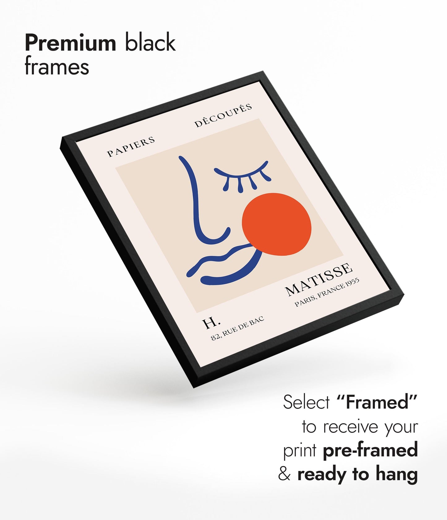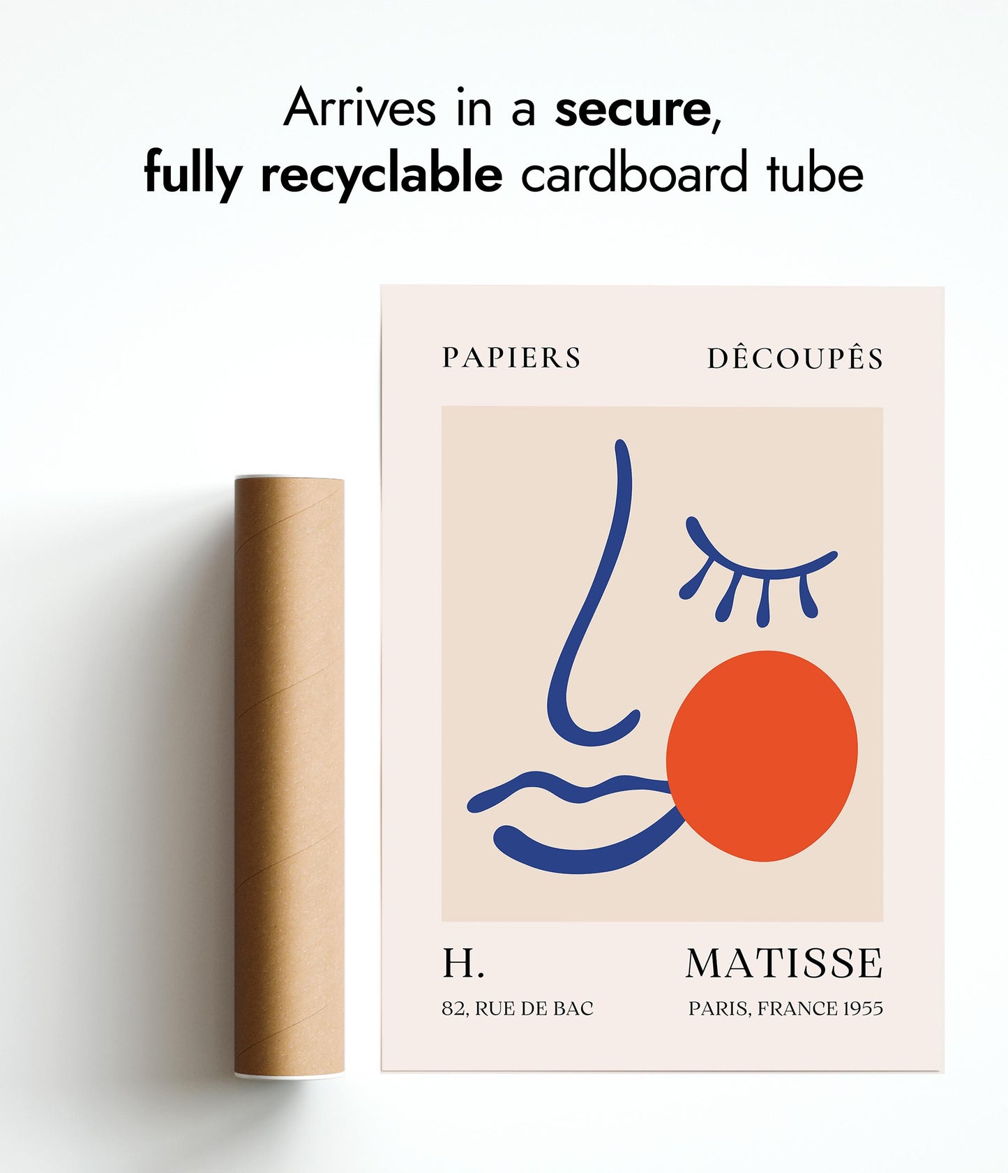 This "Rue de Bac, Papier Découpés" poster by Henri Matisse features minimalistic and abstract graphic elements. A stylized face with bold blue lines, an orange circle, and simplistic forms create a striking composition. Perfect for modern and minimalist decor, this art print is an homage to Matisse's legendary cut-out technique and exemplifies his refined artistic expression.