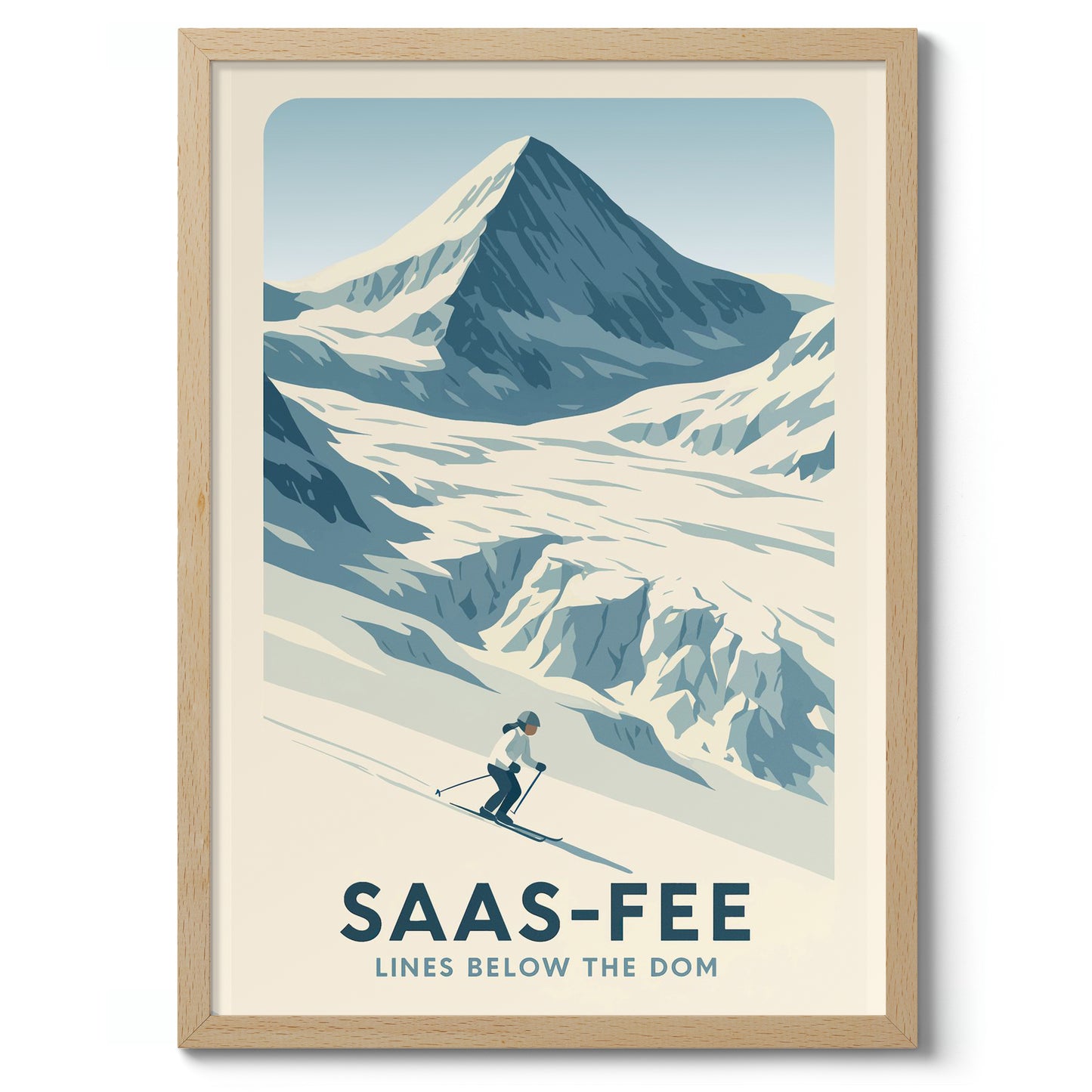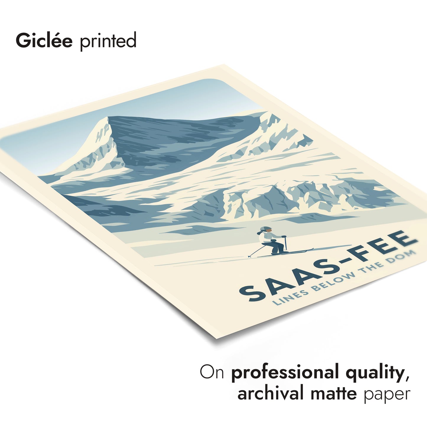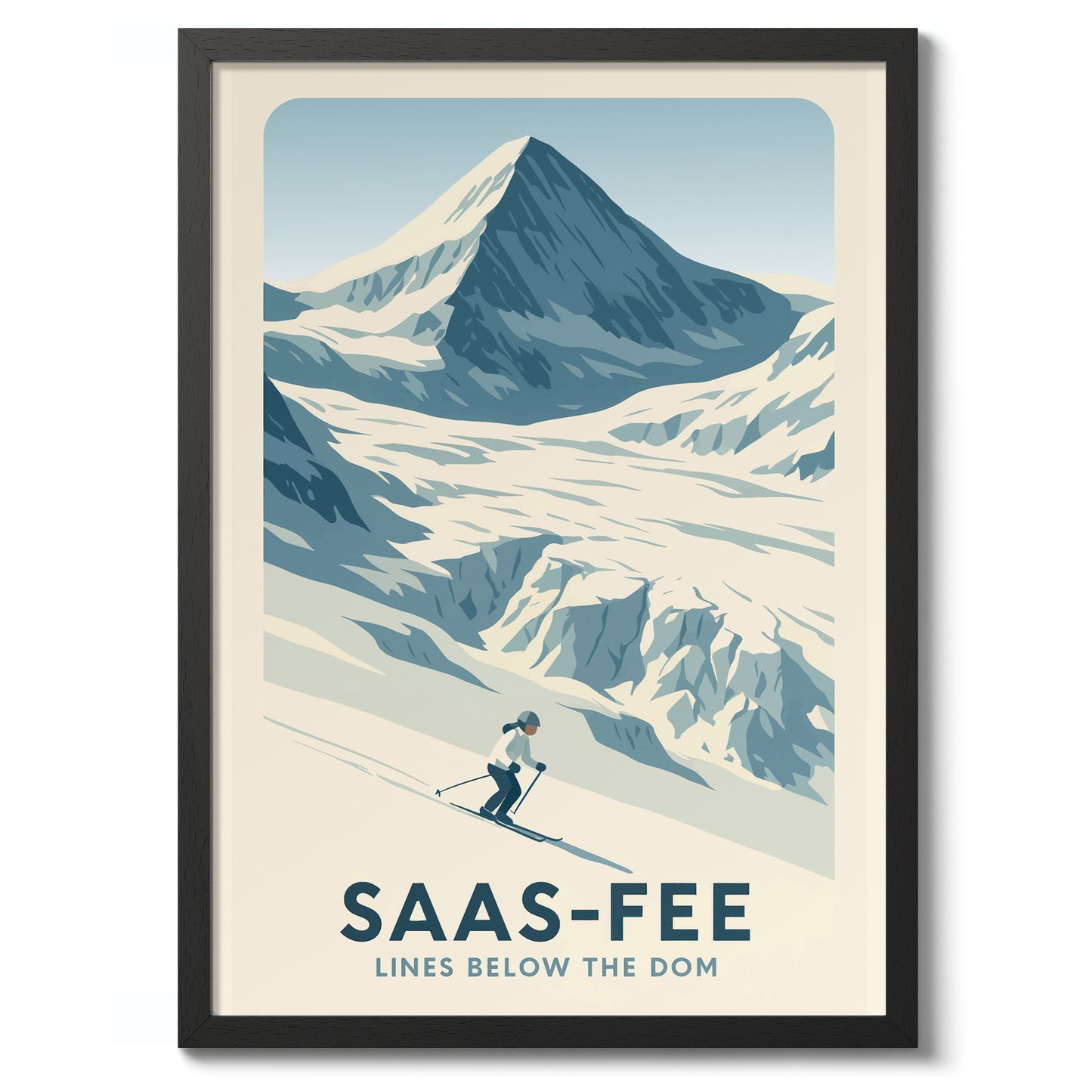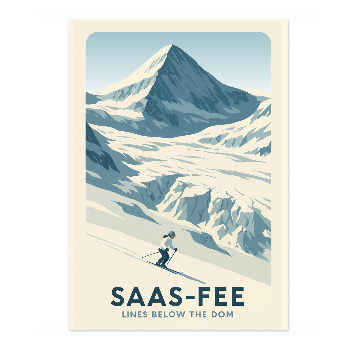 This graphic poster showcases a skier carving down the snowy slopes of Saas-Fee, with the majestic Swiss mountain Dom as a backdrop. The simplistic, yet captivating style emphasizes the rugged beauty and allure of this pristine winter environment, inviting admiration from ski enthusiasts and nature lovers. Perfect for adding a touch of adventure to any space.