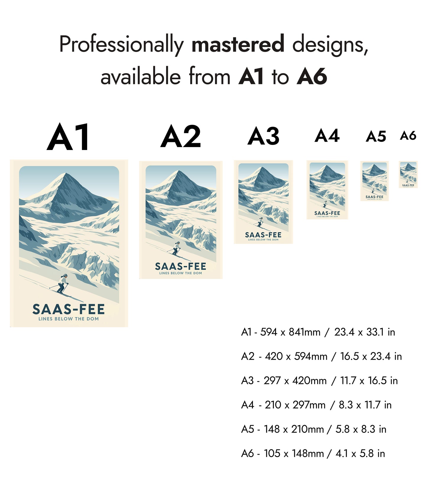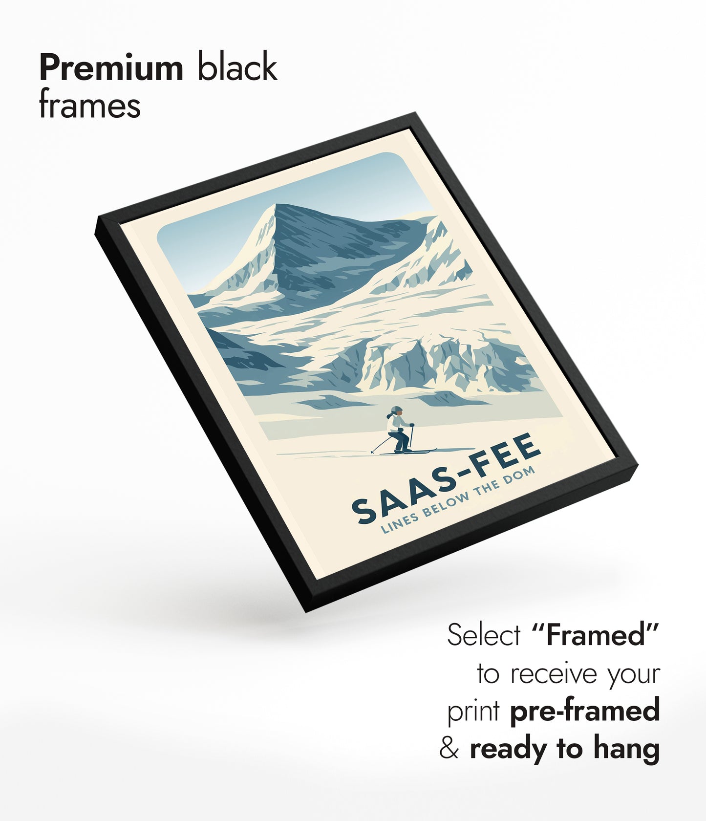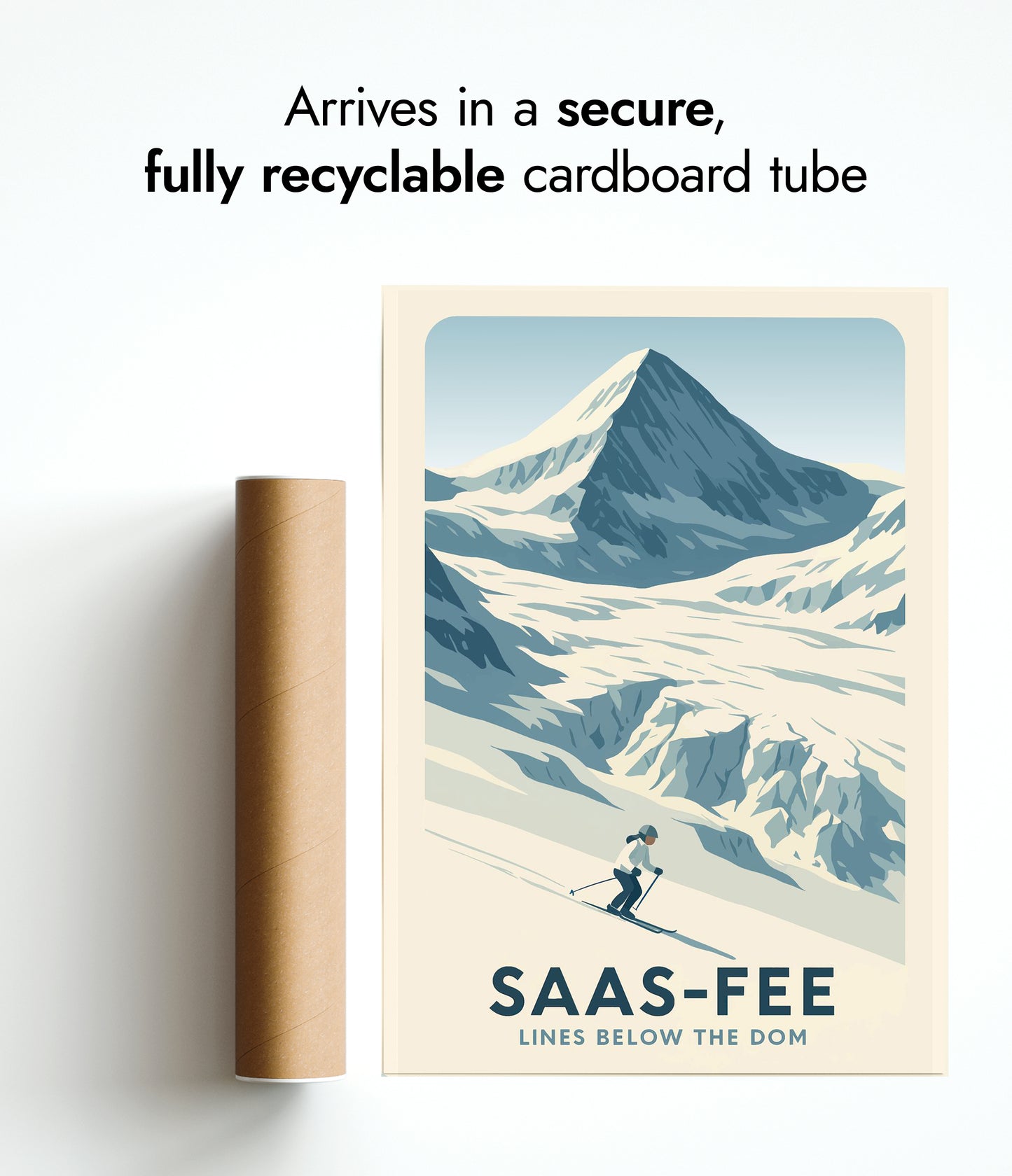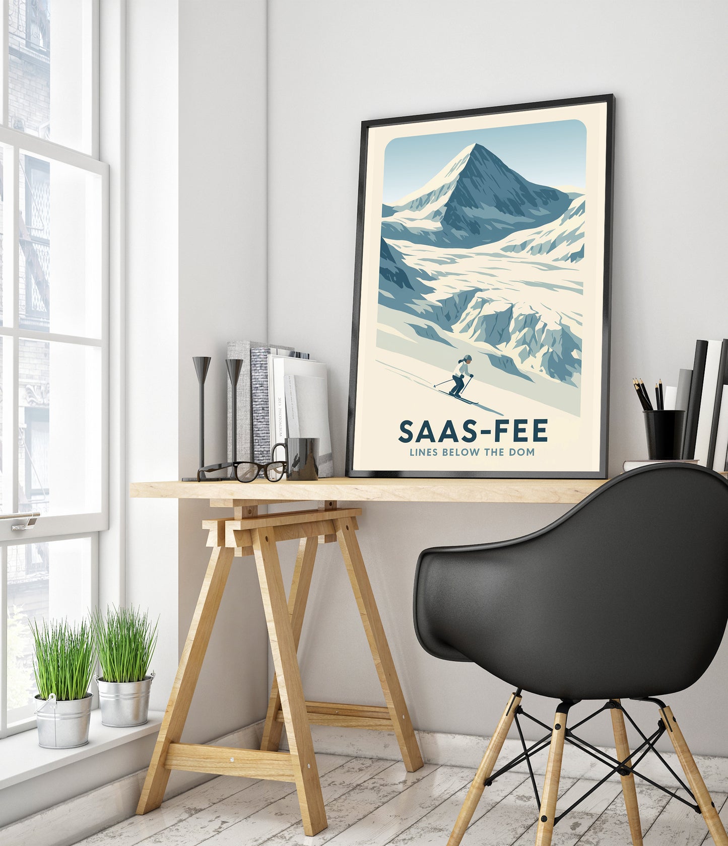 This graphic poster showcases a skier carving down the snowy slopes of Saas-Fee, with the majestic Swiss mountain Dom as a backdrop. The simplistic, yet captivating style emphasizes the rugged beauty and allure of this pristine winter environment, inviting admiration from ski enthusiasts and nature lovers. Perfect for adding a touch of adventure to any space.