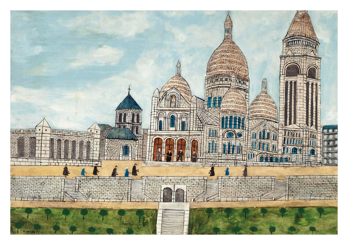 This poster, titled "Sacré Coeur II" by Louis Vivin, depicts the iconic Basilica of the Sacré-Cœur in Paris, France. Rendered in a naïve, primitivist style, the artwork captures the church’s detailed architecture against a serene sky. The lush green foreground complements the intricate design of the building, making it a striking piece for those who appreciate urban landscapes and historic architecture.