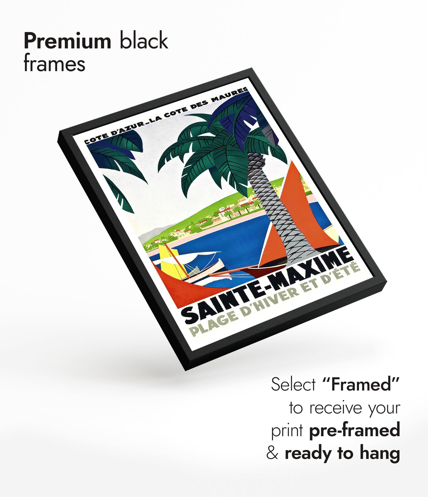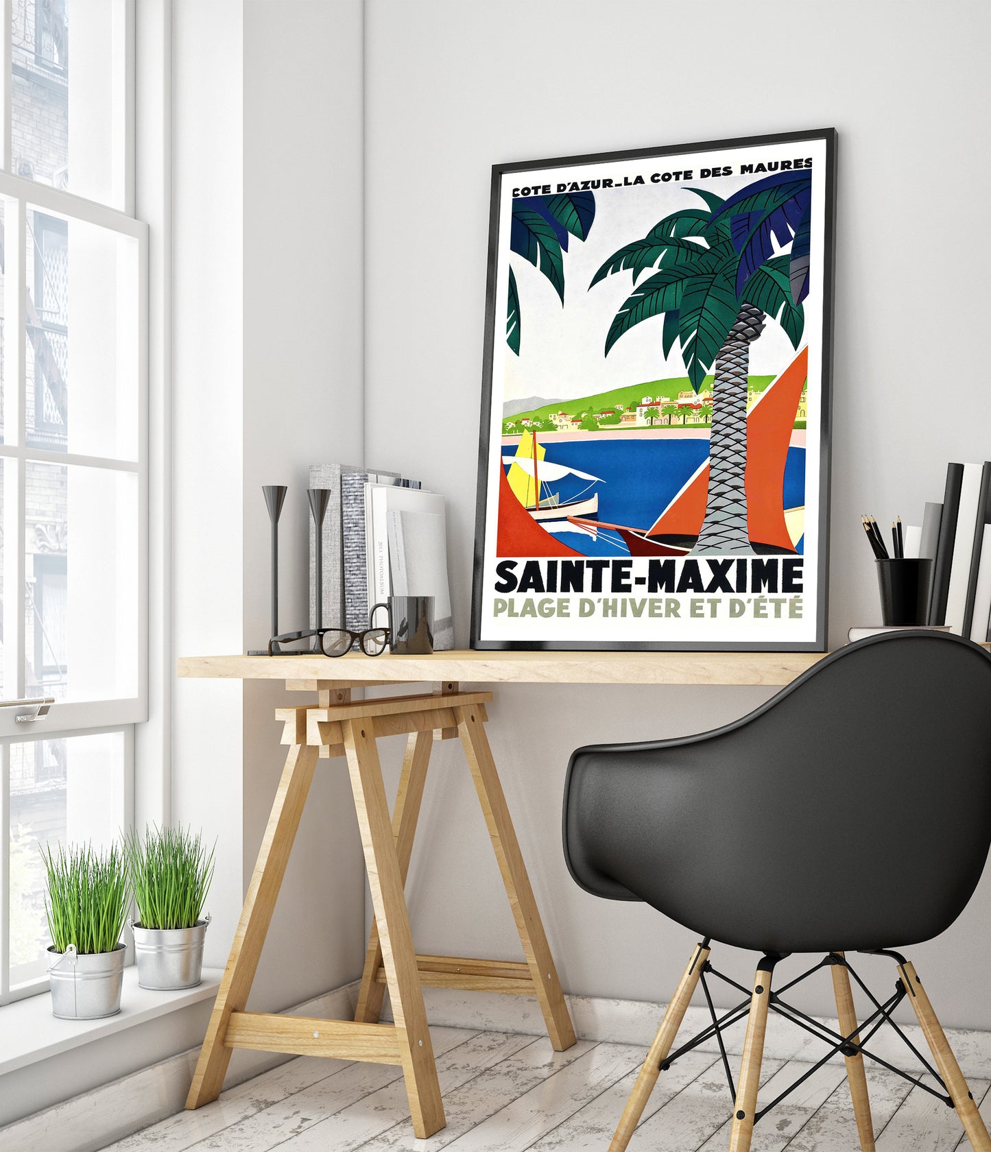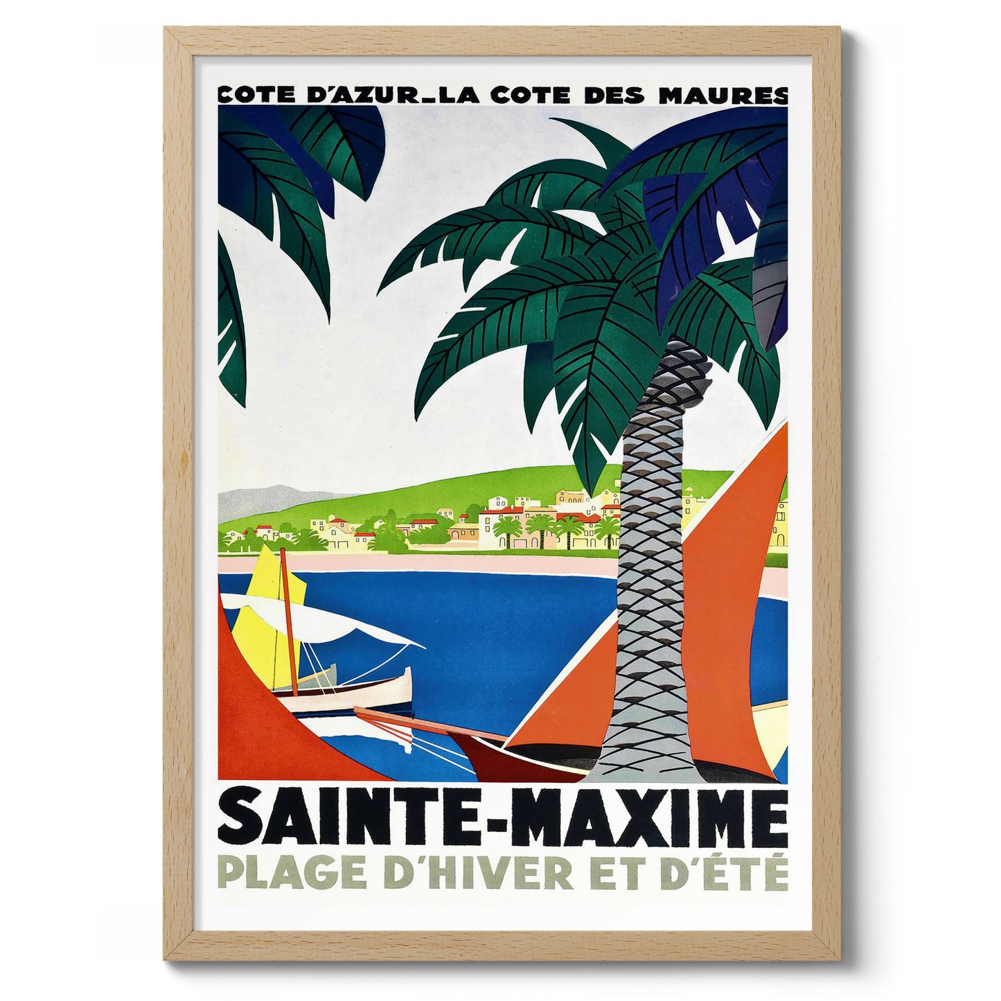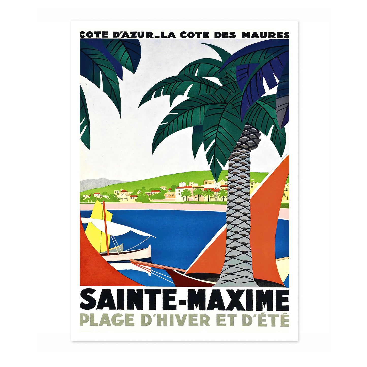 This vintage travel poster of Sainte-Maxime on the Cote D'Azur captures a vibrant Mediterranean scene with lush palm trees, colorful sailboats, and a distant village amidst rolling hills. Dominated by green and red hues, the illustration evokes a sense of coastal charm and leisurely beach life. Ideal for enthusiasts of vintage French travel art and Mediterranean landscapes.